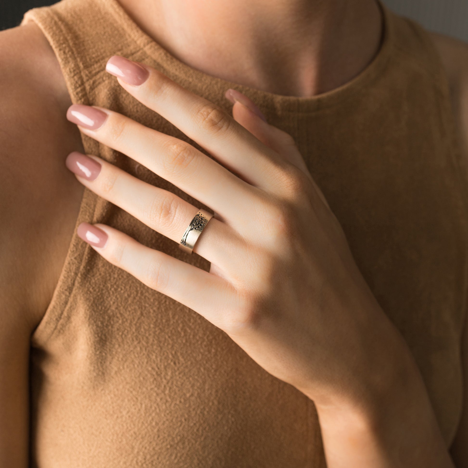 Lebensbaum: Halbe — Ehering aus Weißgold, überzogen mit schwarzem Rhodium