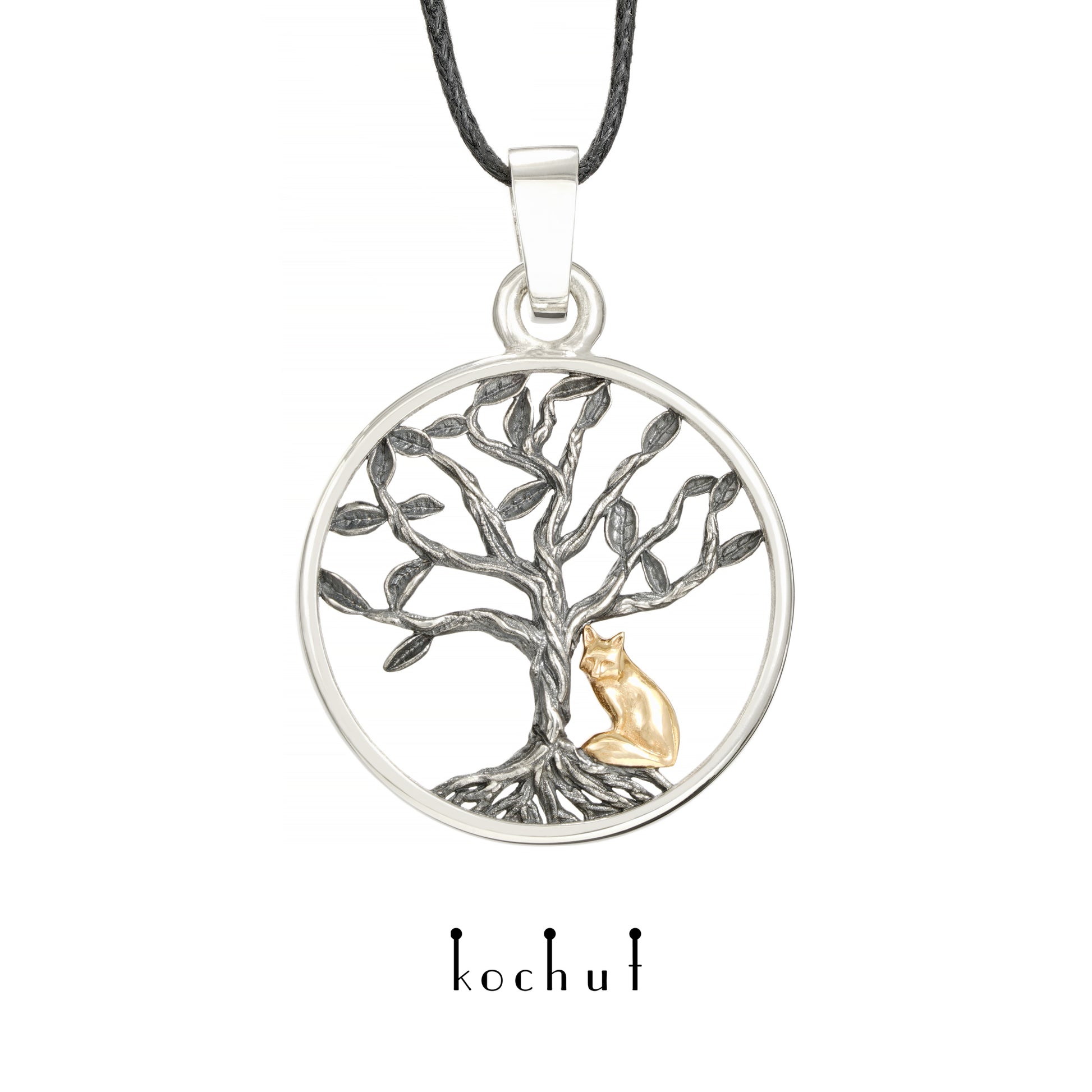 Lebensbaum mit kleinem Fuchs — Anhänger aus oxidiertem Silber und Rotgold
