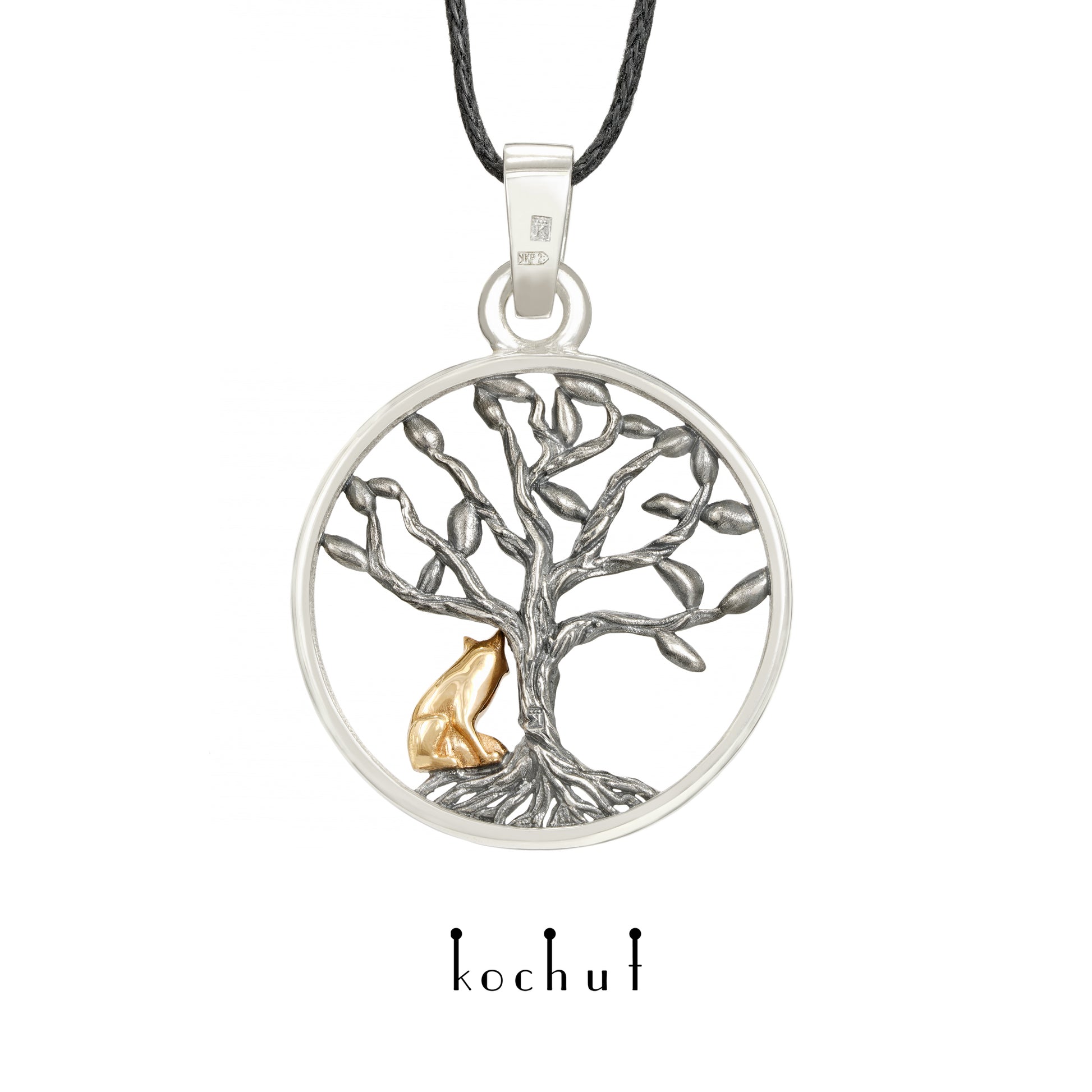 Im Schatten des Baumes lauert eine kleine Kreatur — ein exquisiter roter Fuchs, dessen rotes Fell einen starken Kontrast zu den silbrigen Tönen des Stücks bildet. Der Anhänger wurde aus Silber gefertigt, und der Fuchs aus Rotgold.