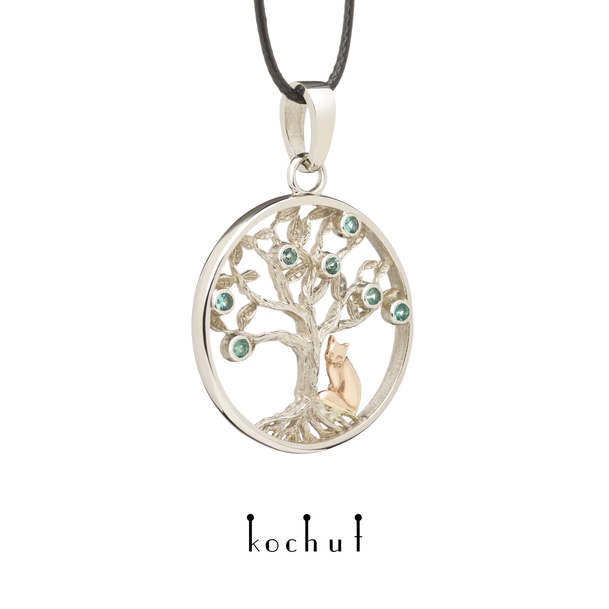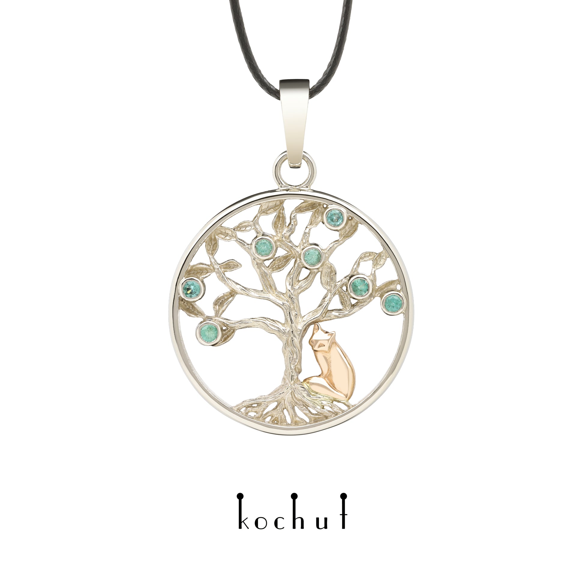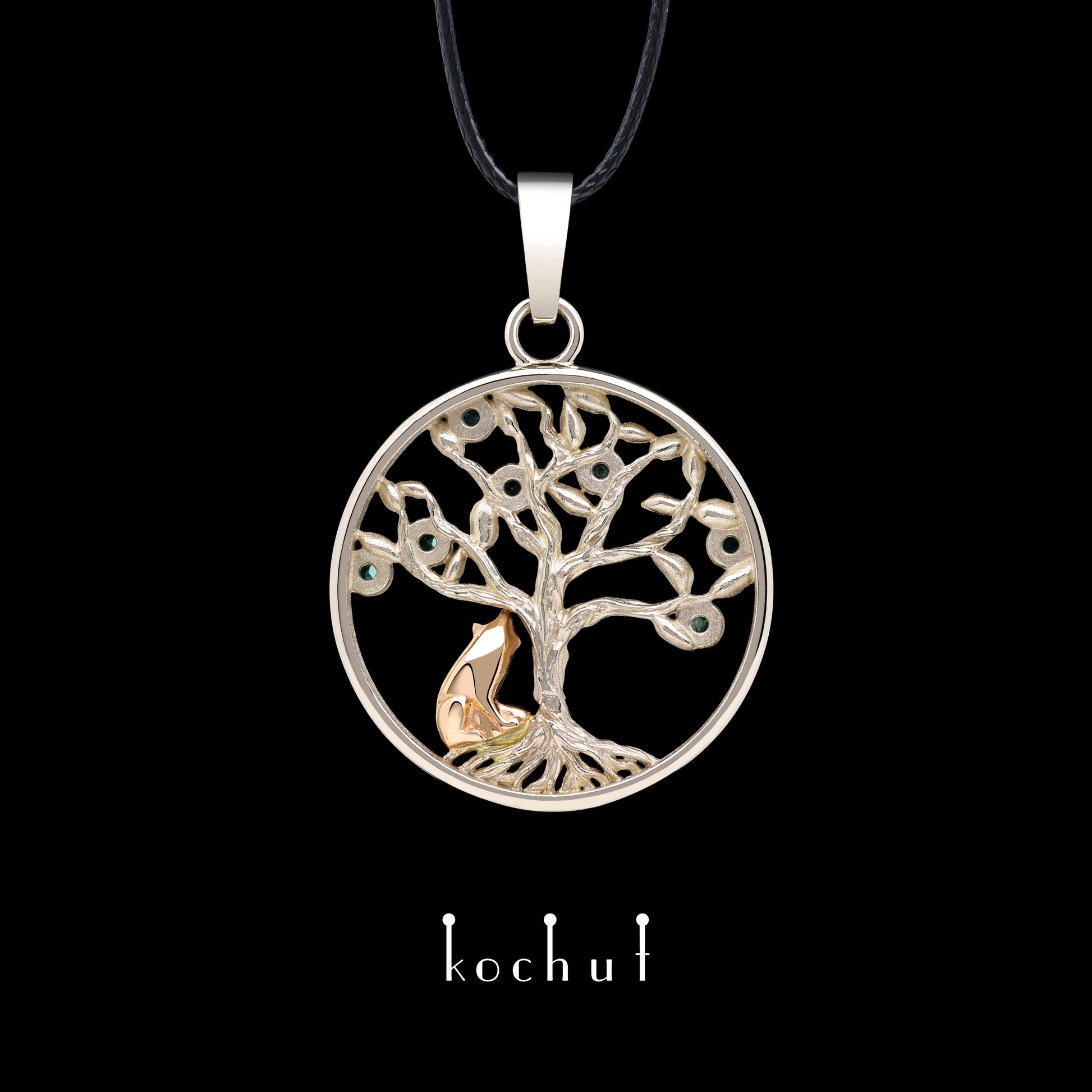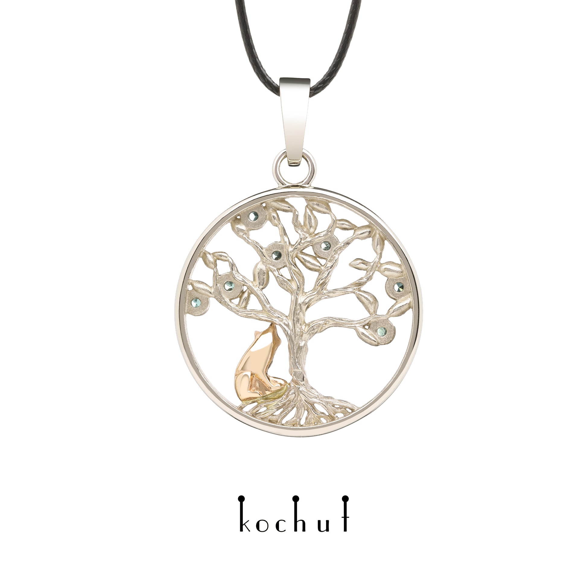 Der Anhänger beherbergt ein ganzes Gemälde. Der goldene Baum wächst und streckt sich in voller Höhe innerhalb des Kreises, und spiegelt perfekt die Formen und Linien eines echten Baumes im Waldreich wider. Unter dem Baum ruht ein kleiner Fuchs in einem roten Mantel. Er hat im Schatten des riesigen blühenden Baumes Platz genommen, um die Ruhe des Abendsonnenuntergangs zu contemplieren. Das Spiegelbild eines grünen Ozeans ist in seinen Augen sichtbar.