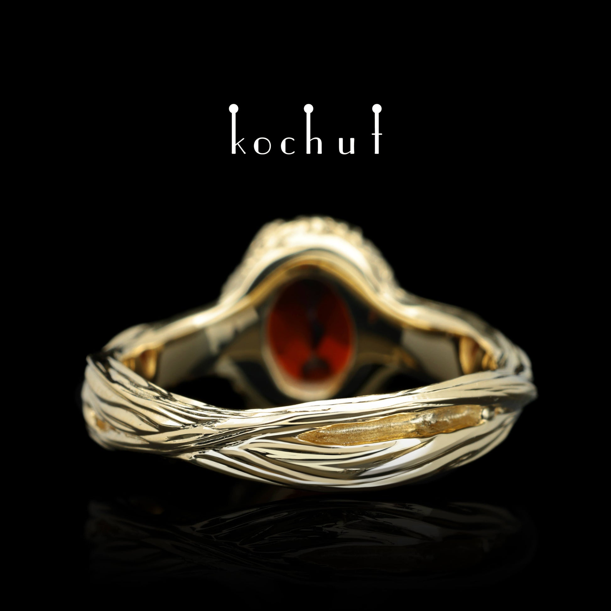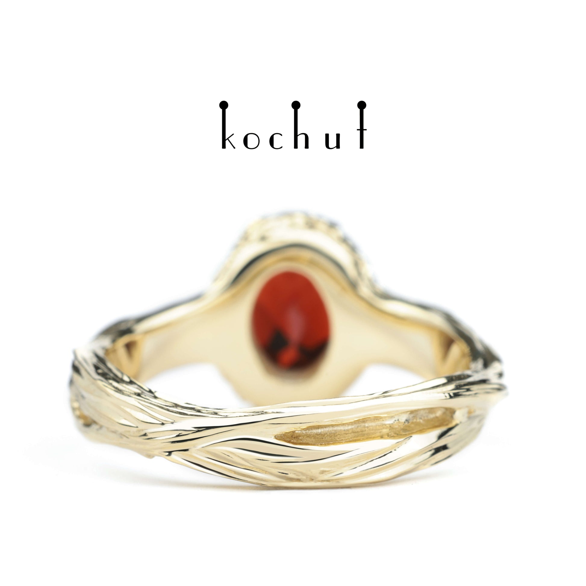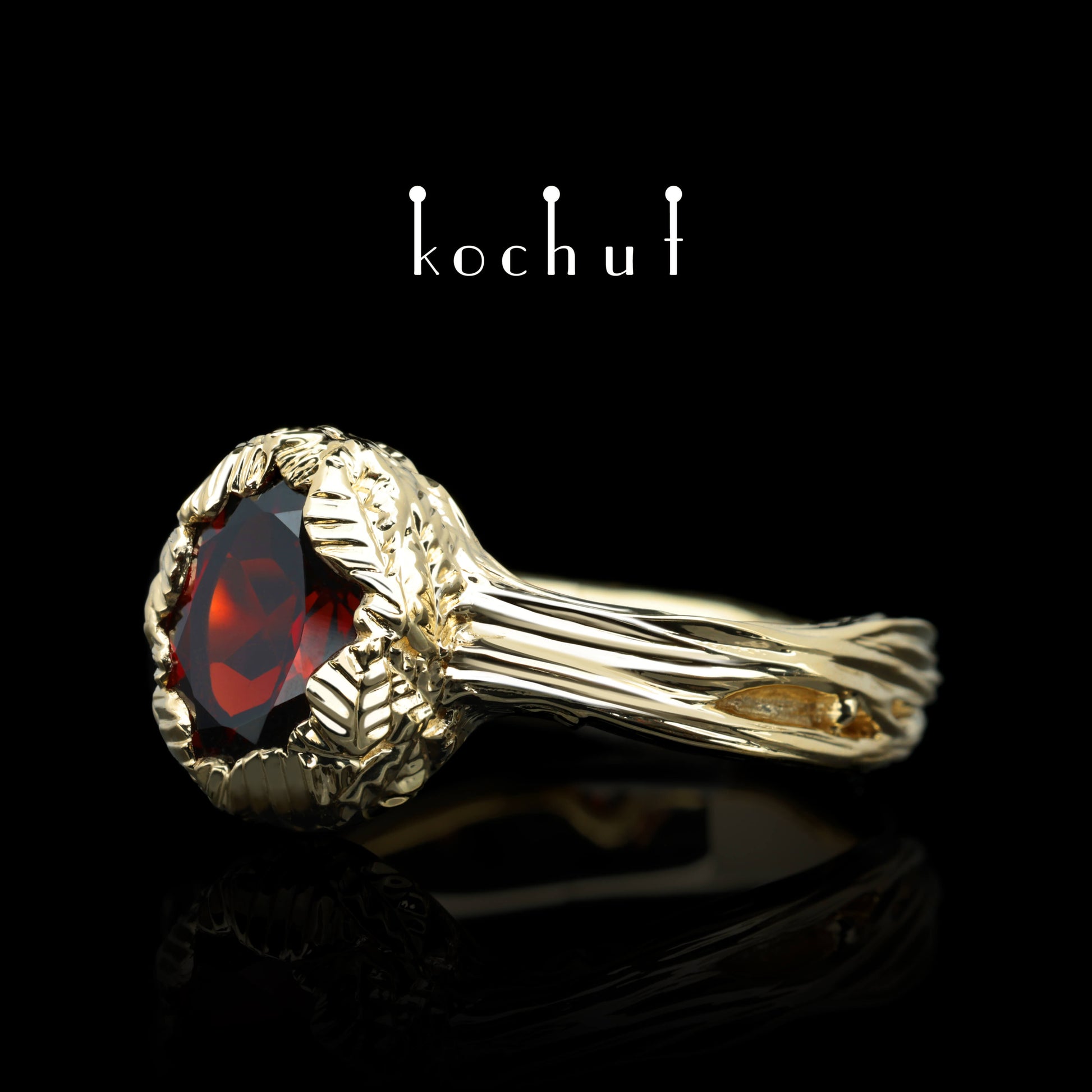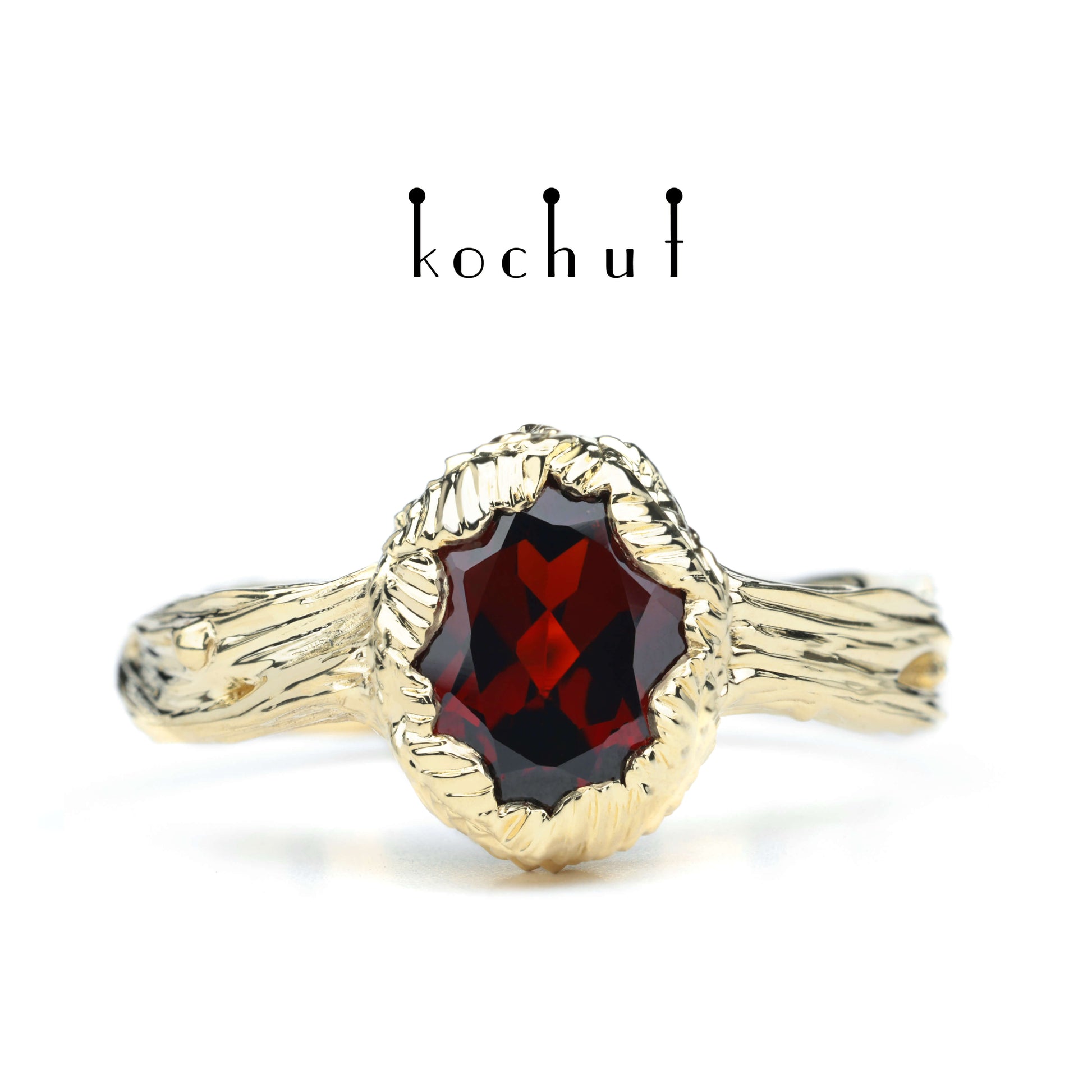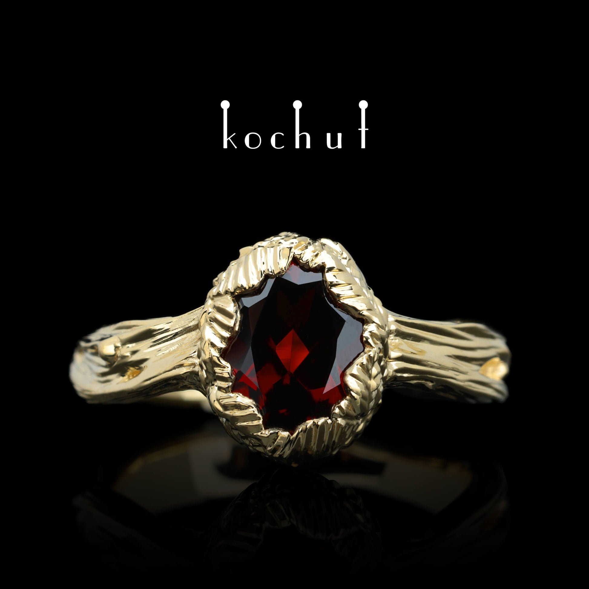 Äußerlich zeigt sich dies in unserer gleichnamigen Kollektion — „Quelle des Lebens“, mit einem unglaublich schönen Goldring in originalem Design und Holzstruktur. Ein karminroter Granat schmückt die floralen Linien des Rings mit einem Tropfen der Morgendämmerung.