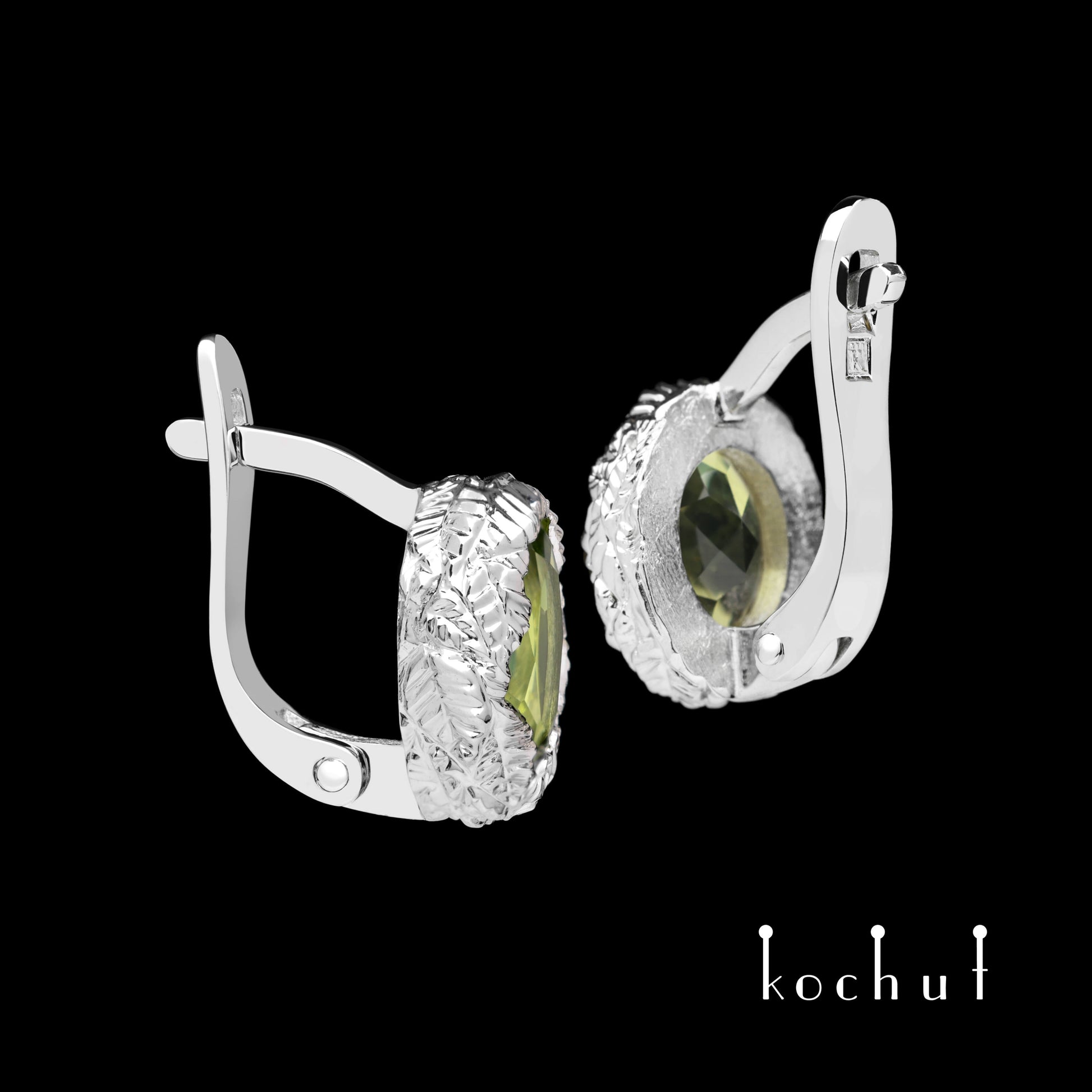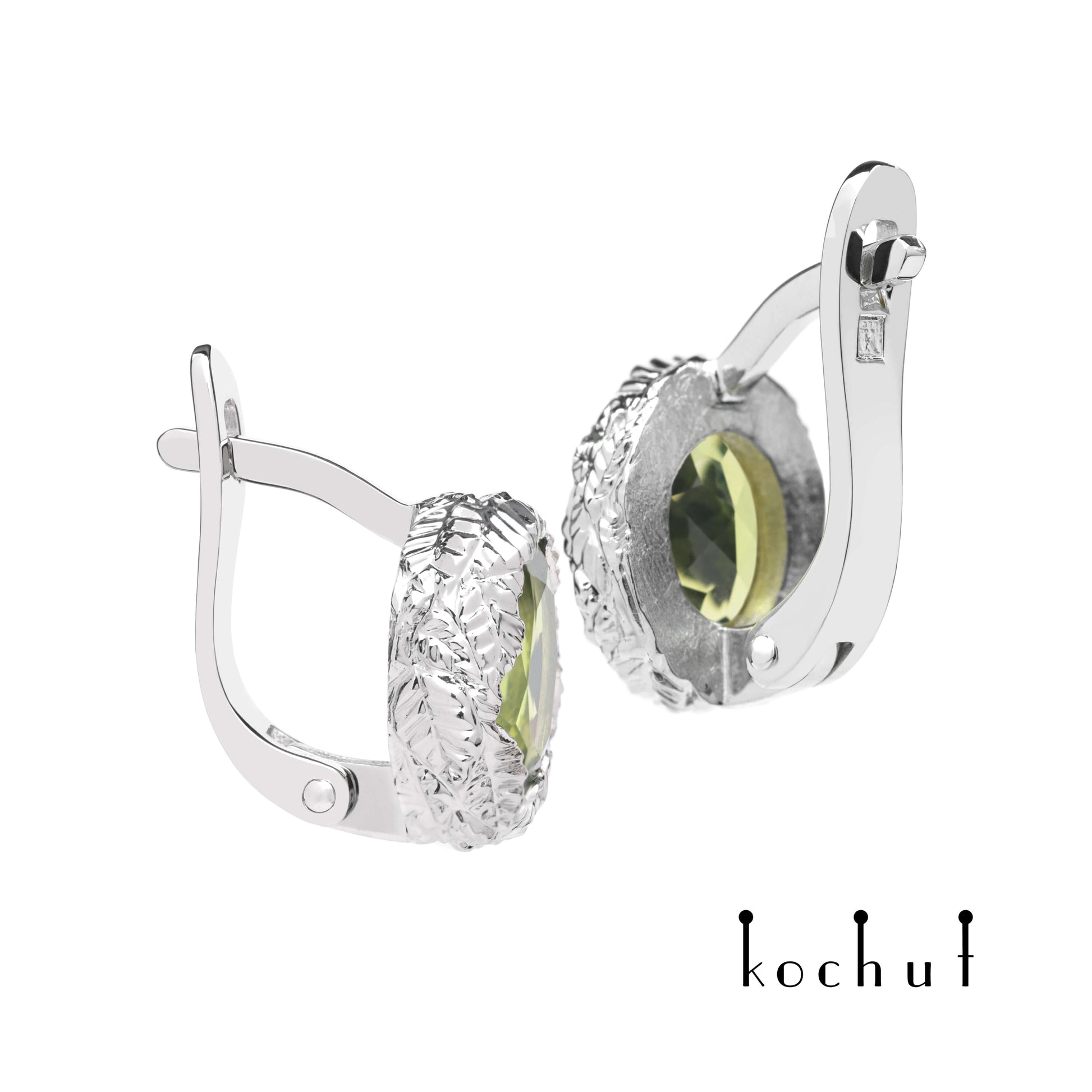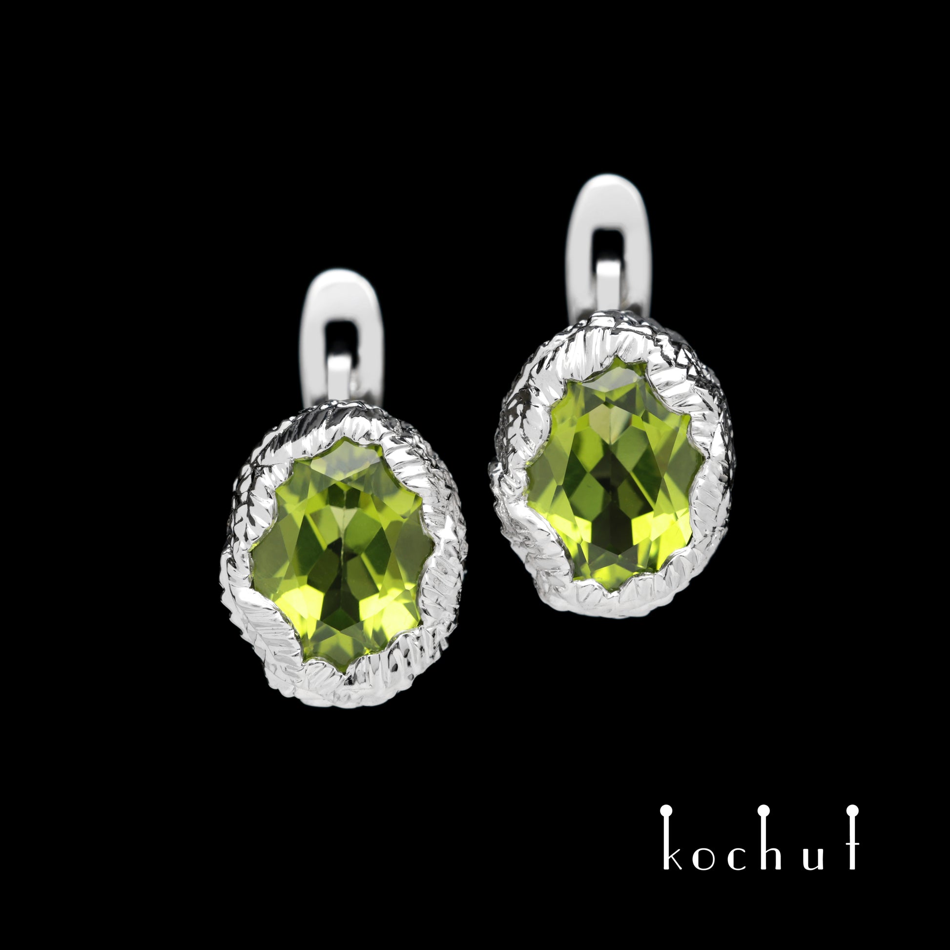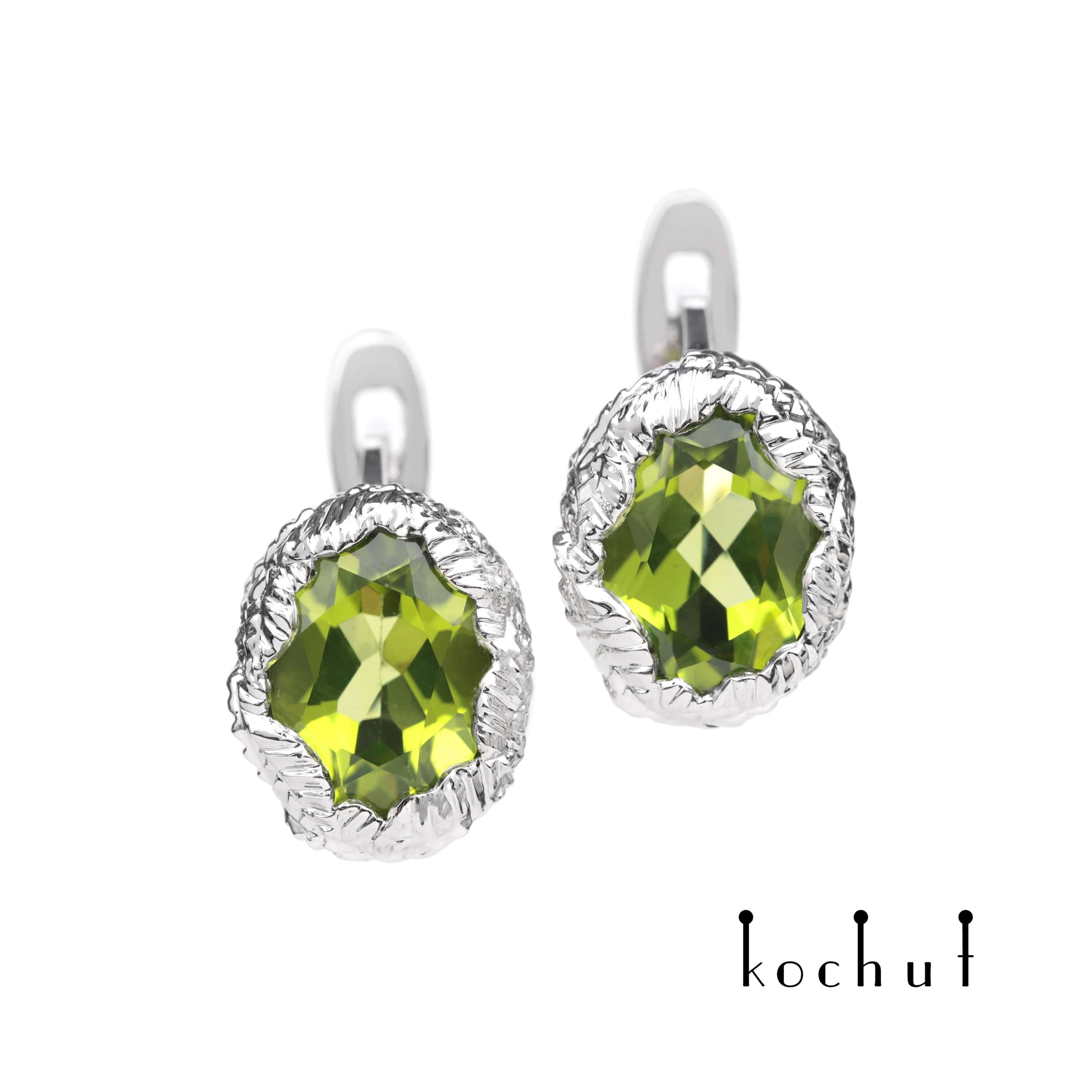 Lebensquelle — Ohrringe aus Weißgold mit Chrysolithen, beschichtet mit weißem Rhodium