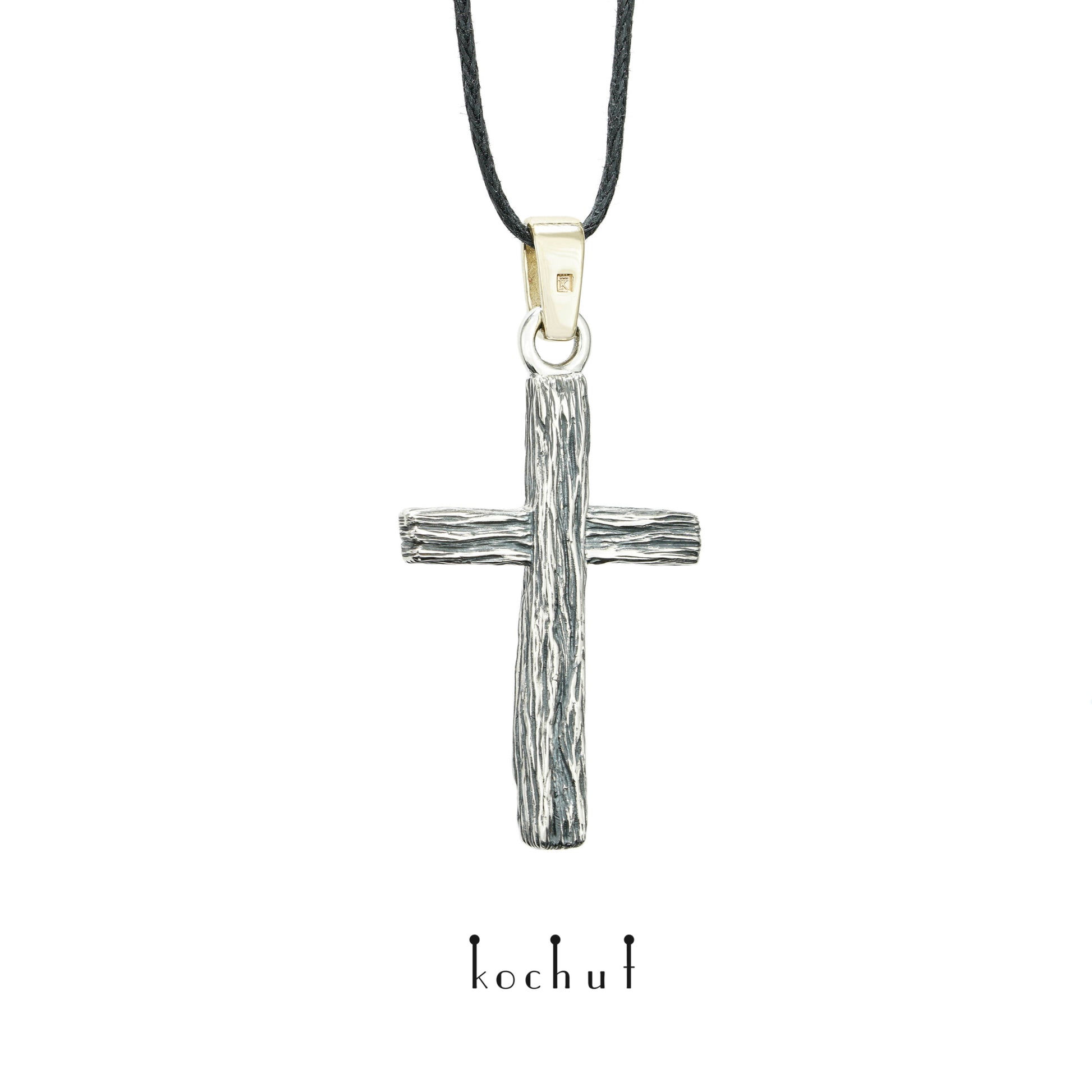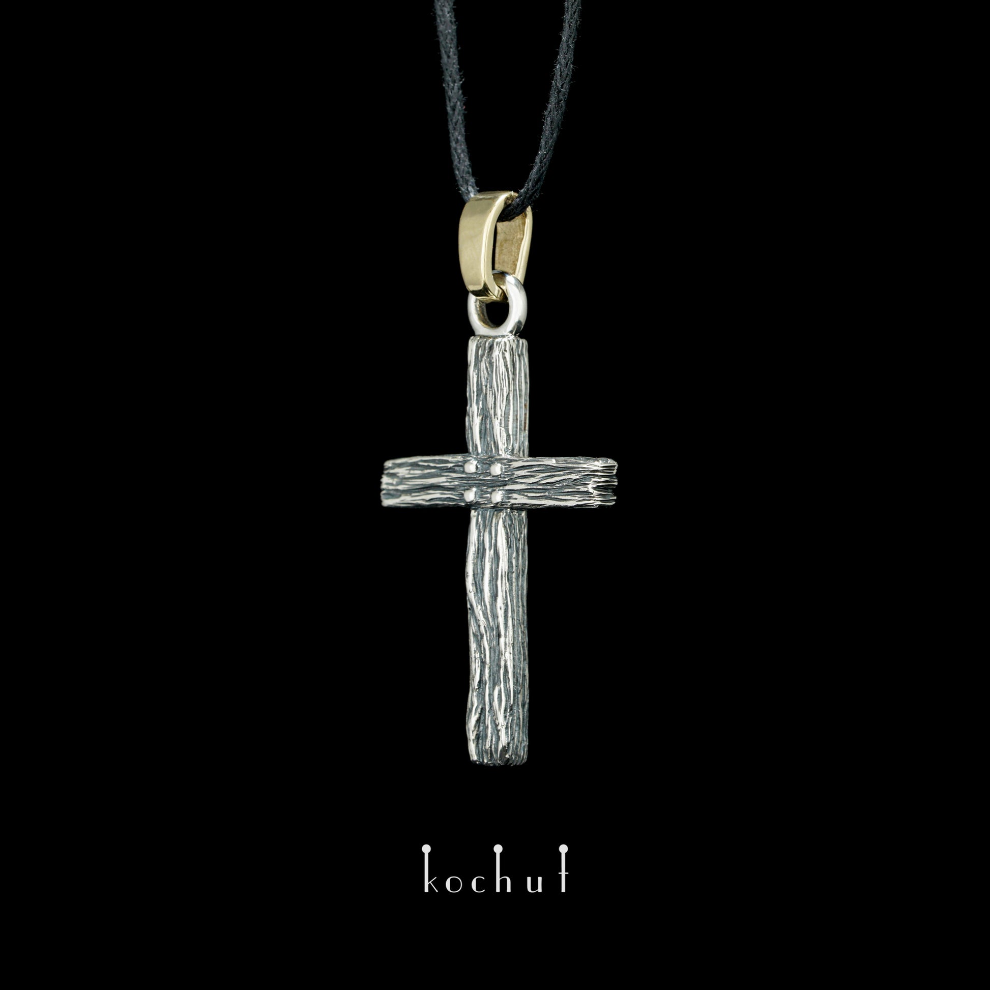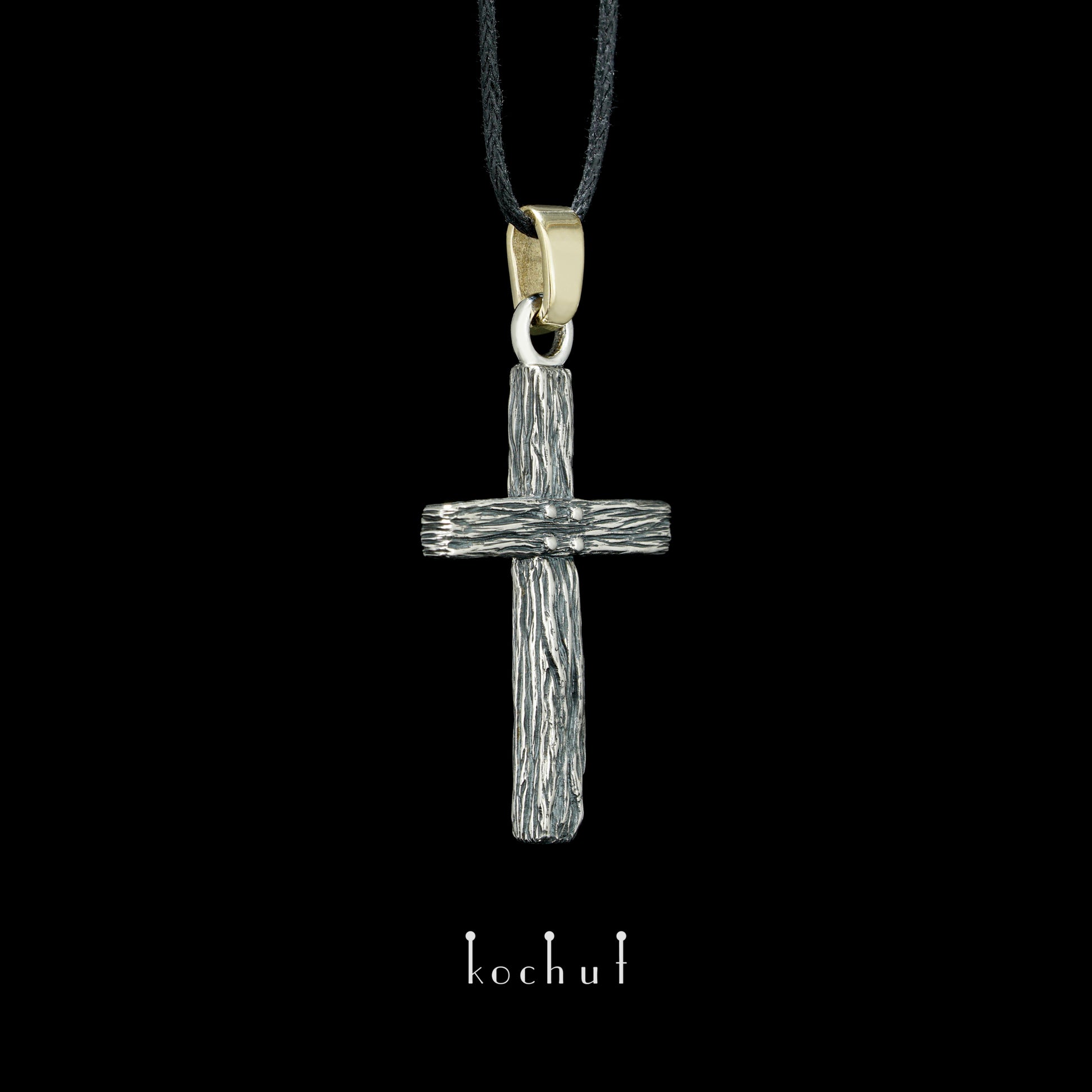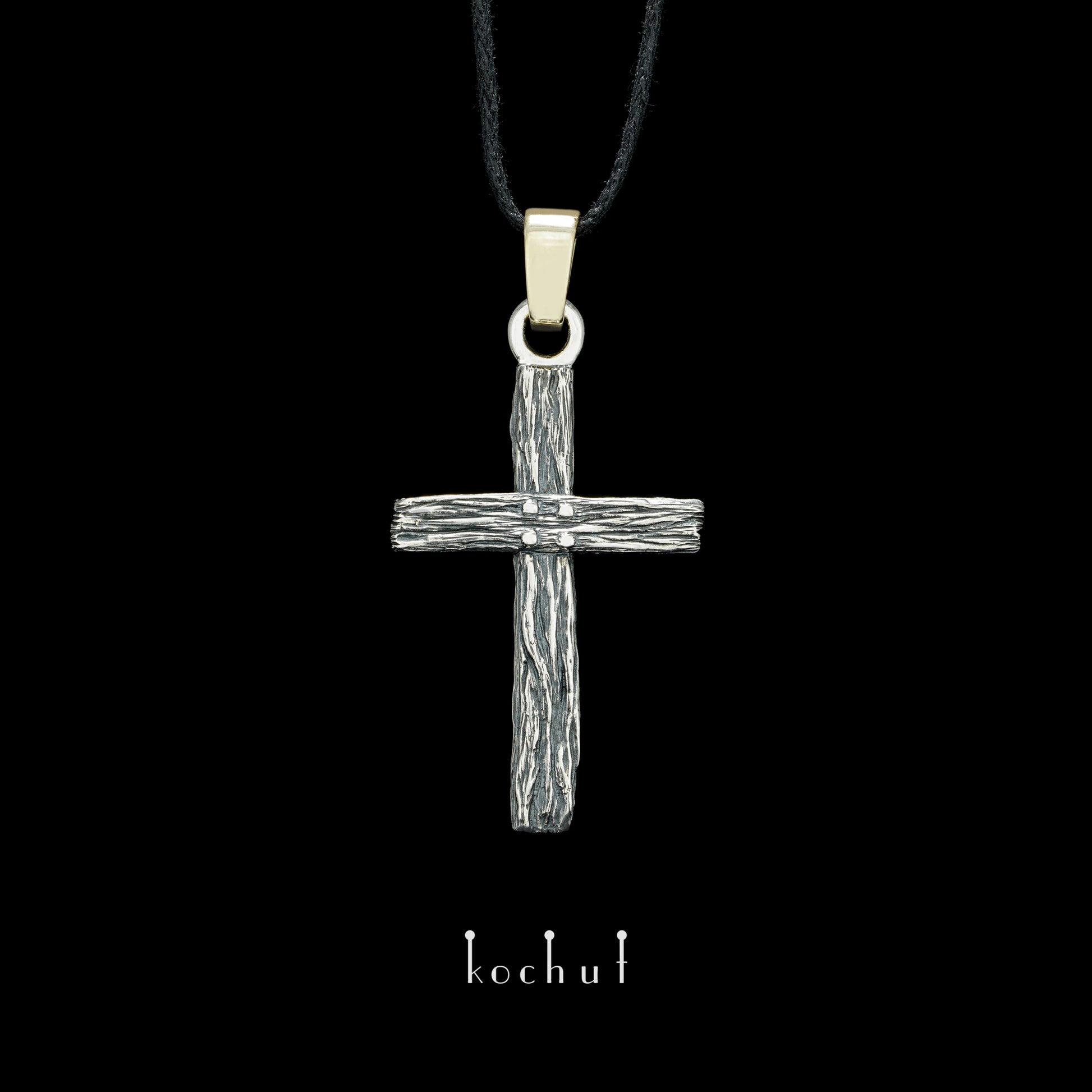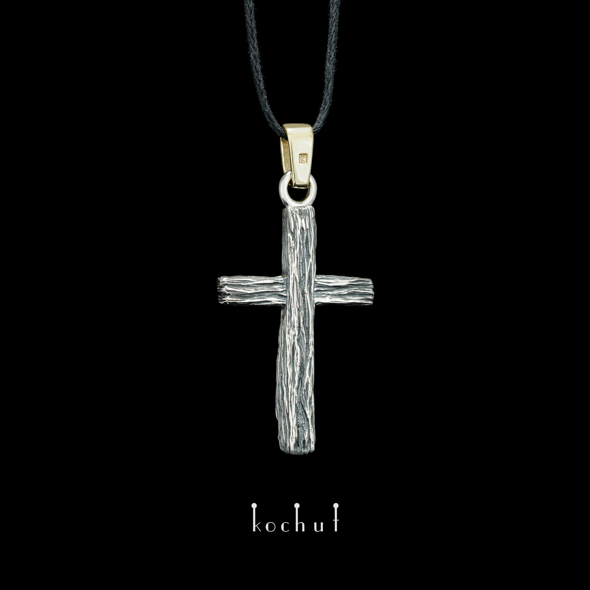 Das Kreuz ist vollständig aus Silber gefertigt. Die ursprüngliche Oberflächenstruktur ähnelt Baumrinde, und das Auge des Kreuzes ist aus Gelbgold. Es sieht nicht nur als Symbol des Glaubens großartig aus, sondern auch als elegantes Schmuckstück für sich.