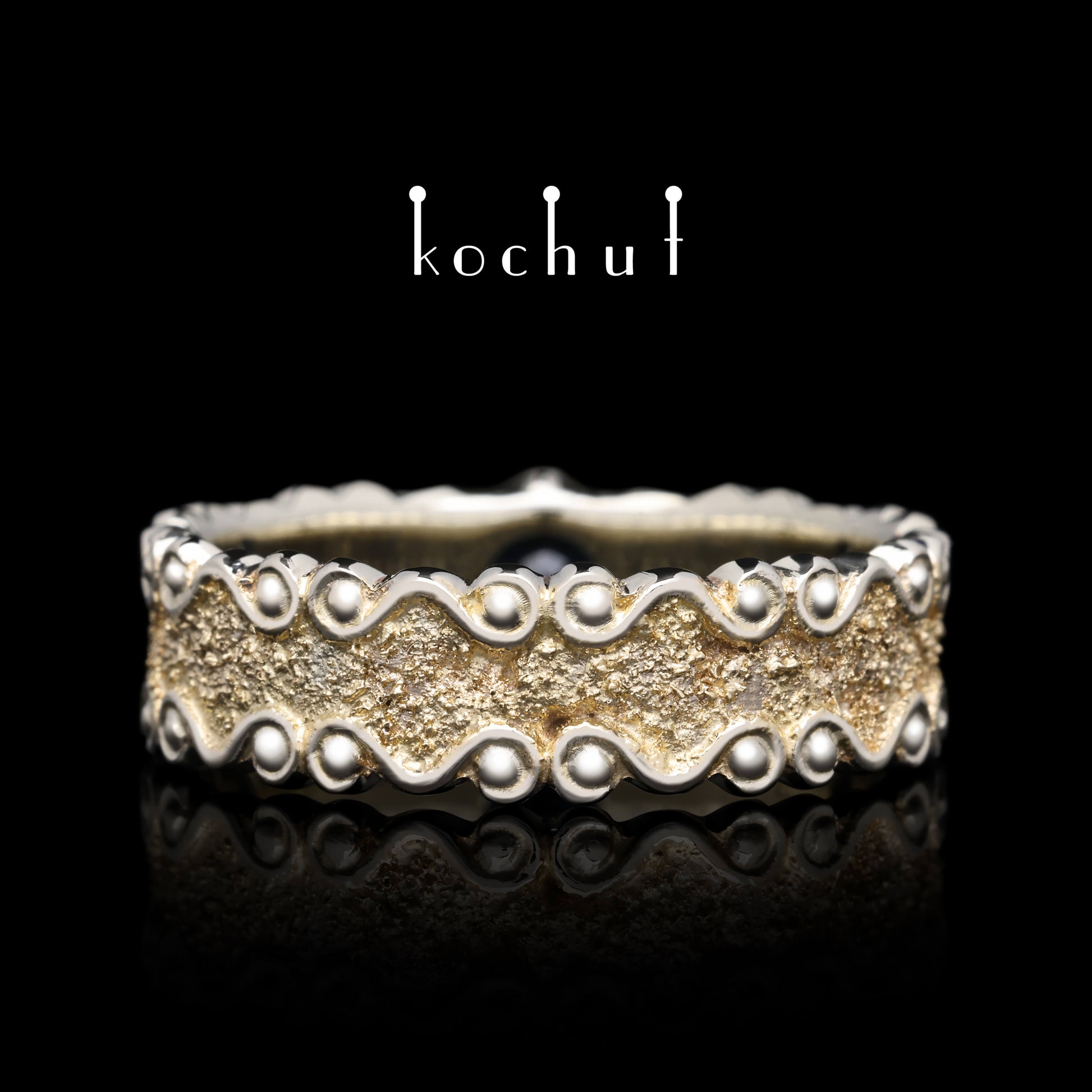 Die filigranen Kanten des Rings erinnern an eine Krone und gleichzeitig an teuren Spitzenstoff von Vintage-Kleidern. Das Gelbgold-Legierung auf der Oberfläche verleiht dem Schmuck noch mehr Strahlkraft und Chic. Und die magischen Granate funkeln mit königlicher Pracht.