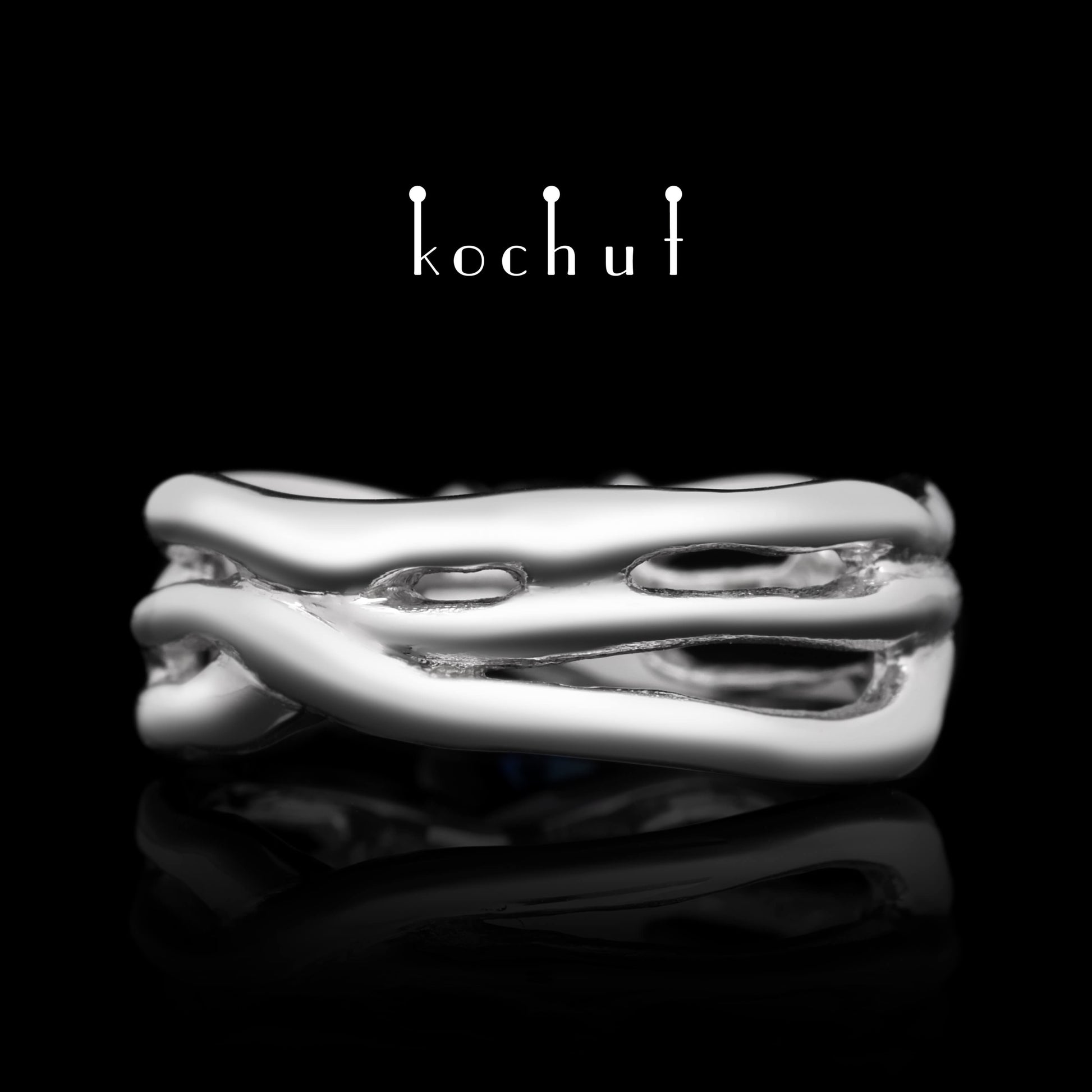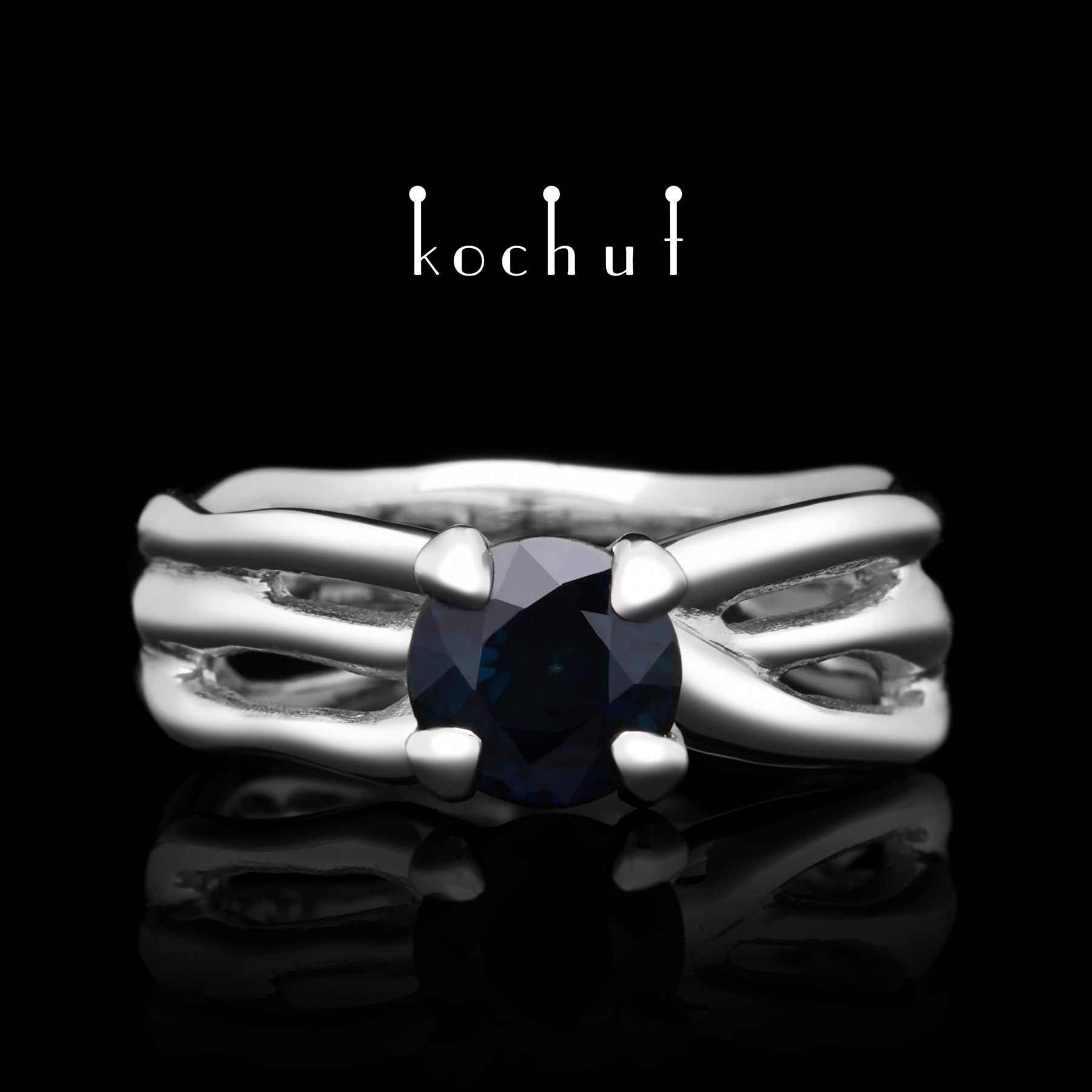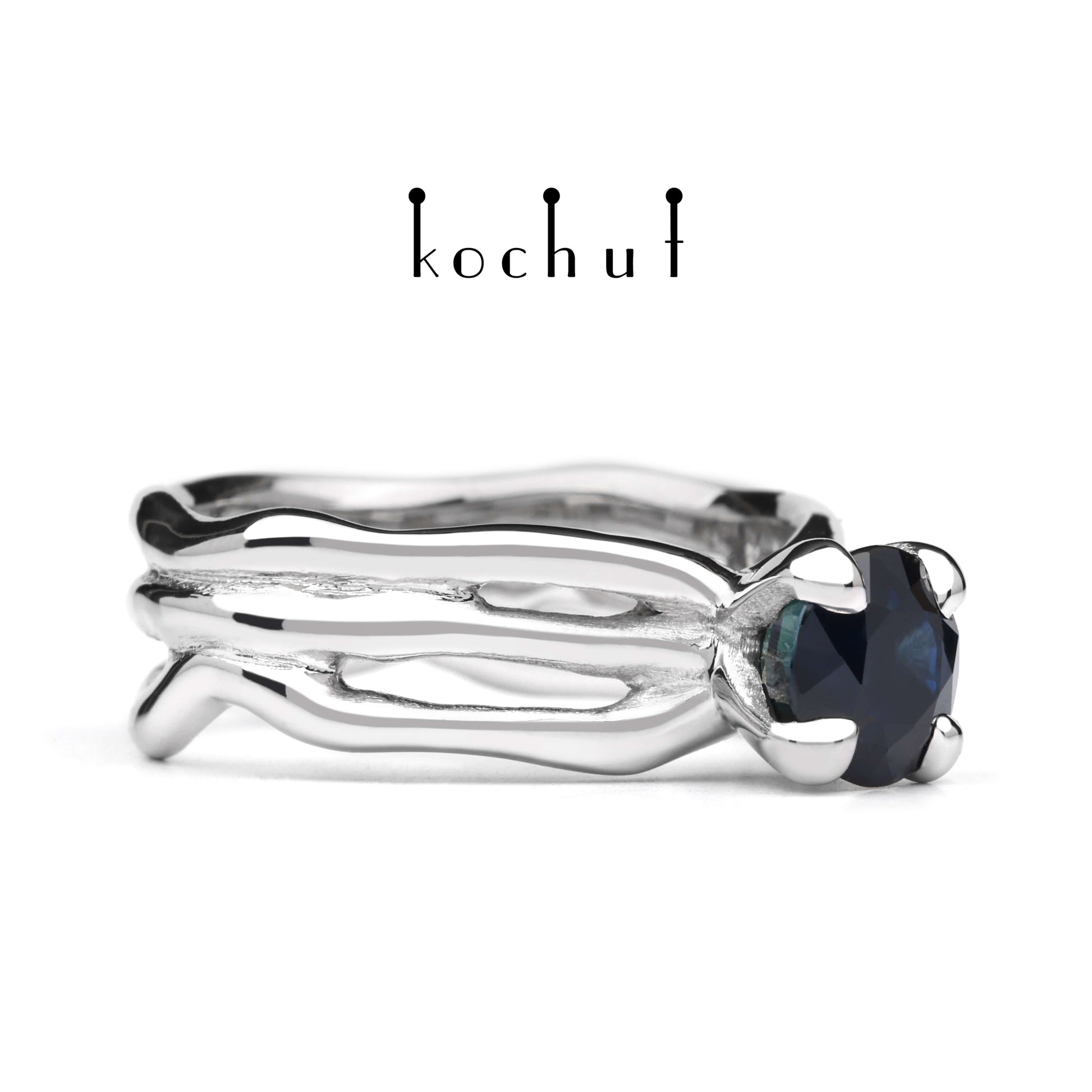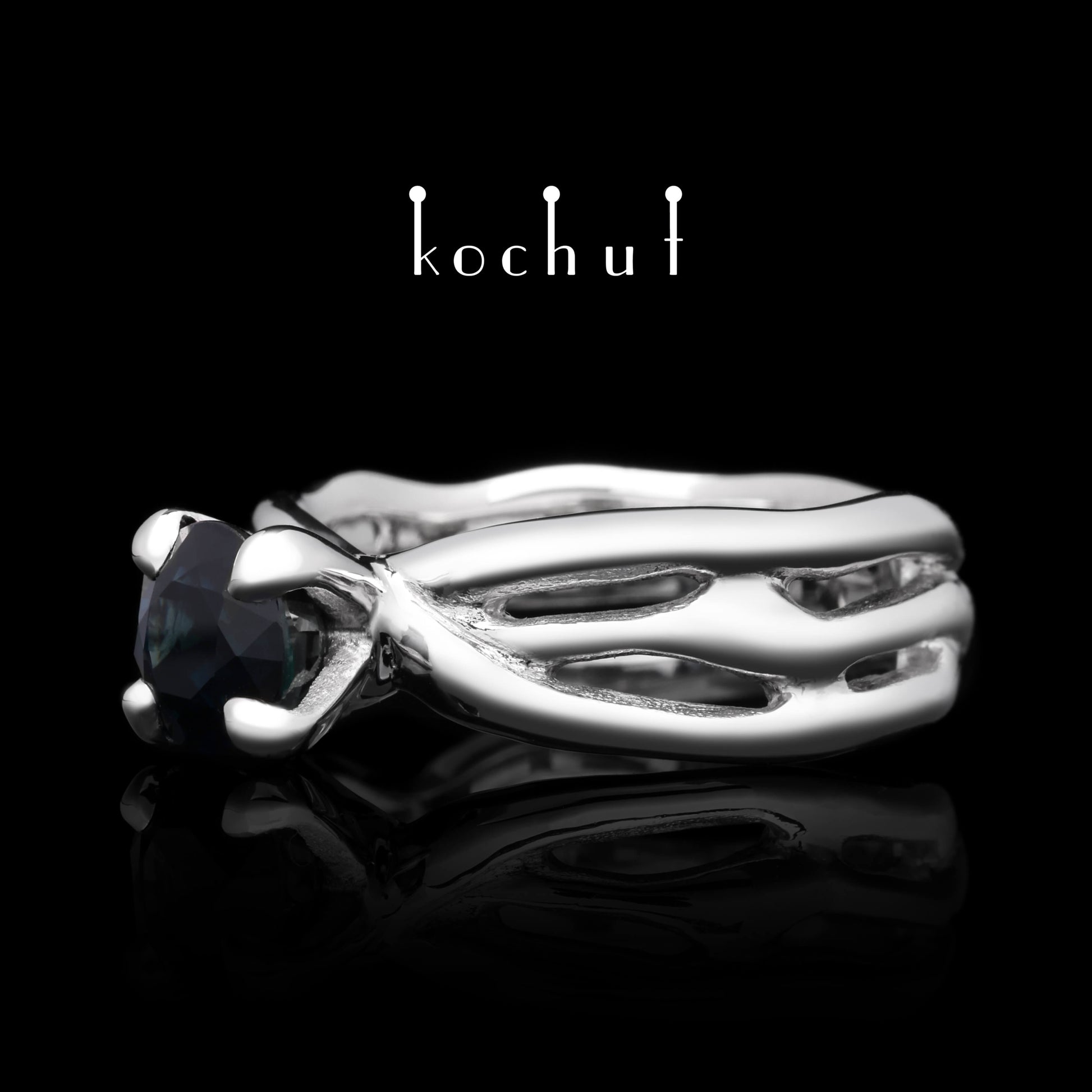 Der Baumstamm hält in seinen Händen einen klar blauen Stein – einen Saphir. Die Oberfläche des Rings ist mit weißem Rhodium überzogen, um den Kontrast zwischen Edelmetall und schimmerndem Stein zu maximieren.
