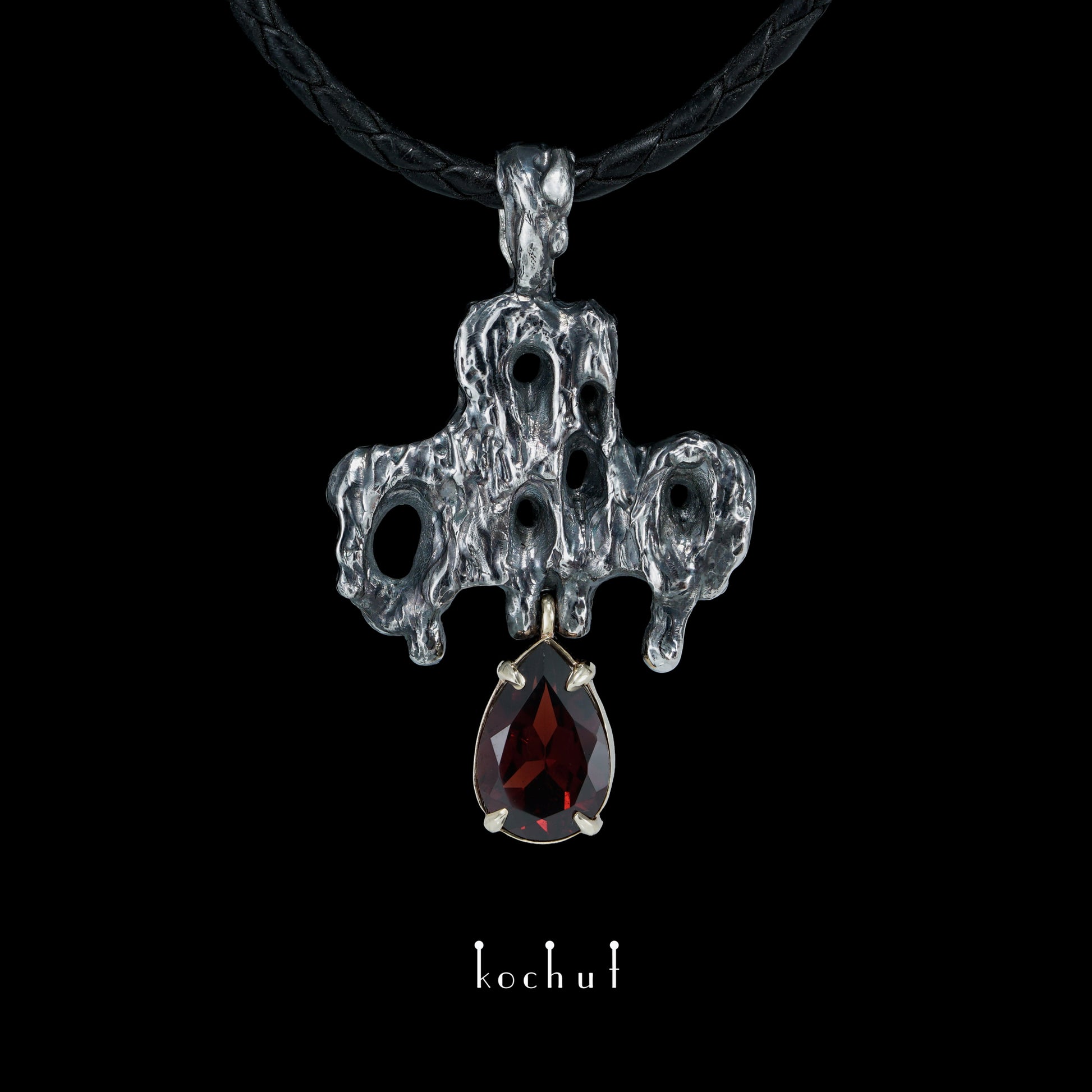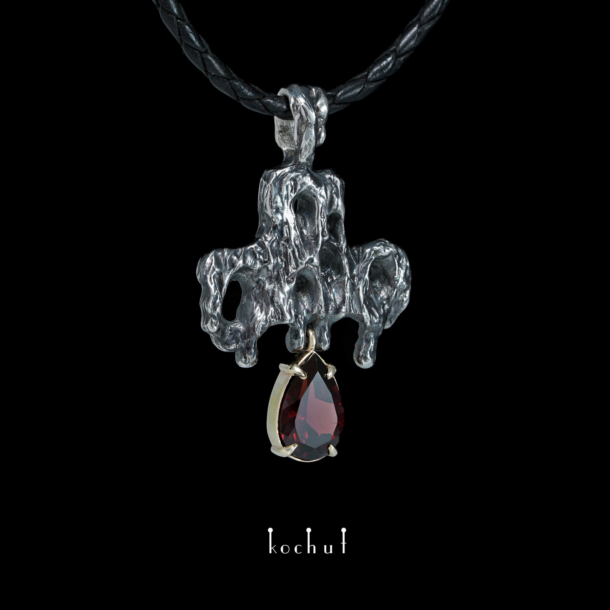 Memento mori — Kreuz aus oxidiertem Silber und Gelbgold mit einem Granat