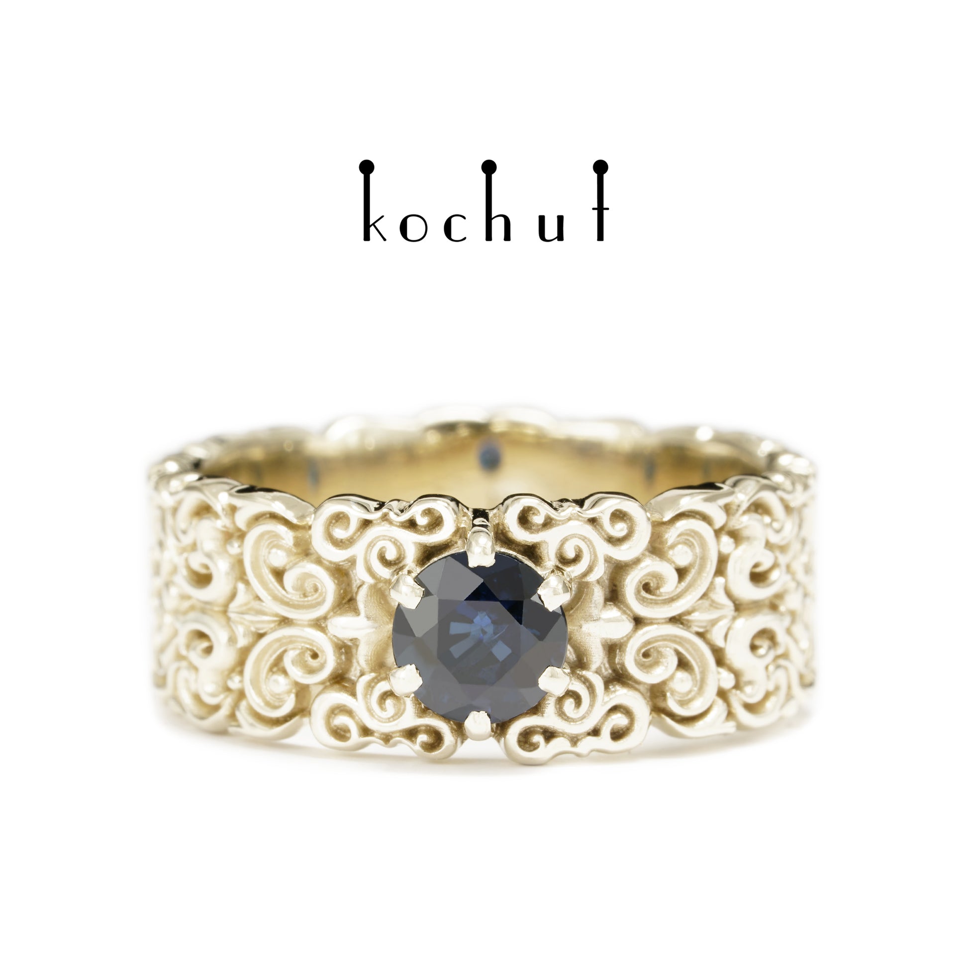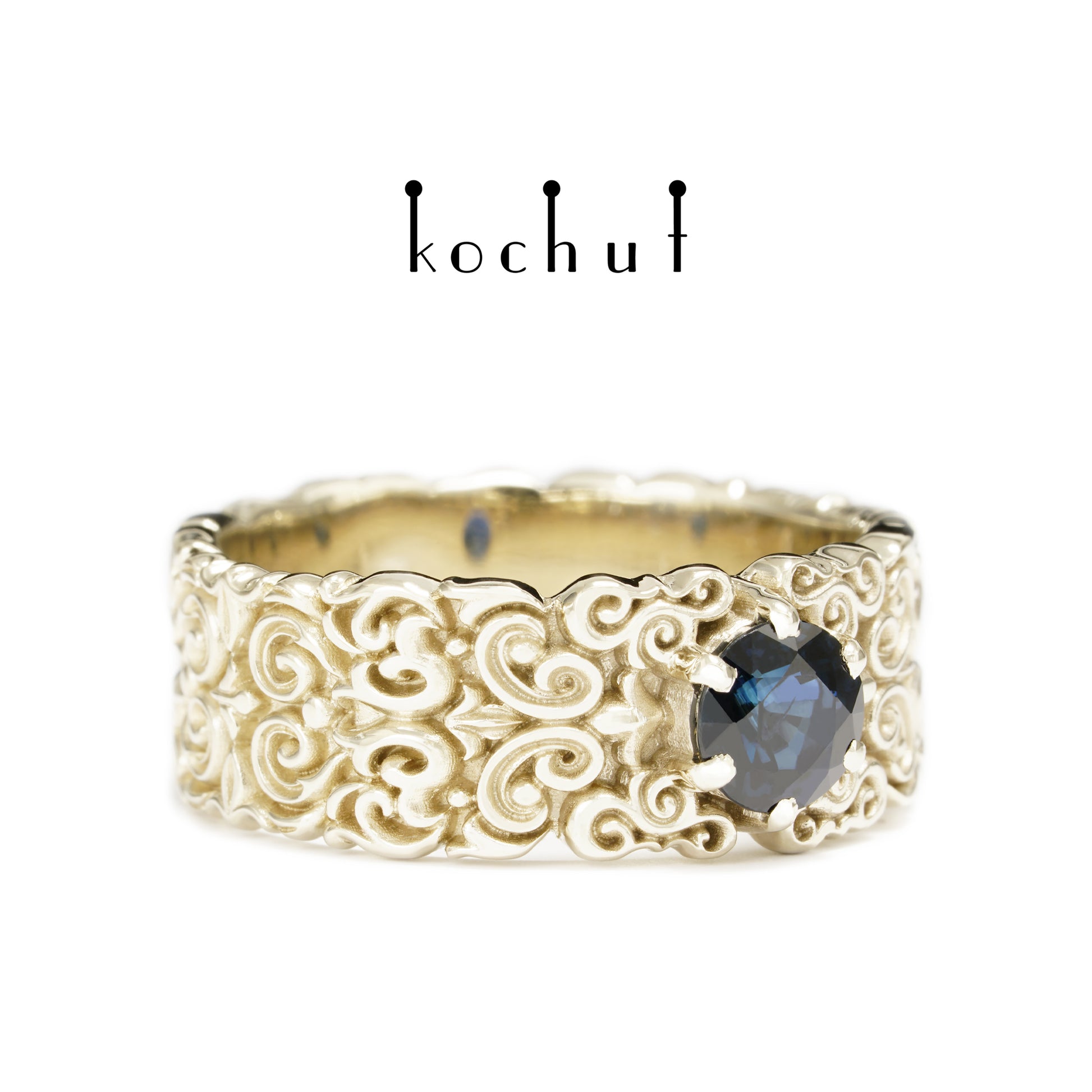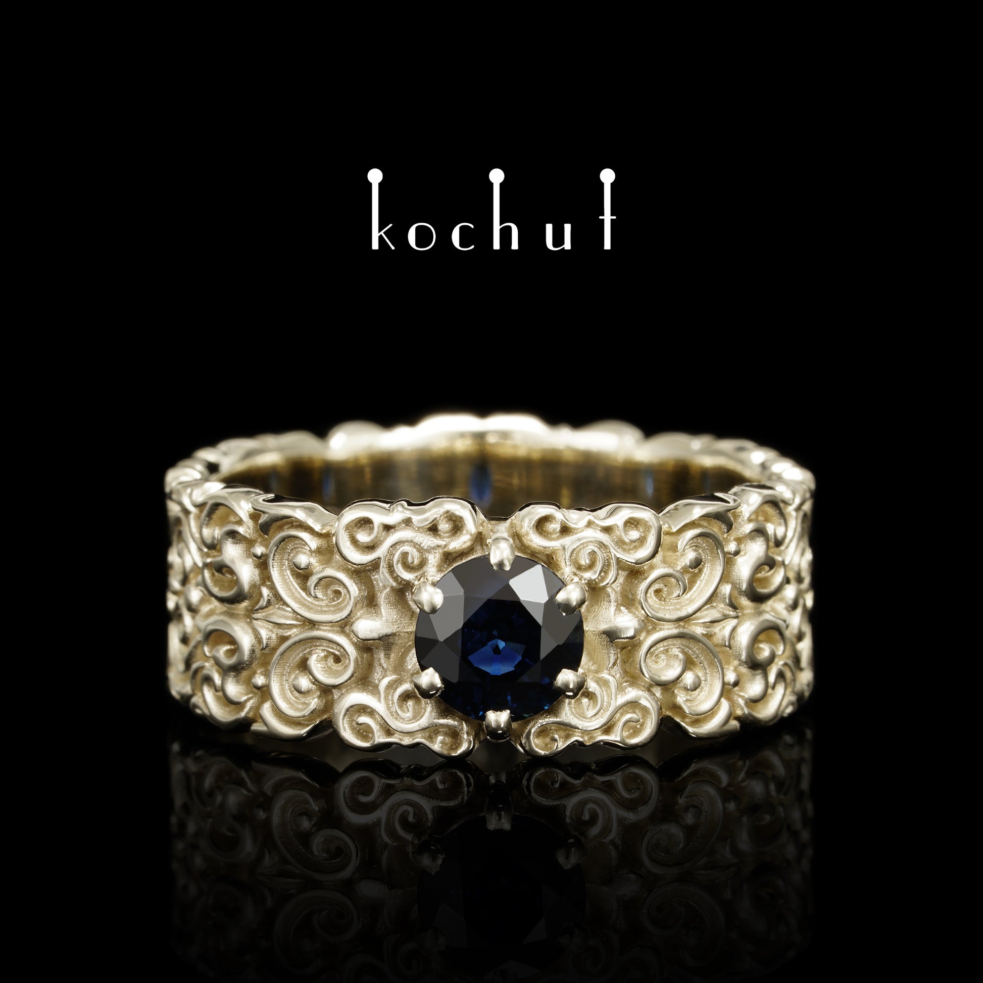 Der Ring ist aus Weißgold 14K gefertigt, und das Muster erinnert an die echten Merkmale von Notre Dame. Ein magischer Saphir befindet sich im Herzen des Rings.