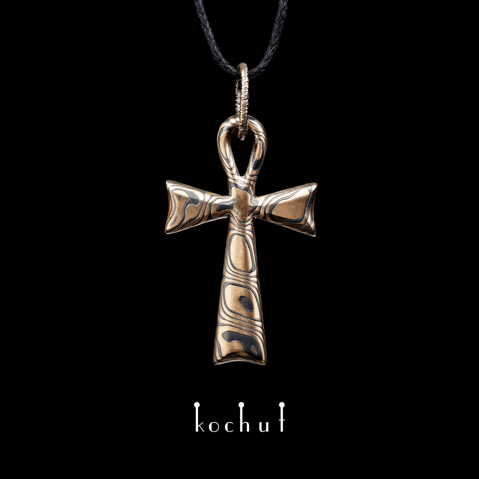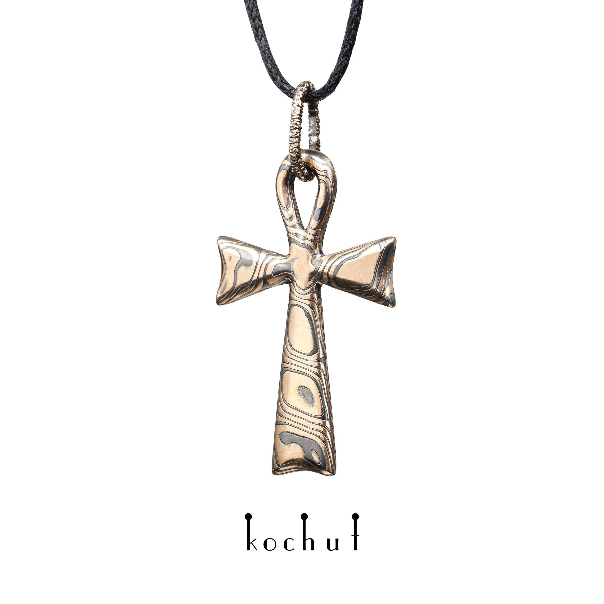 Nur eins — Mokume-Kreuz aus Rotgold und graviertem sowie oxidiertem Silber, überzogen mit schwarzem Rhodium