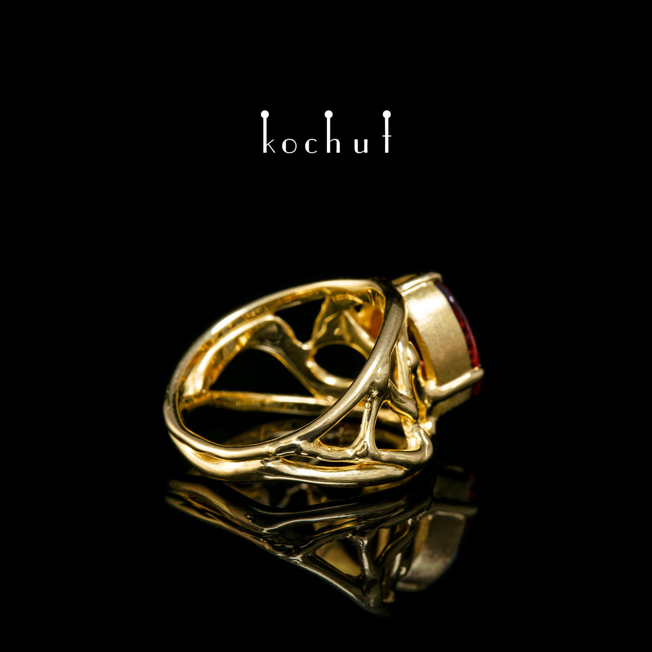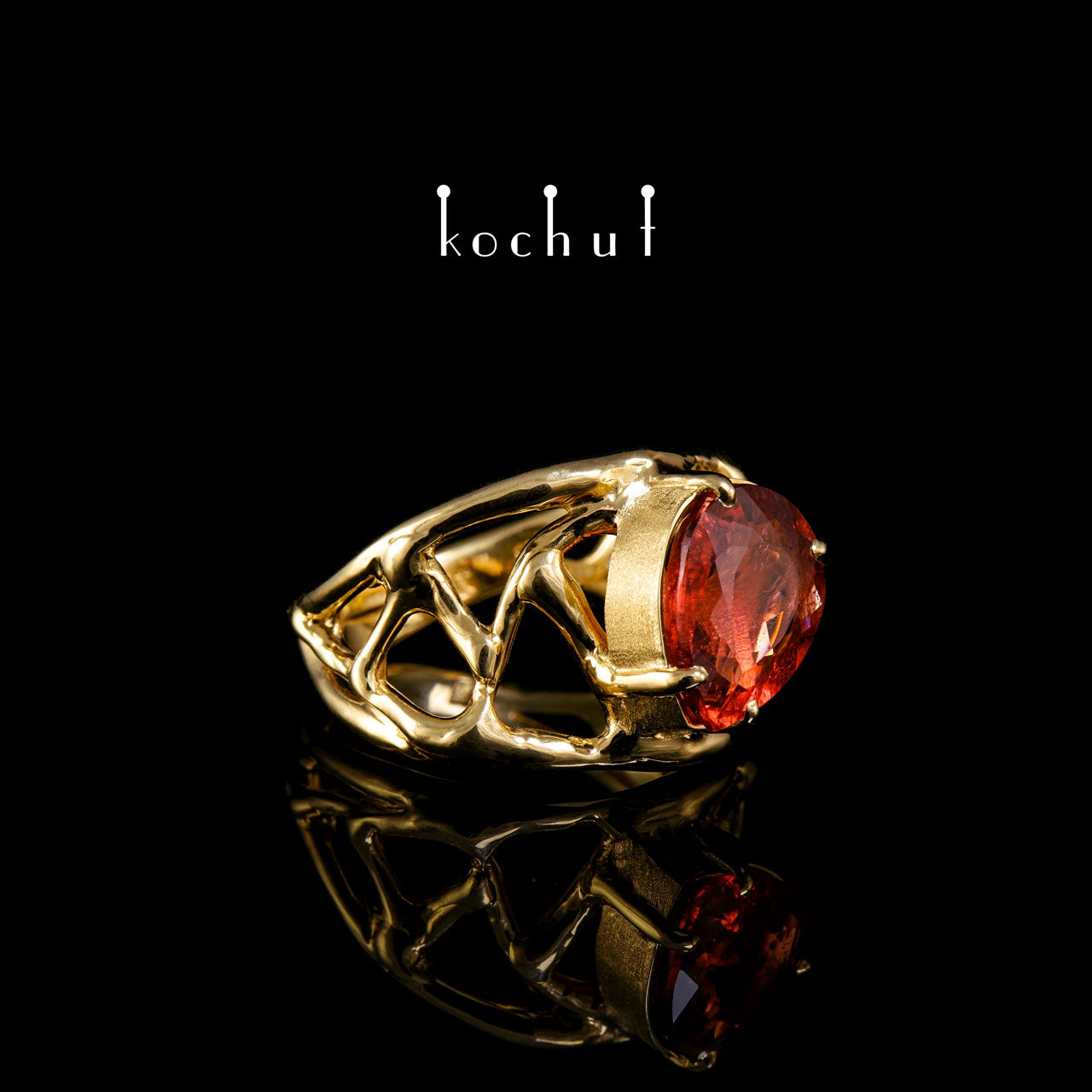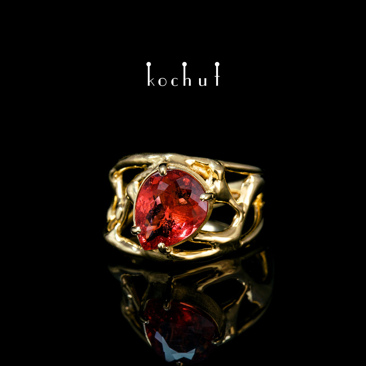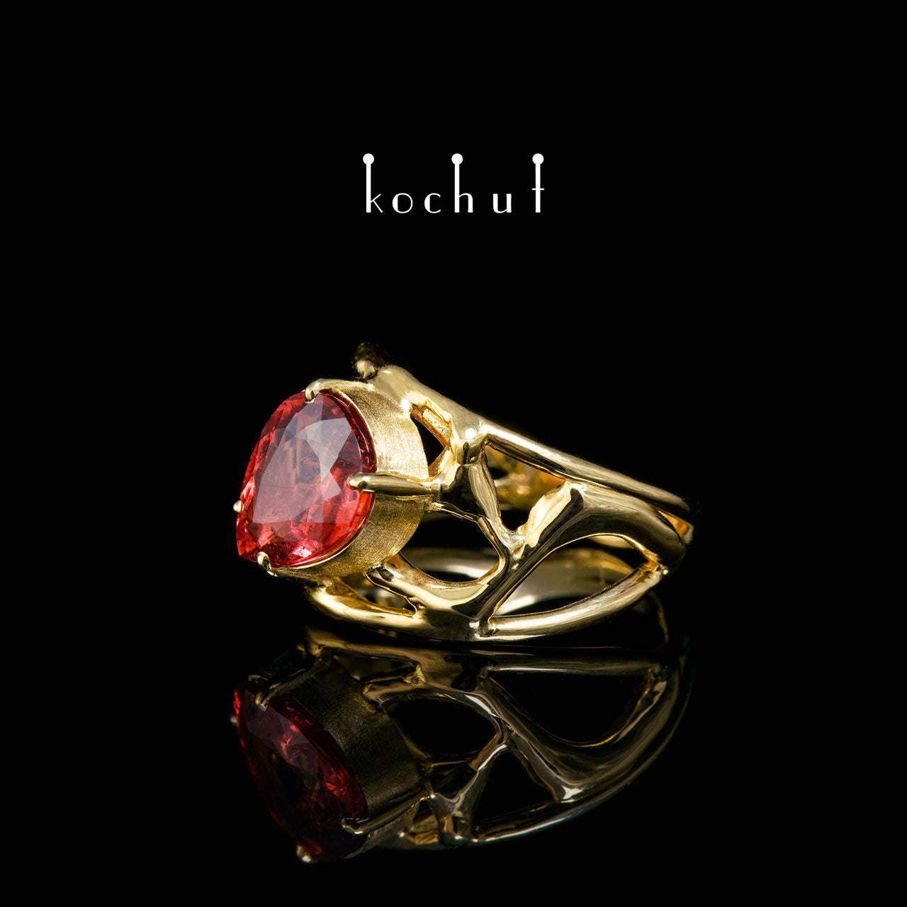 Das Tandem aus Gelbgold und rotem Turmalin ist sehr lebhaft. Es entsteht das Gefühl, als hätte sich die Sonnenlava im Tanz mit dem Sonnenuntergang vereint.