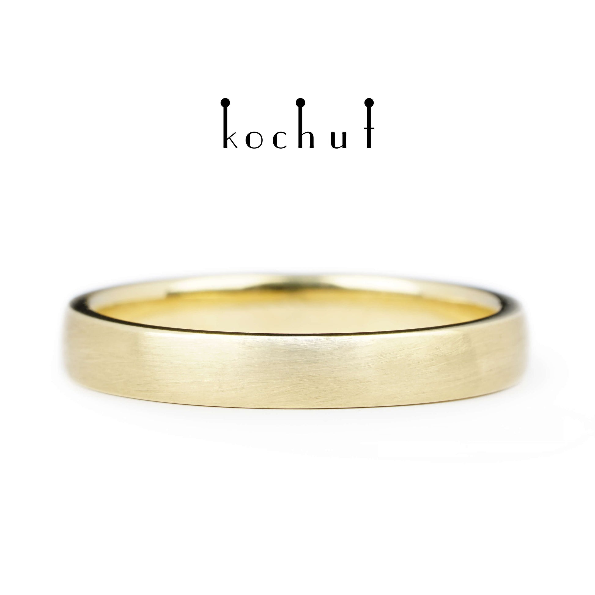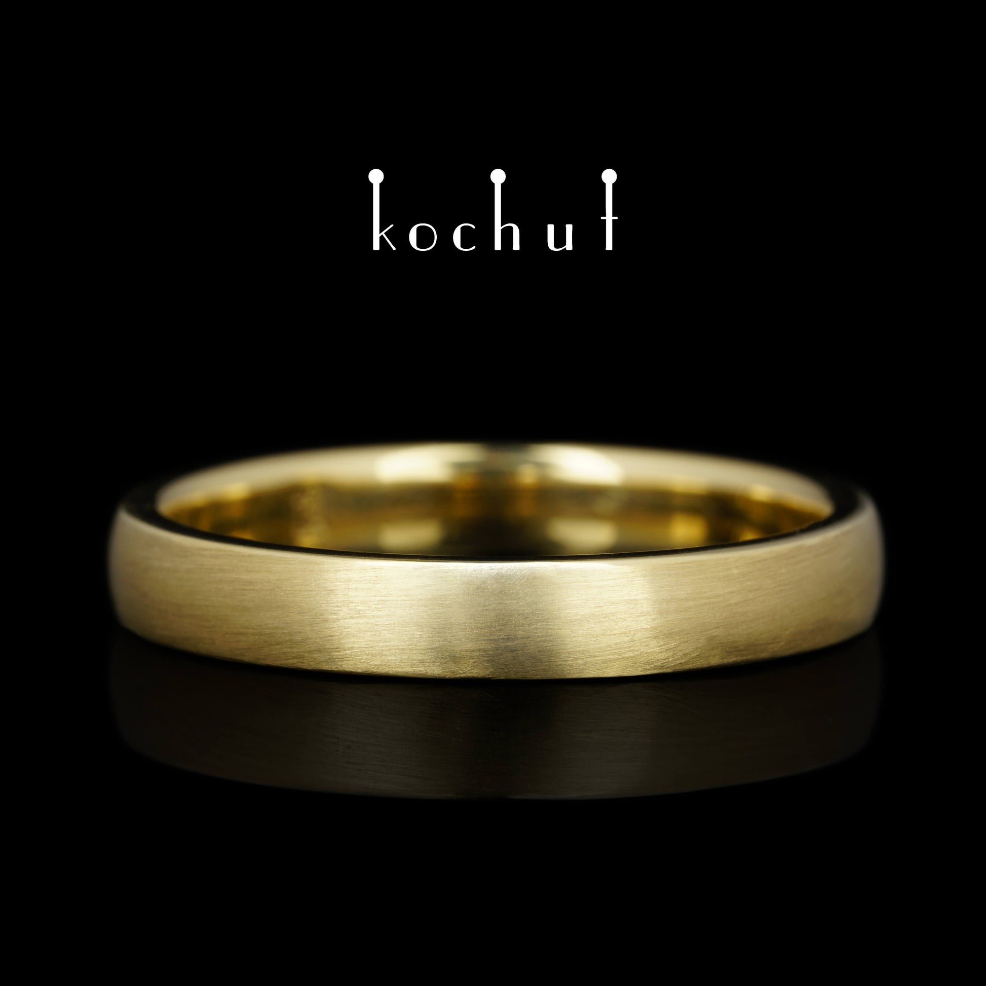 Der Ring ist aus gelbem 14-karätigem Gold mit einer matten Oberfläche gefertigt. Der Ring wird den geliebten Menschen aufrichtiges Glück bringen und die Bande der Liebe und Zärtlichkeit für immer stärken. Mit Liebe entworfen für diejenigen, die den klassischen Stil und die Schlichtheit schätzen.