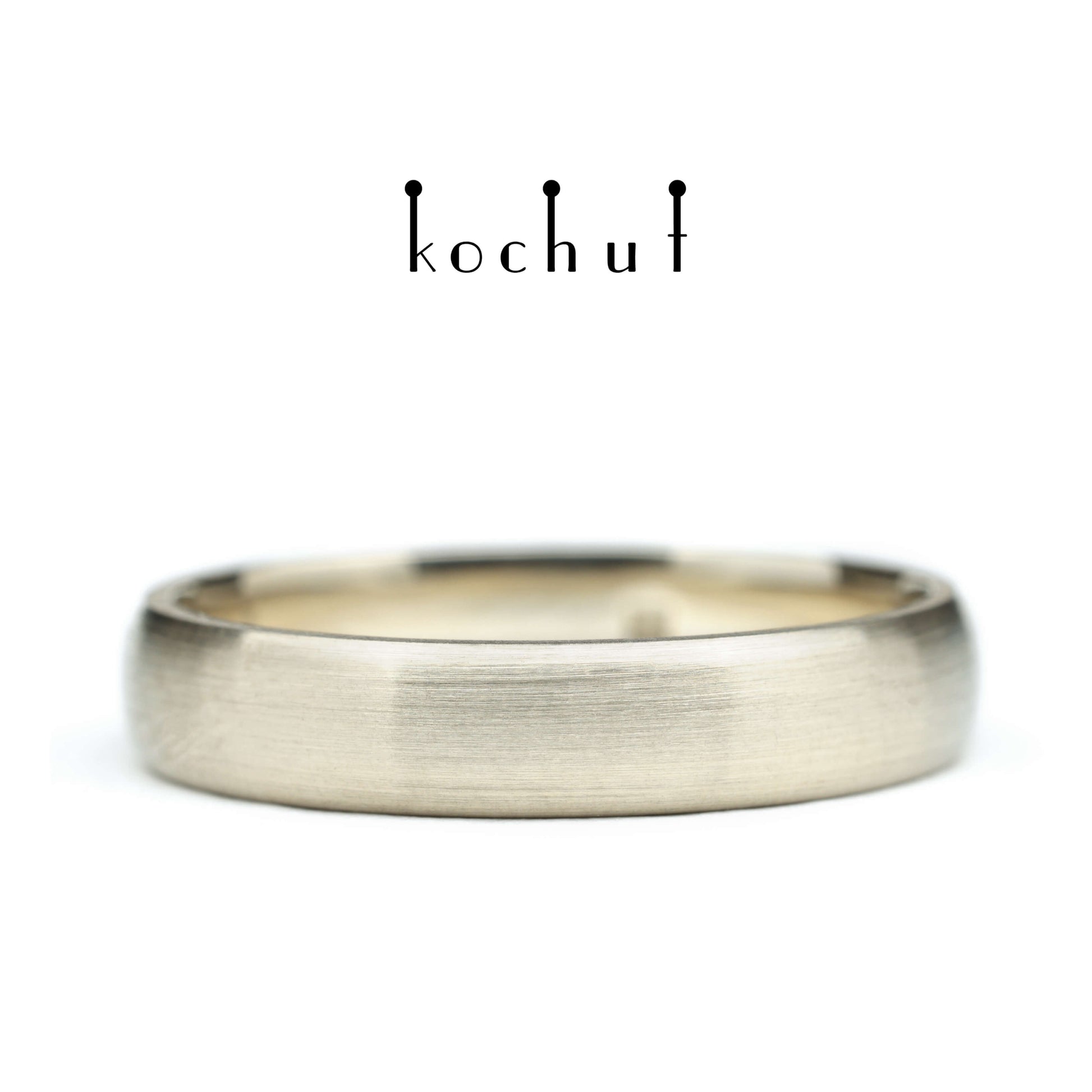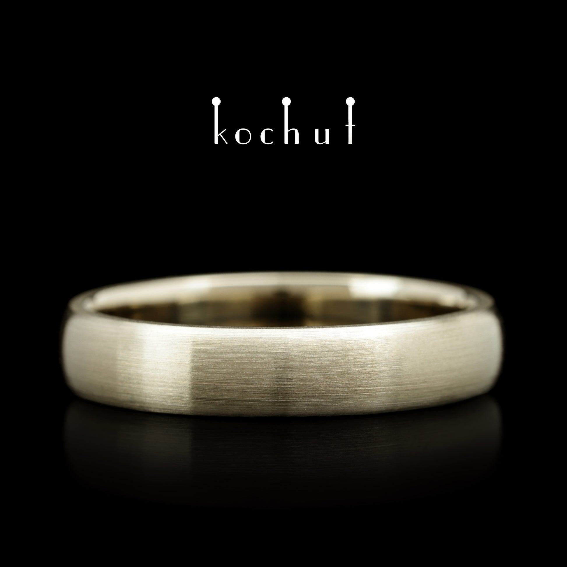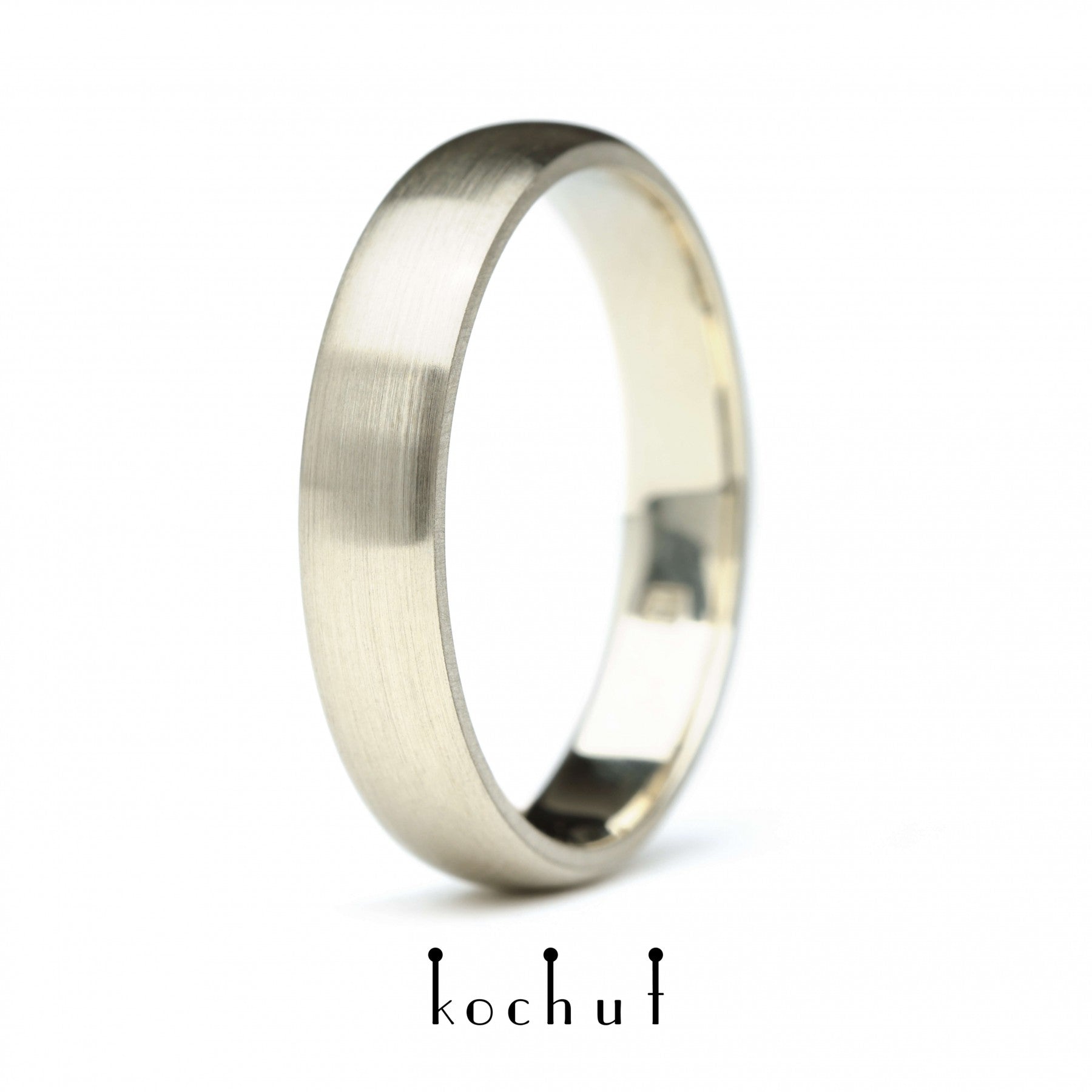 Der Ring ist aus weißem 14-karätigem Gold mit einer matten Oberfläche gefertigt. Der Ring wird den geliebten Menschen aufrichtiges Glück bringen und die Bande der Liebe und Zärtlichkeit für immer stärken. Mit Liebe entworfen für diejenigen, die den klassischen Stil und die Schlichtheit schätzen.