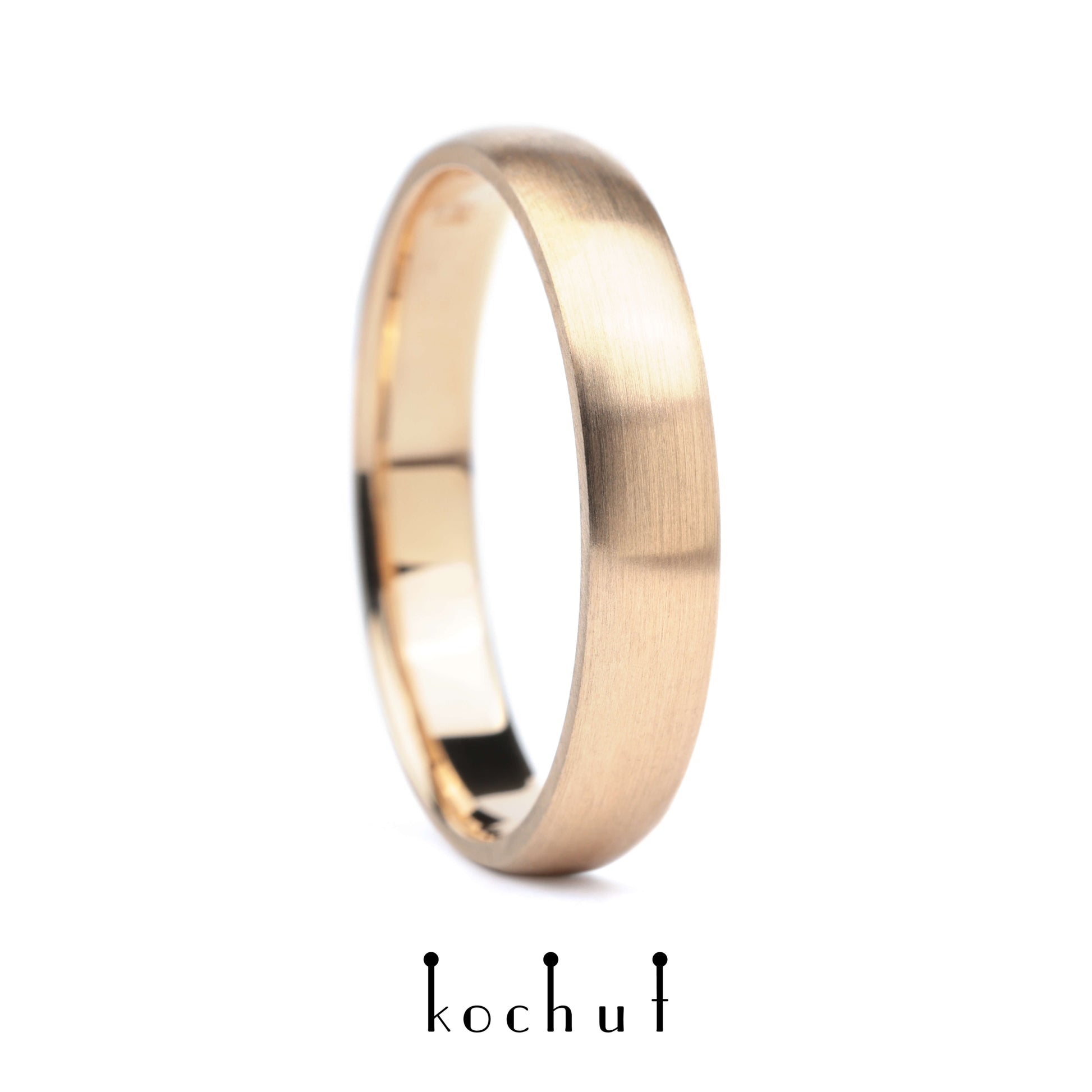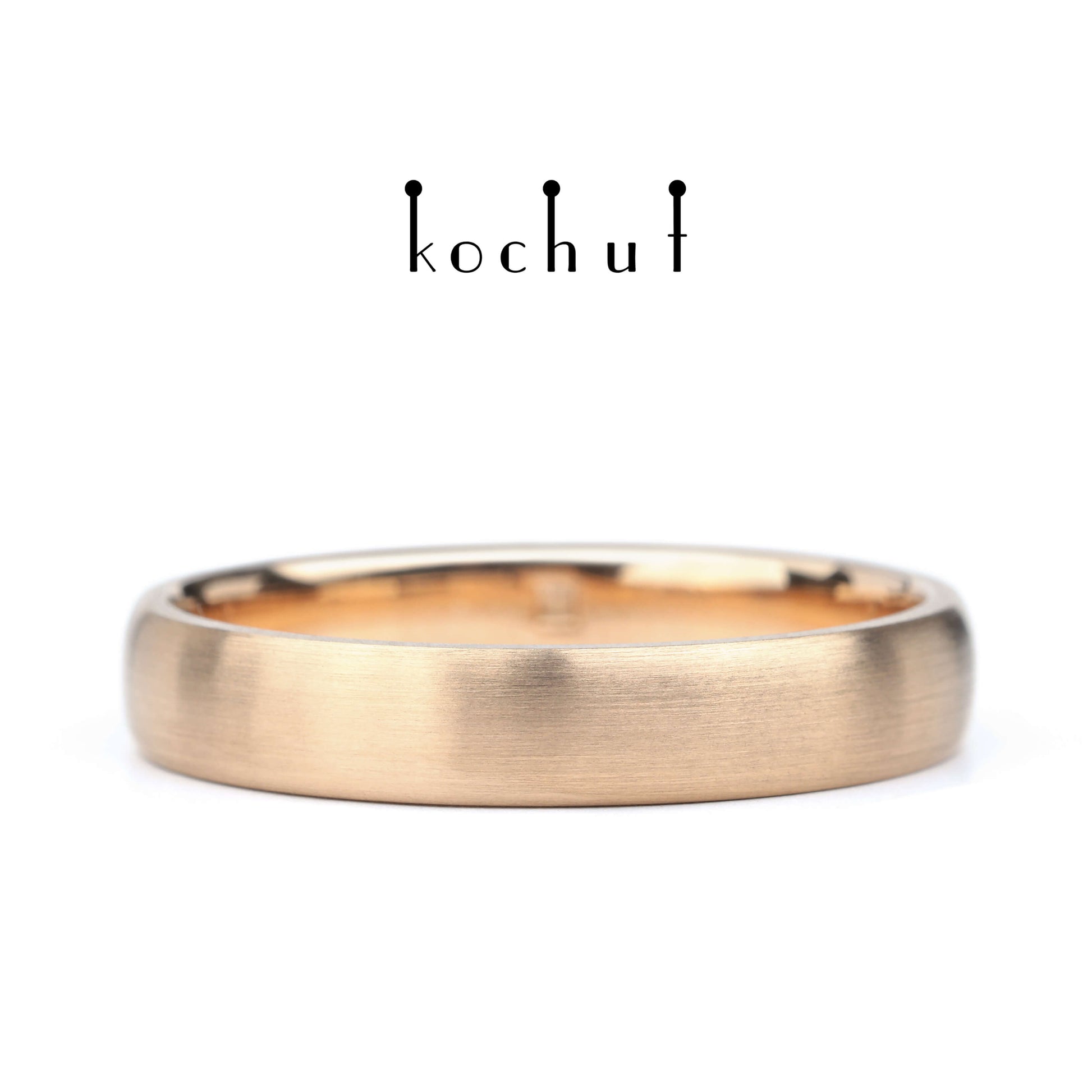 Der Ring ist aus rotem 14-karätigem Gold mit einer matten Oberfläche gefertigt. Der Ring wird den Geliebten aufrichtiges Glück bringen und die Bande der Liebe und Zärtlichkeit für immer stärken. Mit Liebe entworfen für diejenigen, die den klassischen Stil und die Schlichtheit schätzen.