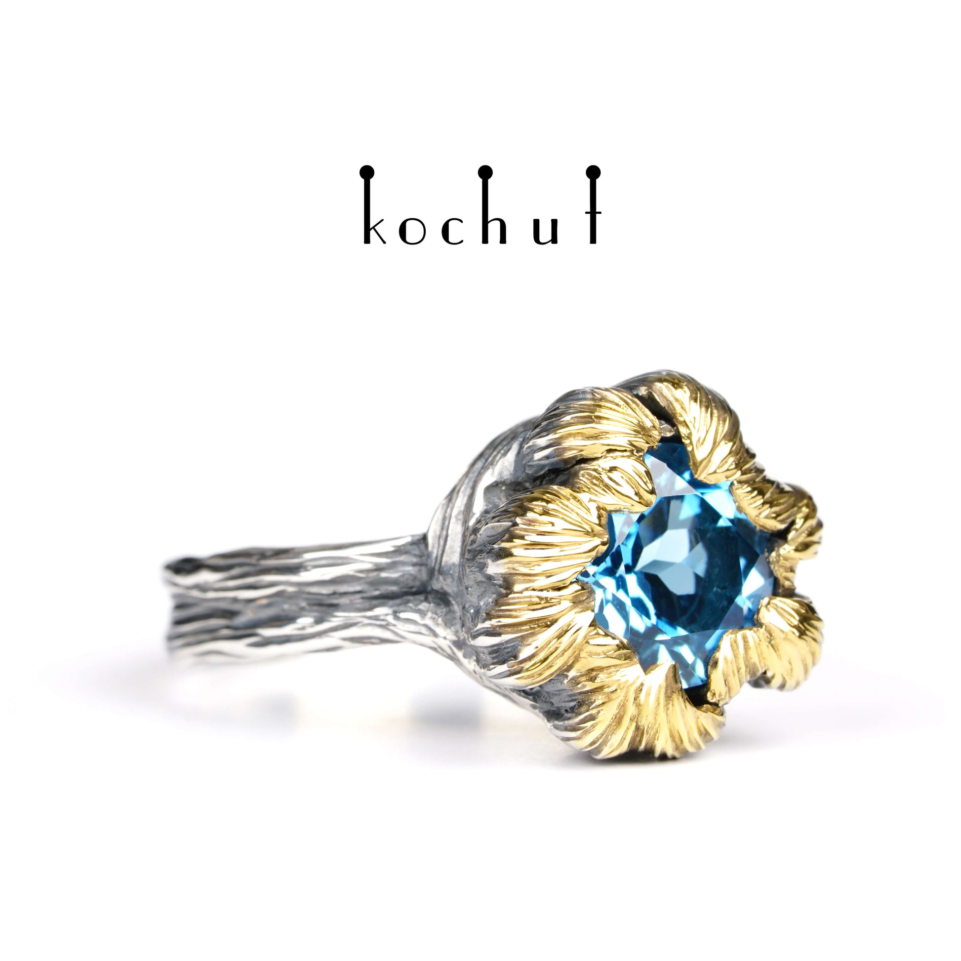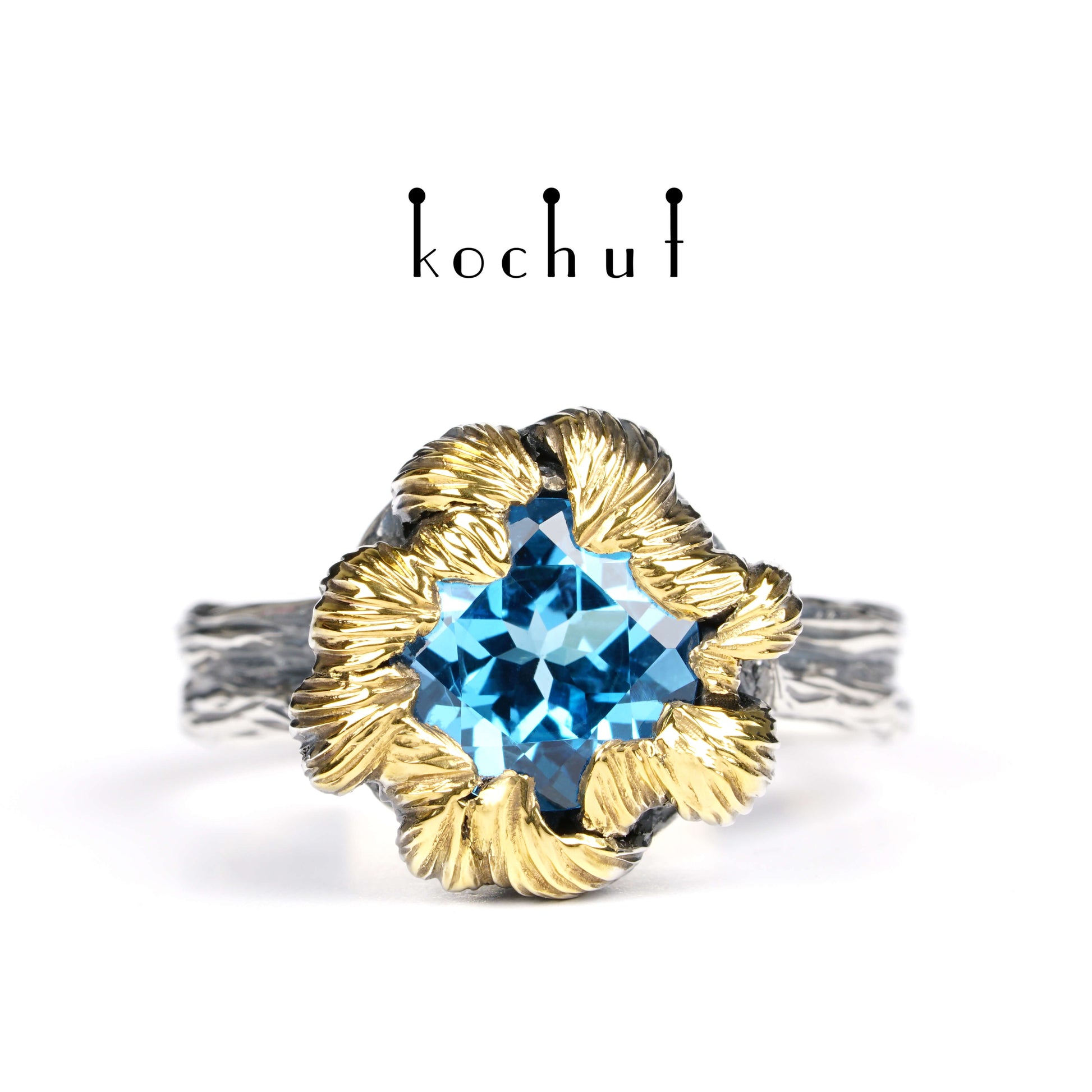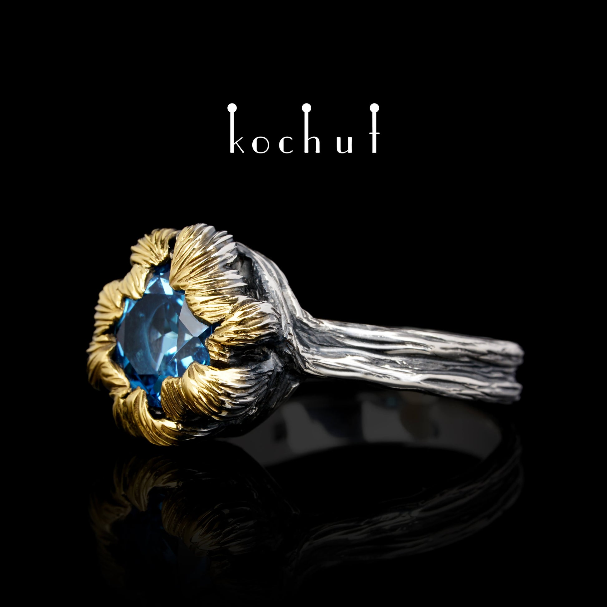 Pfingstrose — Ring aus oxidiertem Silber mit Topas und Vergoldung