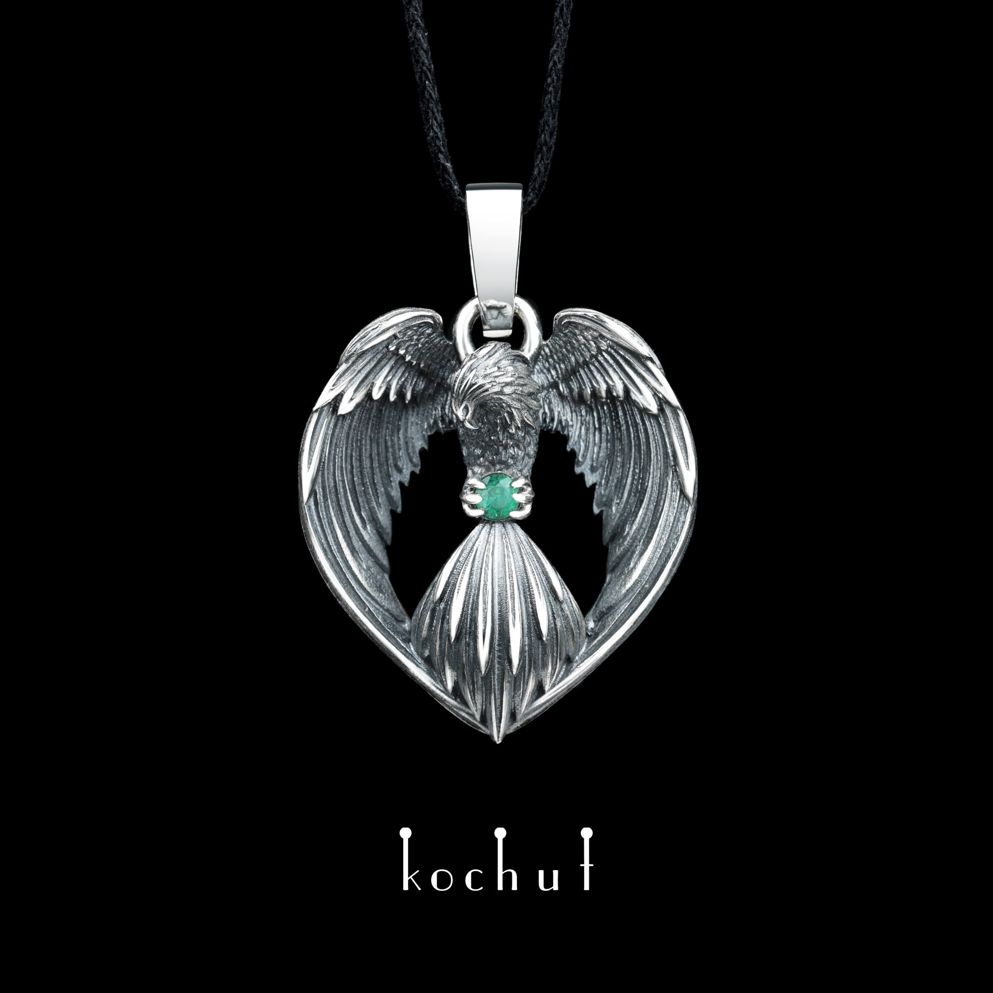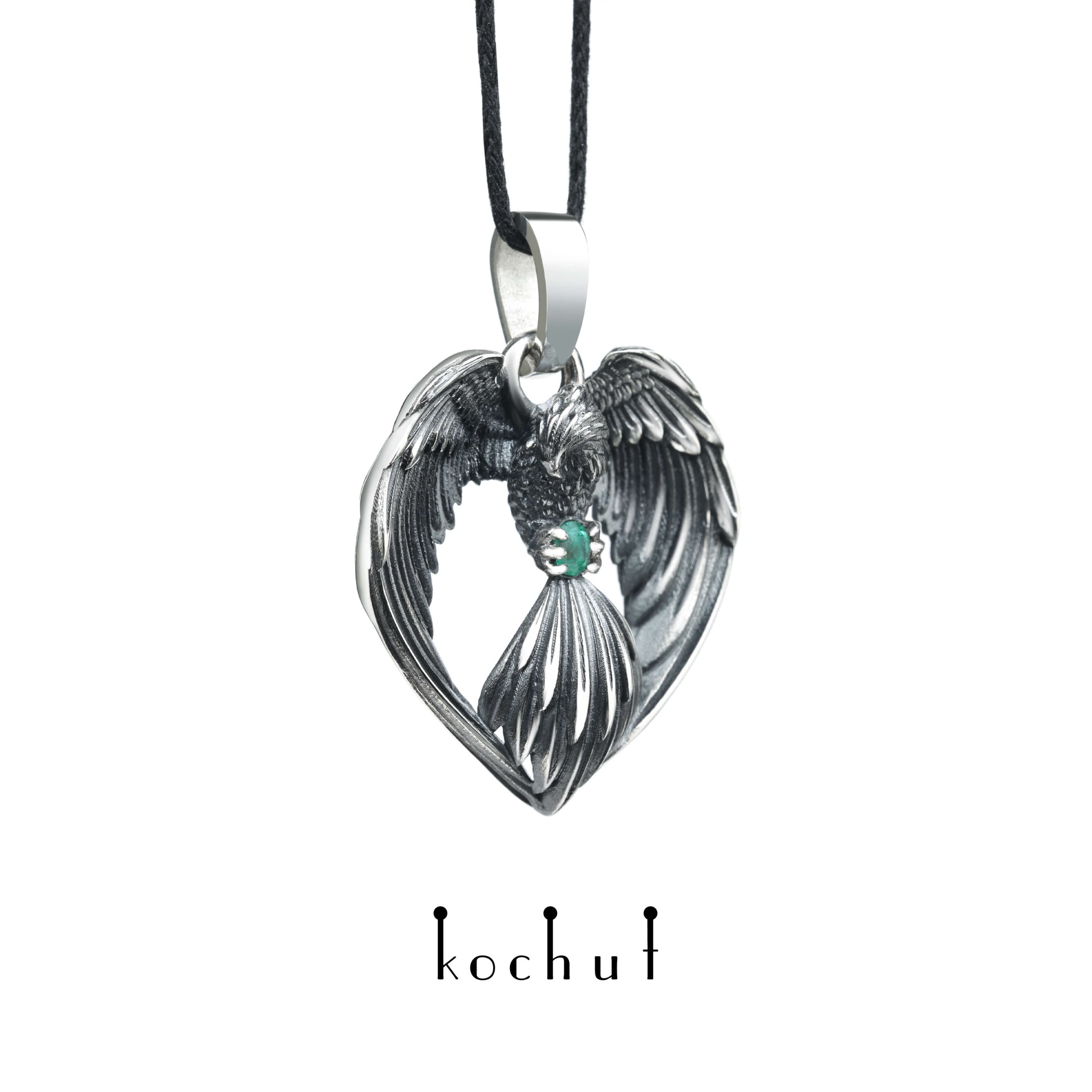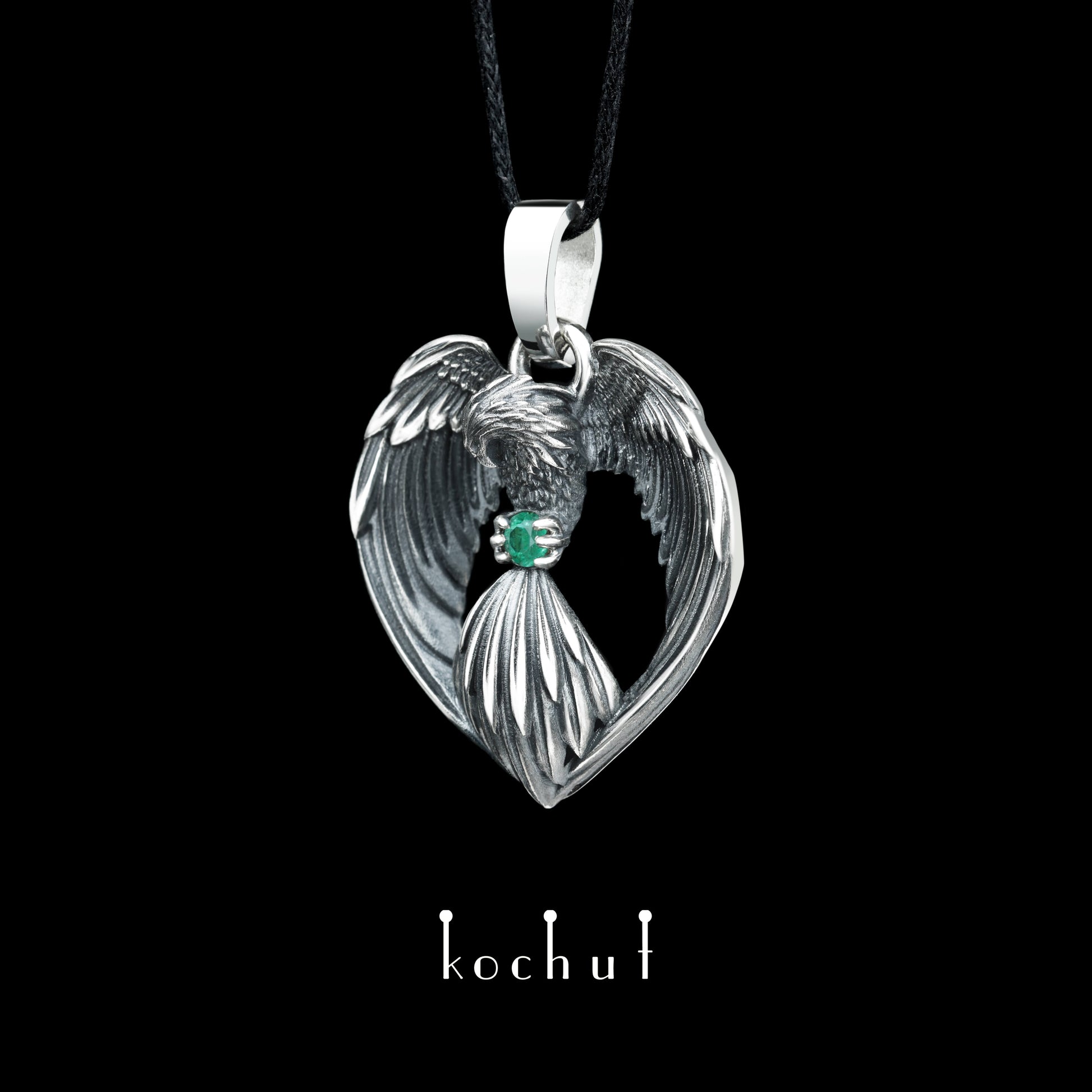 Phoenix — Anhänger aus oxidiertem Silber mit Smaragd