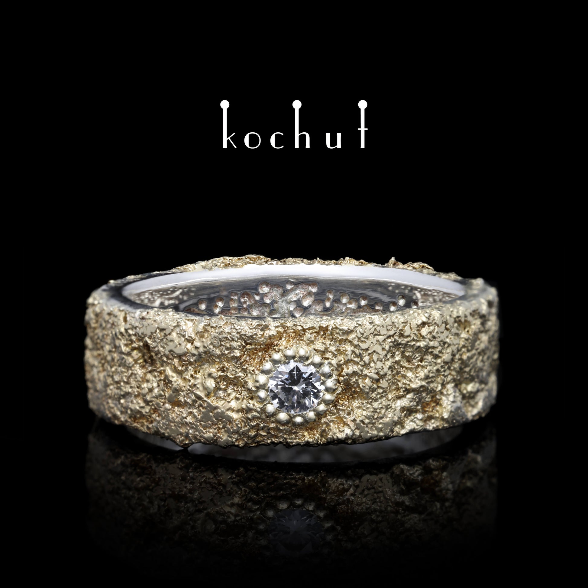 Leib und Seele mit dem Baum des Lebens und Lichtschmiedekunst — Silberhochzeitssilberring mit Gelbgoldfusion und Diamant