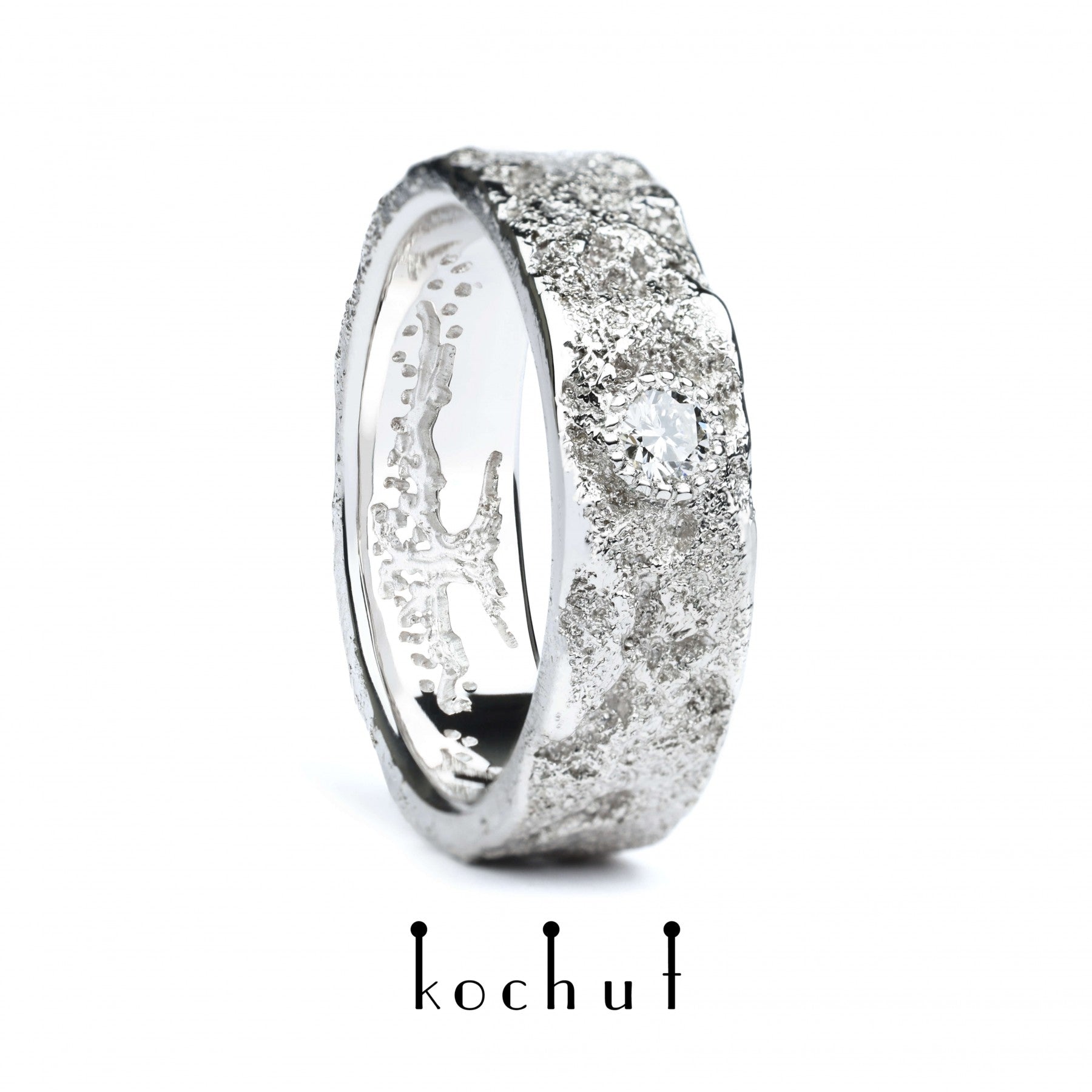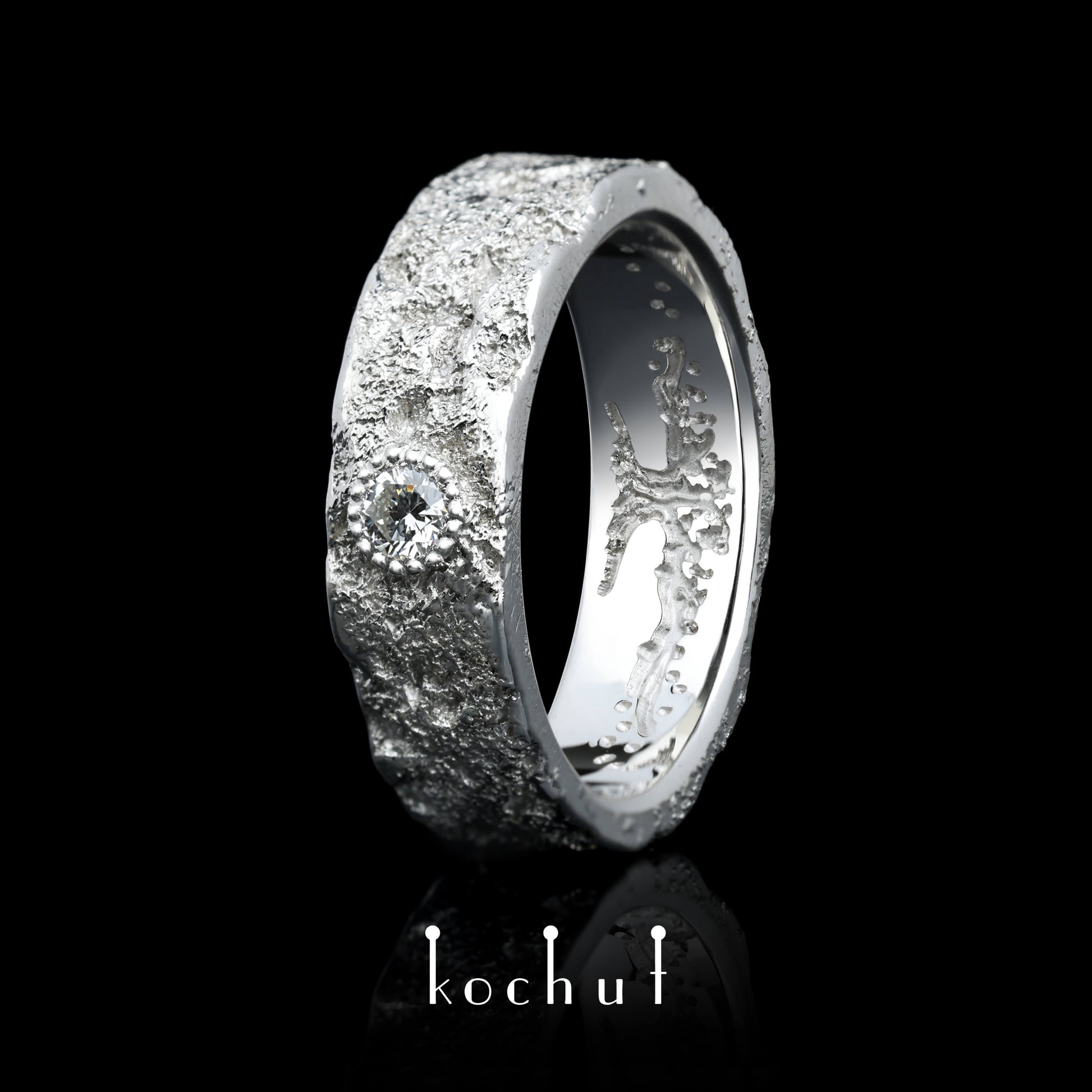 Der Grundkörper des Rings ist aus Weißgold gefertigt, innen befindet sich eine Gravur des Baumes des Lebens mit Hilfe von Ruthenium. Auf der Oberfläche — die künstlerische Verschmelzung von Weißgold.