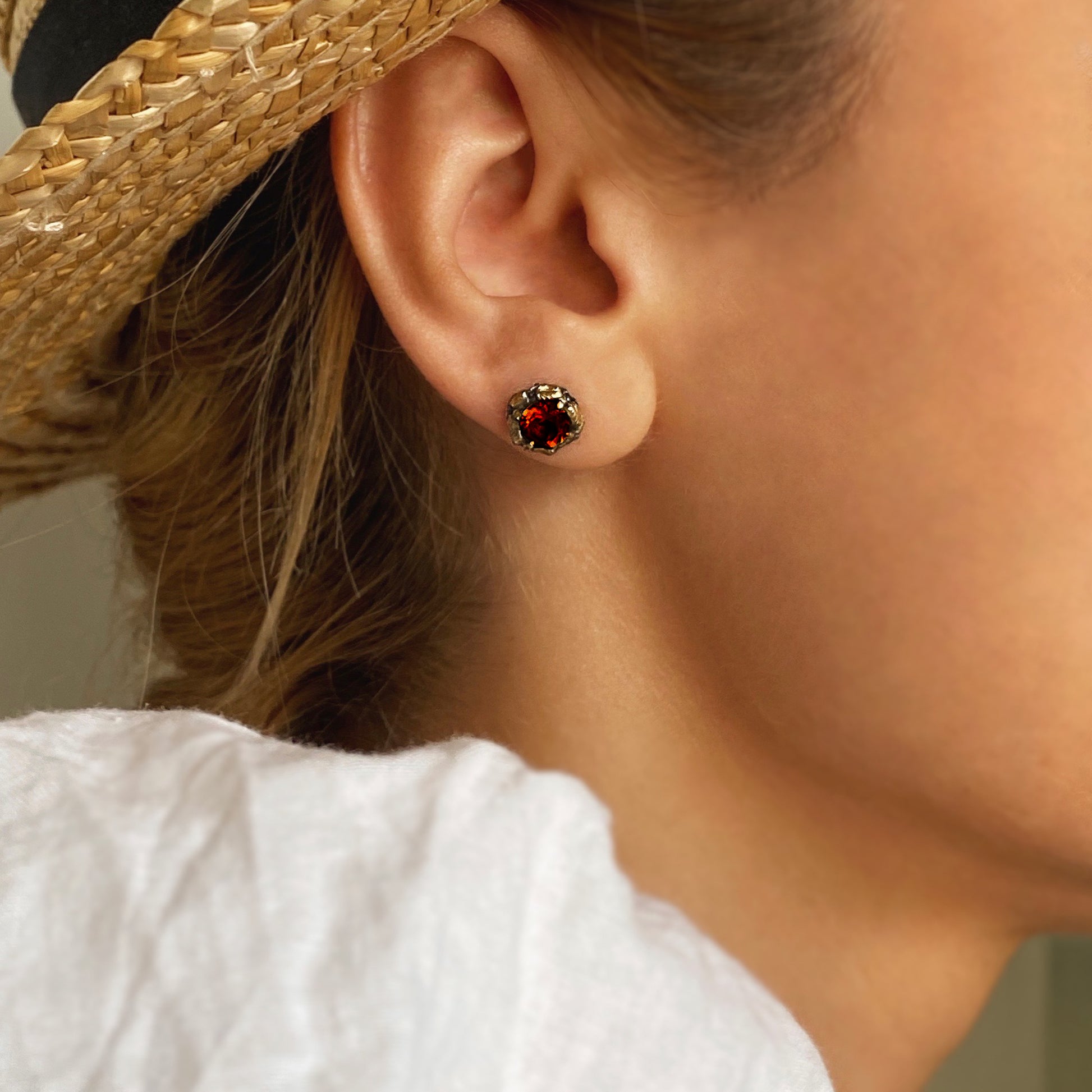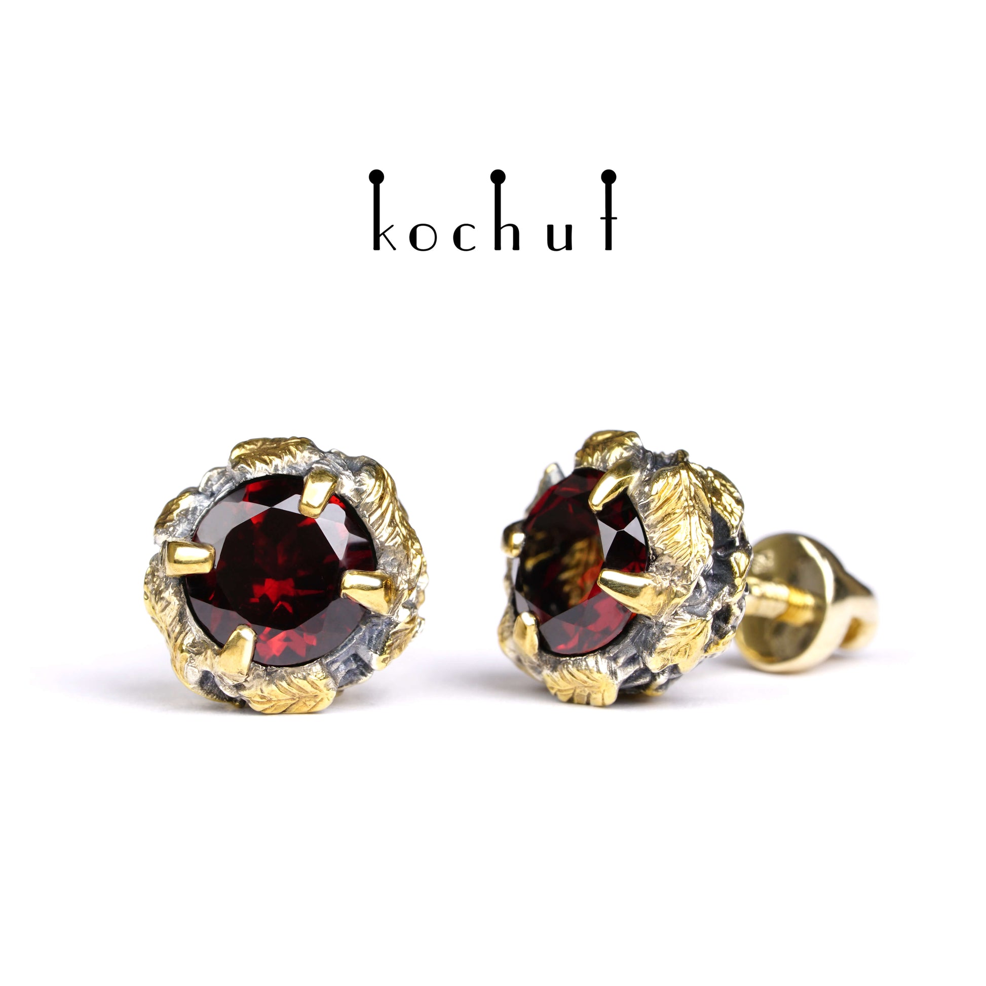 Sonniger Wald — Ohrringe aus oxidiertem Silber und Gelbgold mit Granaten und Vergoldung