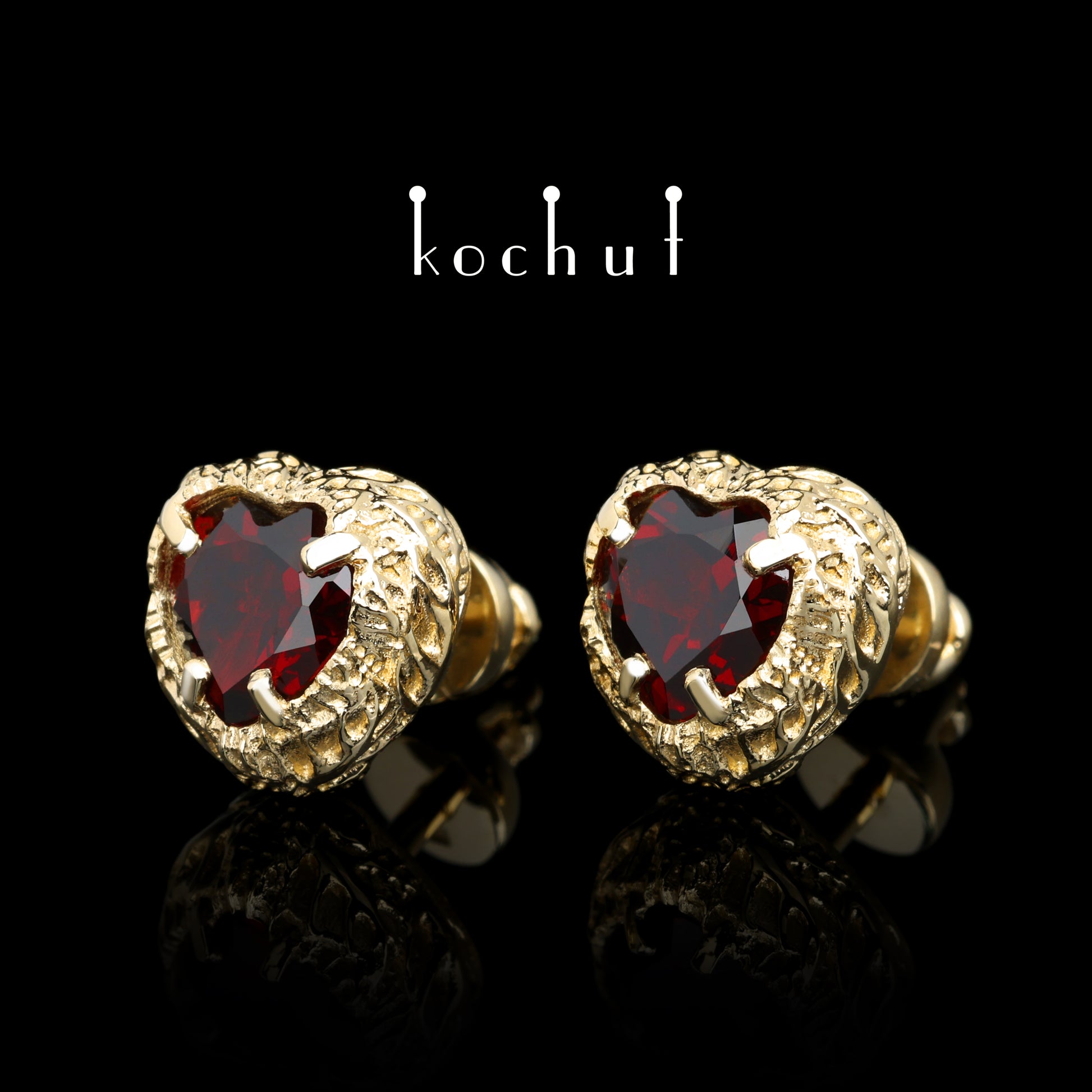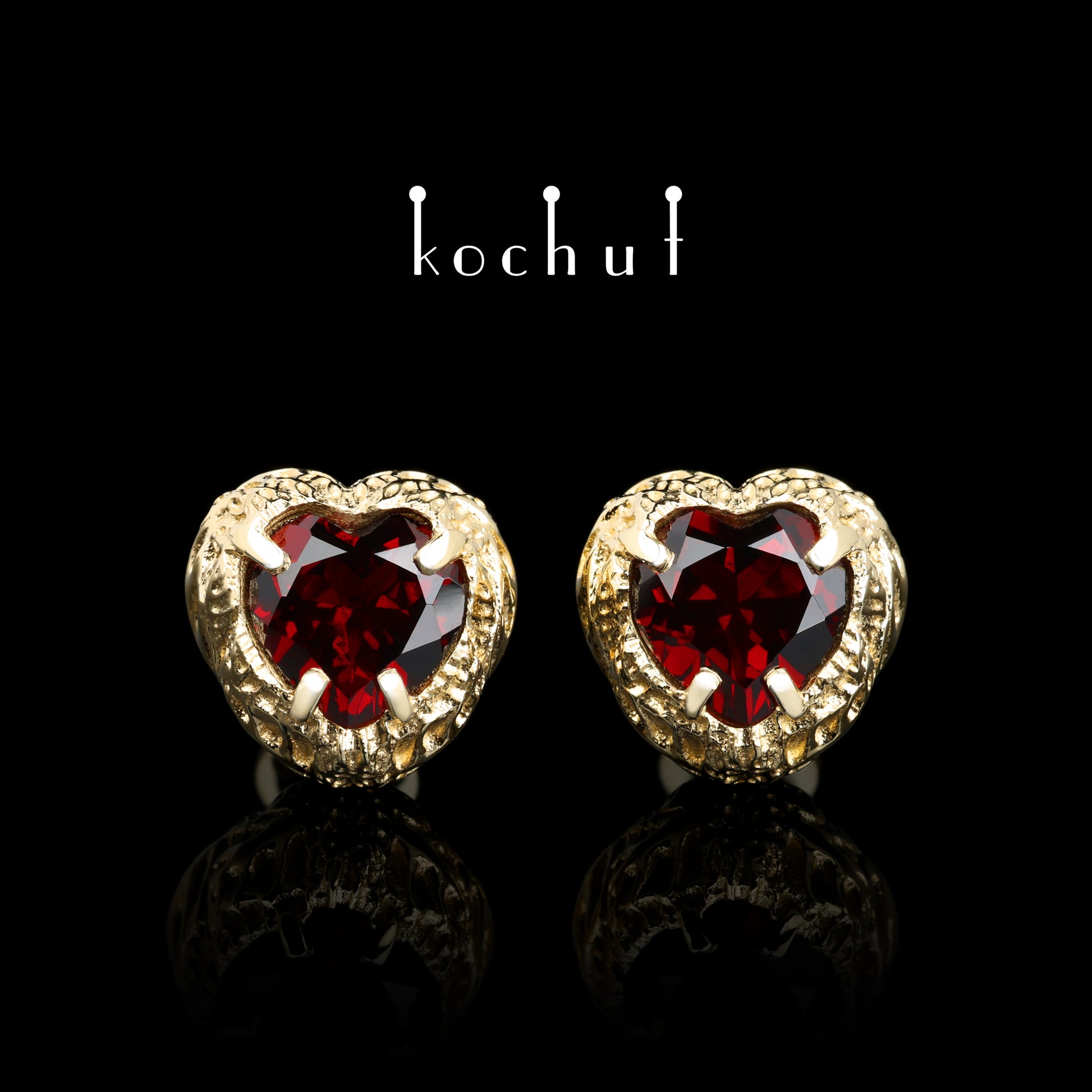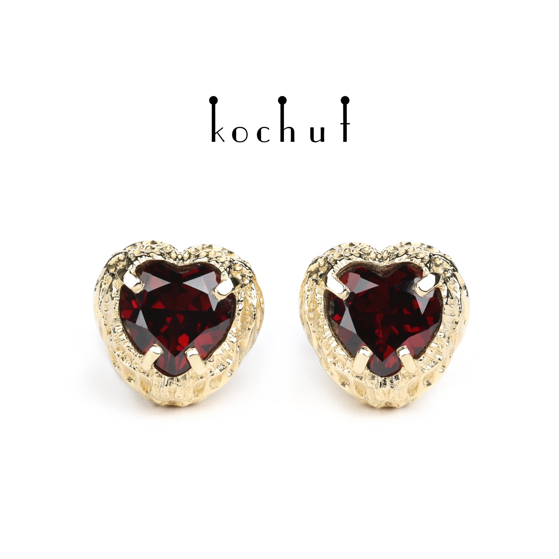 Die Ohrringe sind aus sonnigem Gelbgold gefertigt, und im pulsierenden rosa Herz des Sonnenuntergangs — natürlichen Granaten — findest du alle Geheimnisse des Universums.