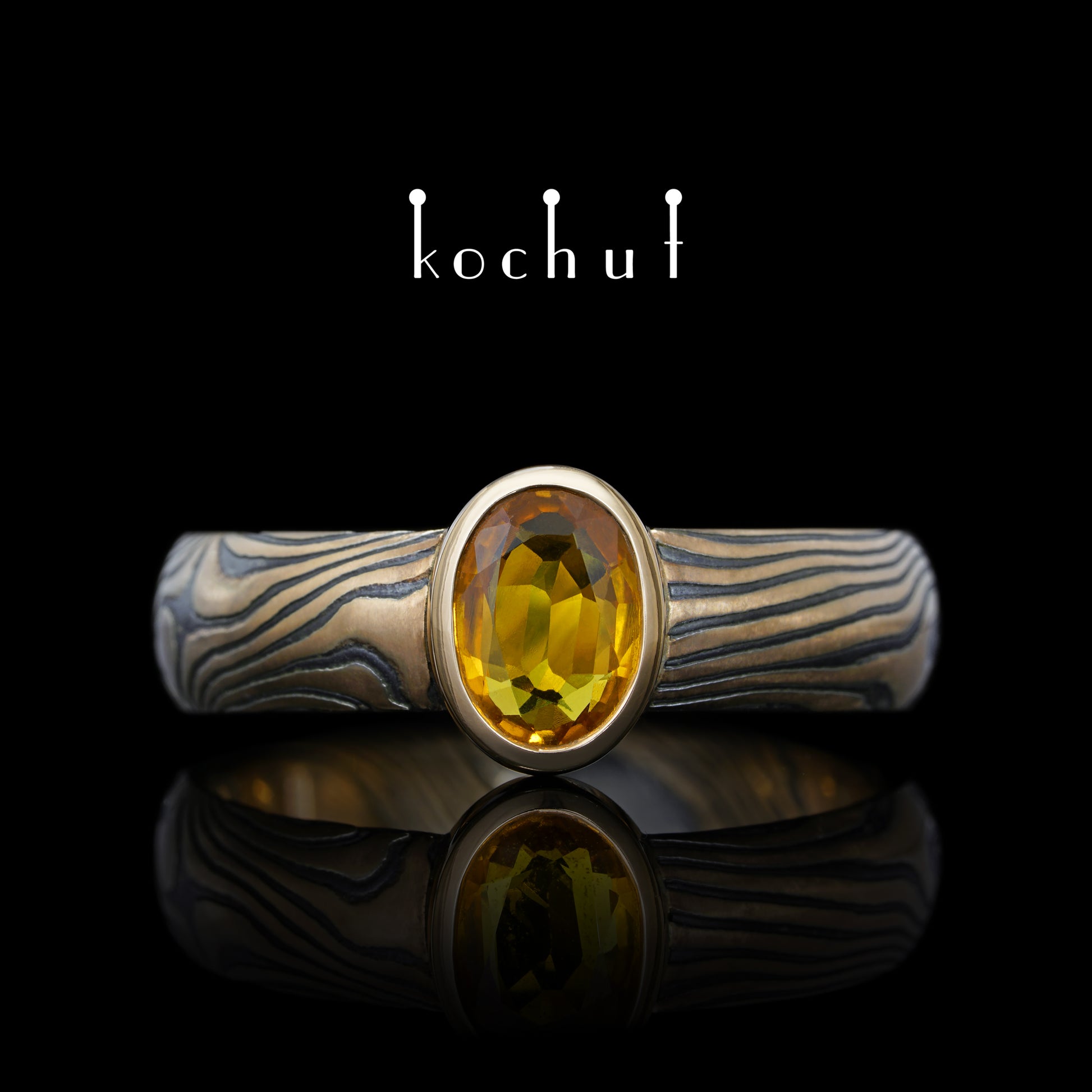 Sophora-Nektar — Mokume-Ring aus Rotgold mit graviertem und oxidiertem Silber sowie gelbem Saphir