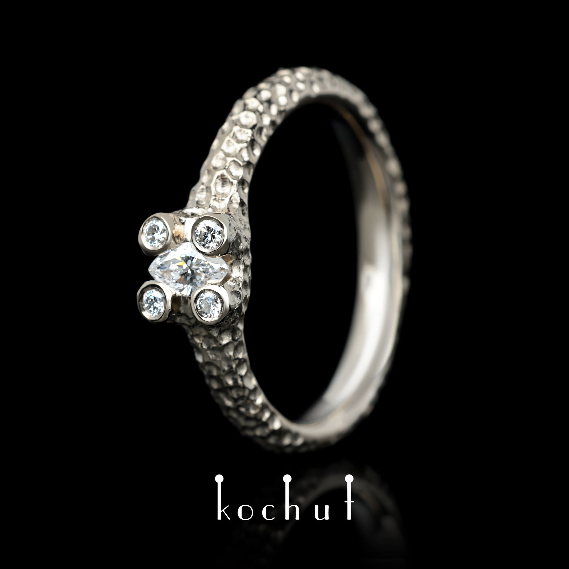 Außerdem ist der Edelstein besonders wegen seiner Form beliebt. Dank dieser wirken die Finger seines Besitzers optisch anmutiger. Und zusammen mit vier anderen Diamanten verwandelt er sich in eine Blume, die gegen die Gesetze von Zeit und Raum wächst.