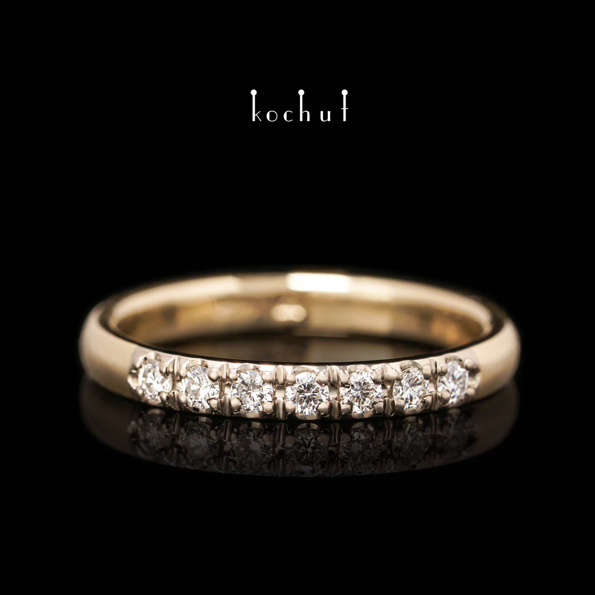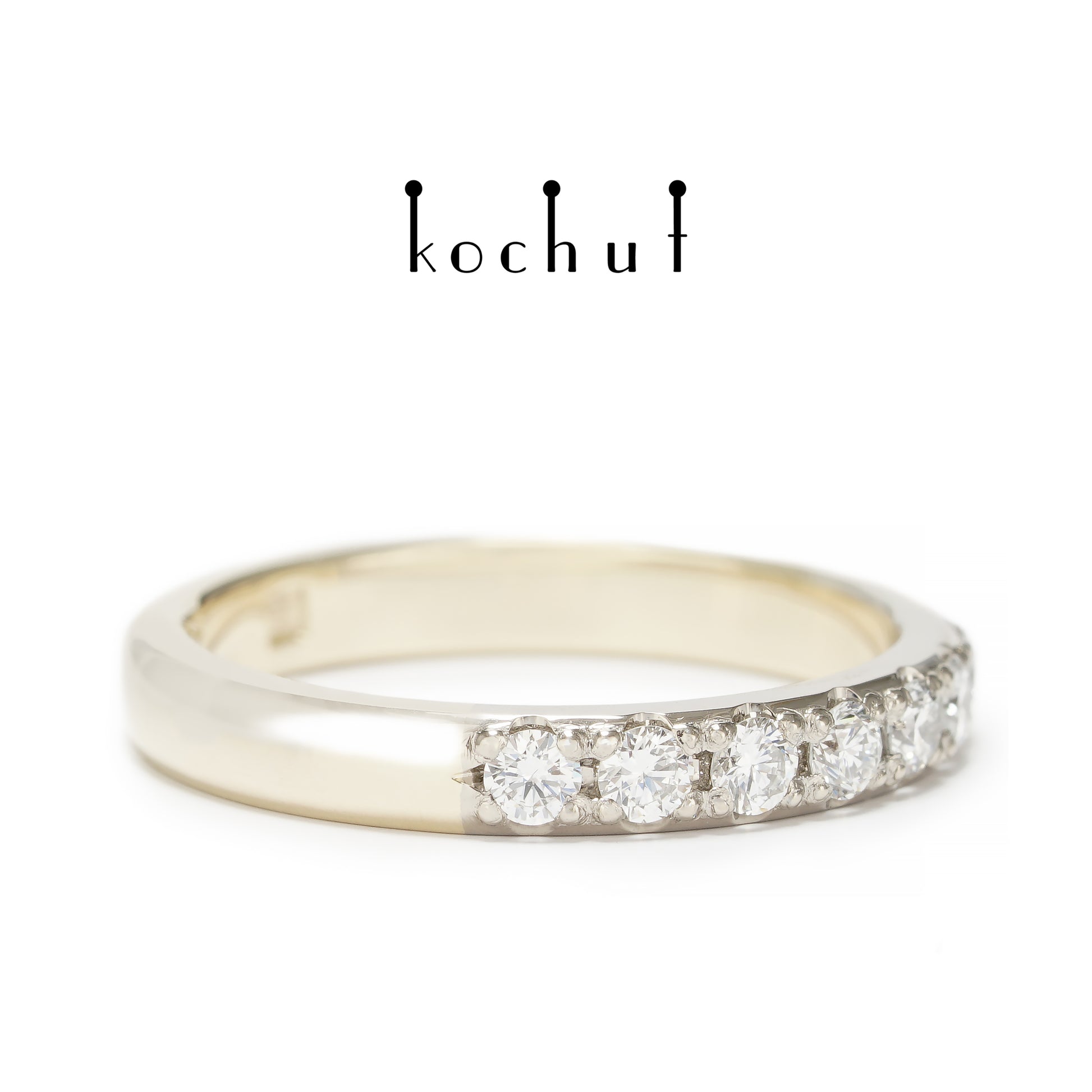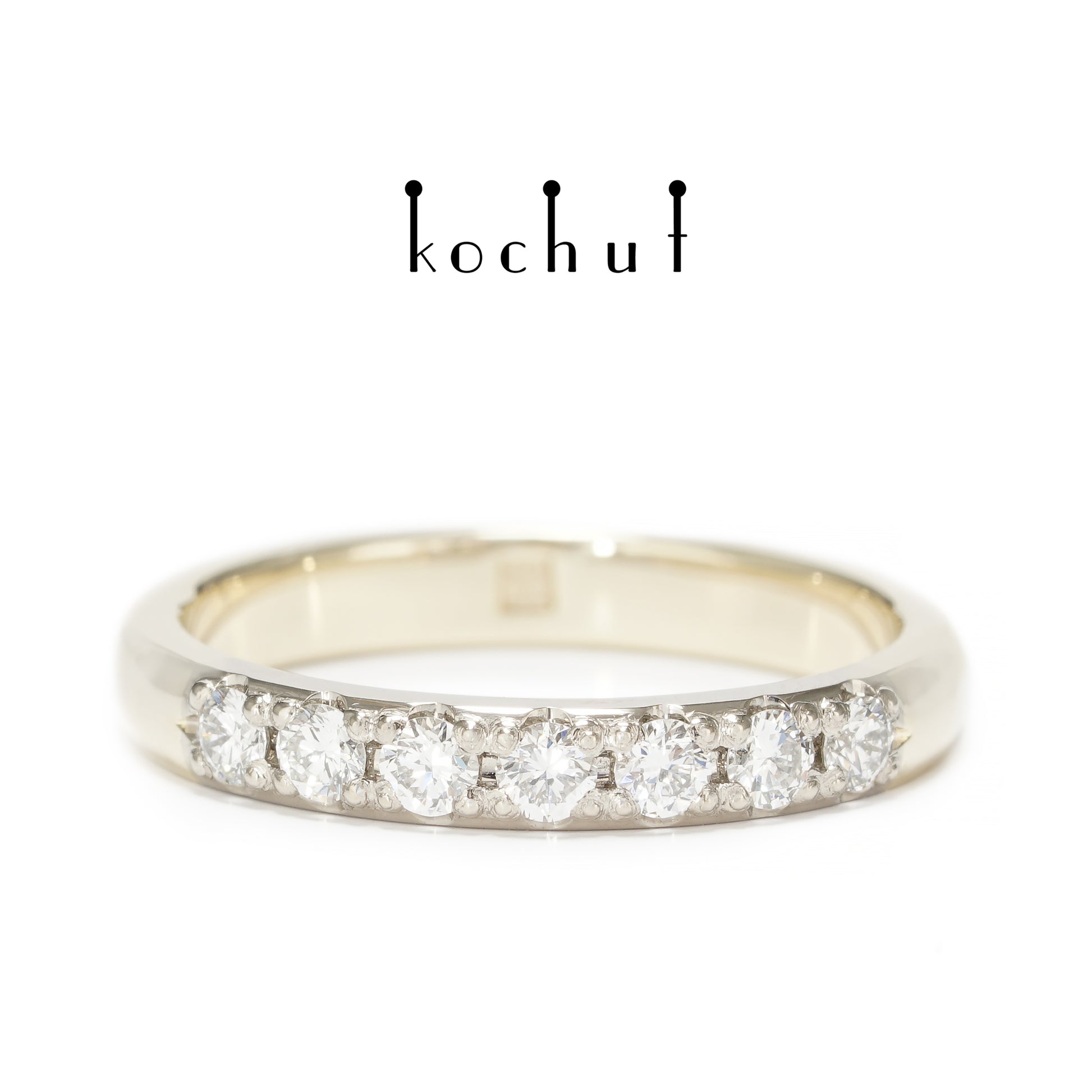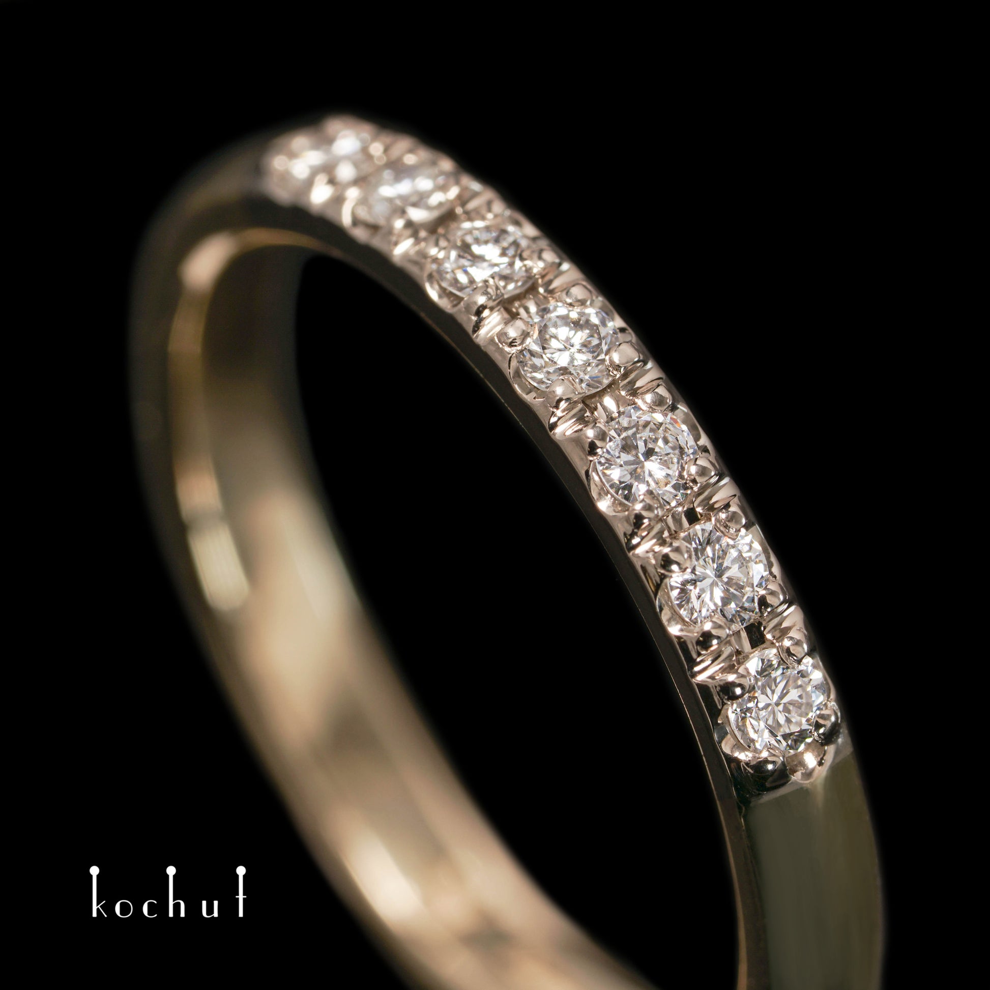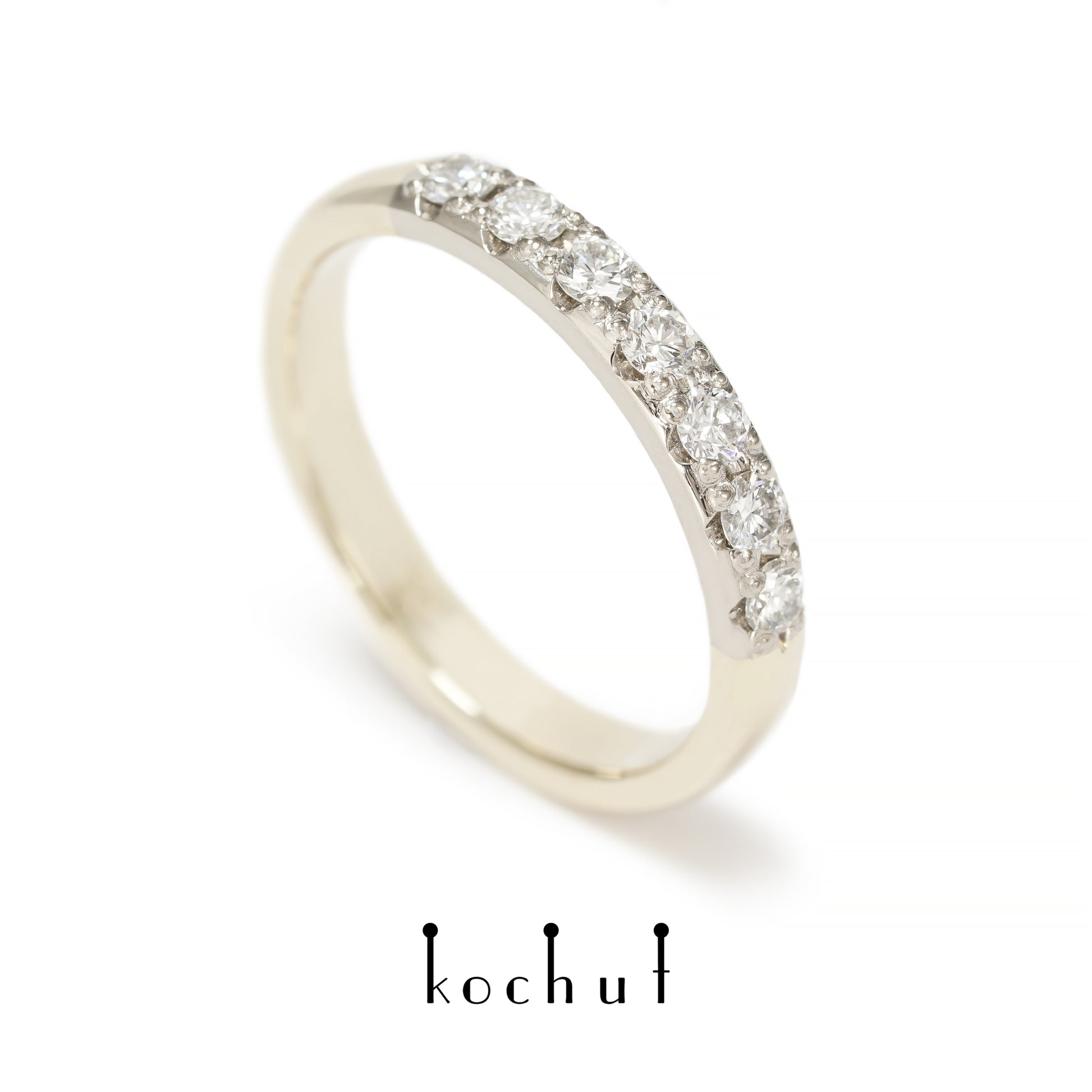 Tiefste Gefühle entstehen im Schweigen des Herzens. Und ein verliebter Mann möchte es der ganzen Welt mitteilen, manchmal ist es die klügste Entscheidung, es eine Weile geheim zu halten. Genau wie die süßesten Früchte brauchen Gefühle Zeit, um «bereit» zu werden: Sie benötigen Ruhe, um saftig, voller Wärme, Aromen und Geschmack zu werden, um Kraft zu schöpfen... Und wenn der geheimnisvolle Reifungsprozess im Inneren abgeschlossen ist, zweifeln die Liebenden nicht mehr an der Stärke ihrer Beziehung. Die Bindung zwischen Liebenden ist ein faszinierender Reifungsprozess. Sie hat viele Phasen und Schritte. Kennenlernen, Freundschaft, Hingabe, erstes «Ich liebe dich», Charaktere abgleichen, testen und Vertrauen gewinnen, Heiratsantrag, Verlobung, Hochzeit, Familienleben (das ebenfalls viele Schritte umfasst)!... Deshalb glauben wir, dass jede dieser unvergesslichen Phasen es wert ist, von beiden lange in Erinnerung behalten zu werden. Natürlich werden ihre Herzen einzigartige Momente in ihren geheimen Kammern bewahren, und wir helfen Ihnen, die besonderen Symbol- Erinnerungen an jeden wichtigen Meilenstein Ihrer Beziehung auszuwählen. Ein «Subtile Untertöne»-Ring kann ein elegantes und ausdrucksstarkes Geschenk sein. Ein Zeichen. Ein Symbol. Ein Ausdruck der Liebe, die manchmal so schwer zu offenbaren ist, aber so sehr gewünscht wird, zu teilen! Dieser Ring ist ein perfektes Geschenk für das Mädchen, das immer in Ihren Gedanken, Plänen und Träumen ist. Sieben atemberaubende Diamanten und der authentische Legierungs-Einsatz aus Palladium-Gold machen dieses Schmuckstück wirklich exquisit und besonders. Das elegante, schlichte Design wird sicherlich das Herz selbst der anspruchsvollsten Schönheit erobern.