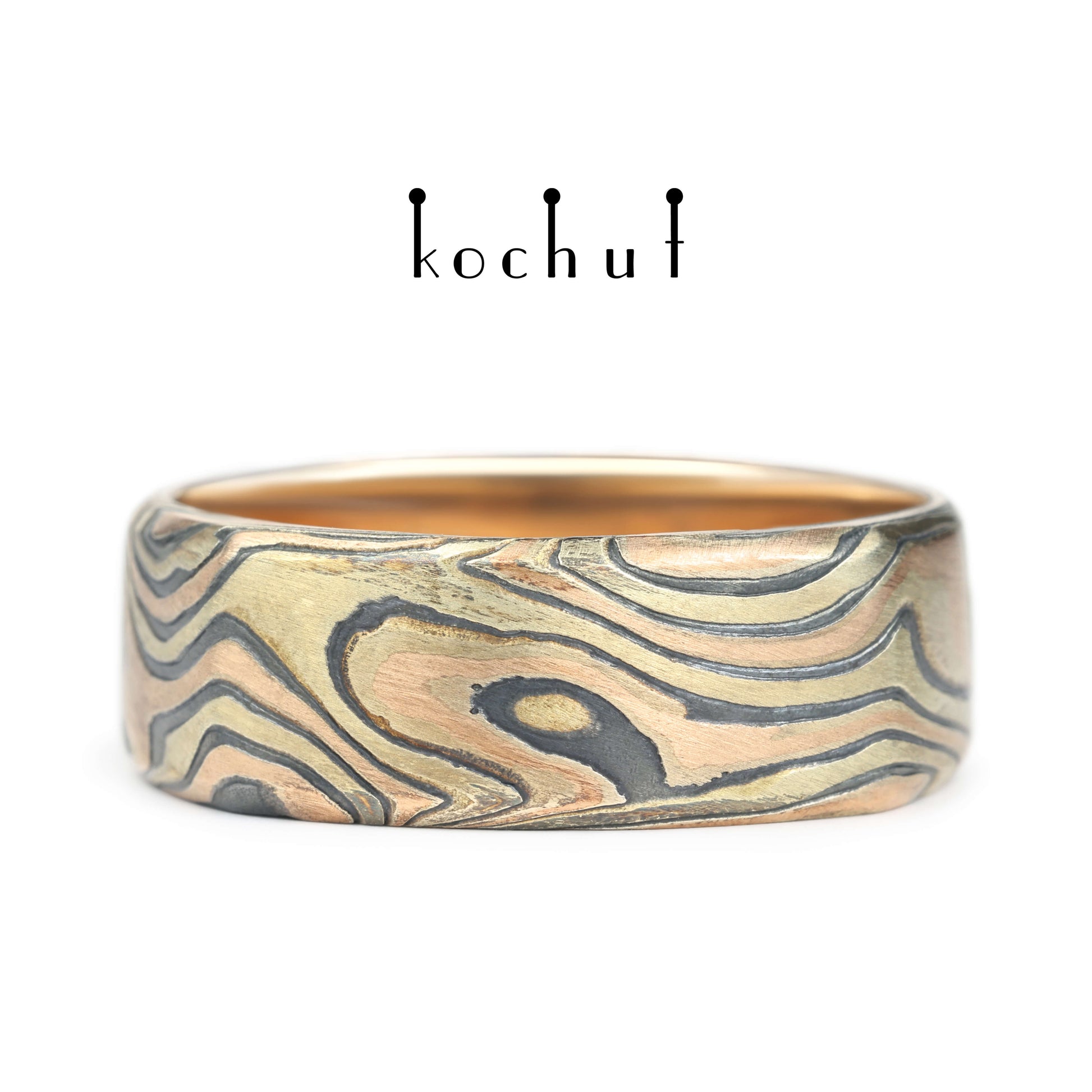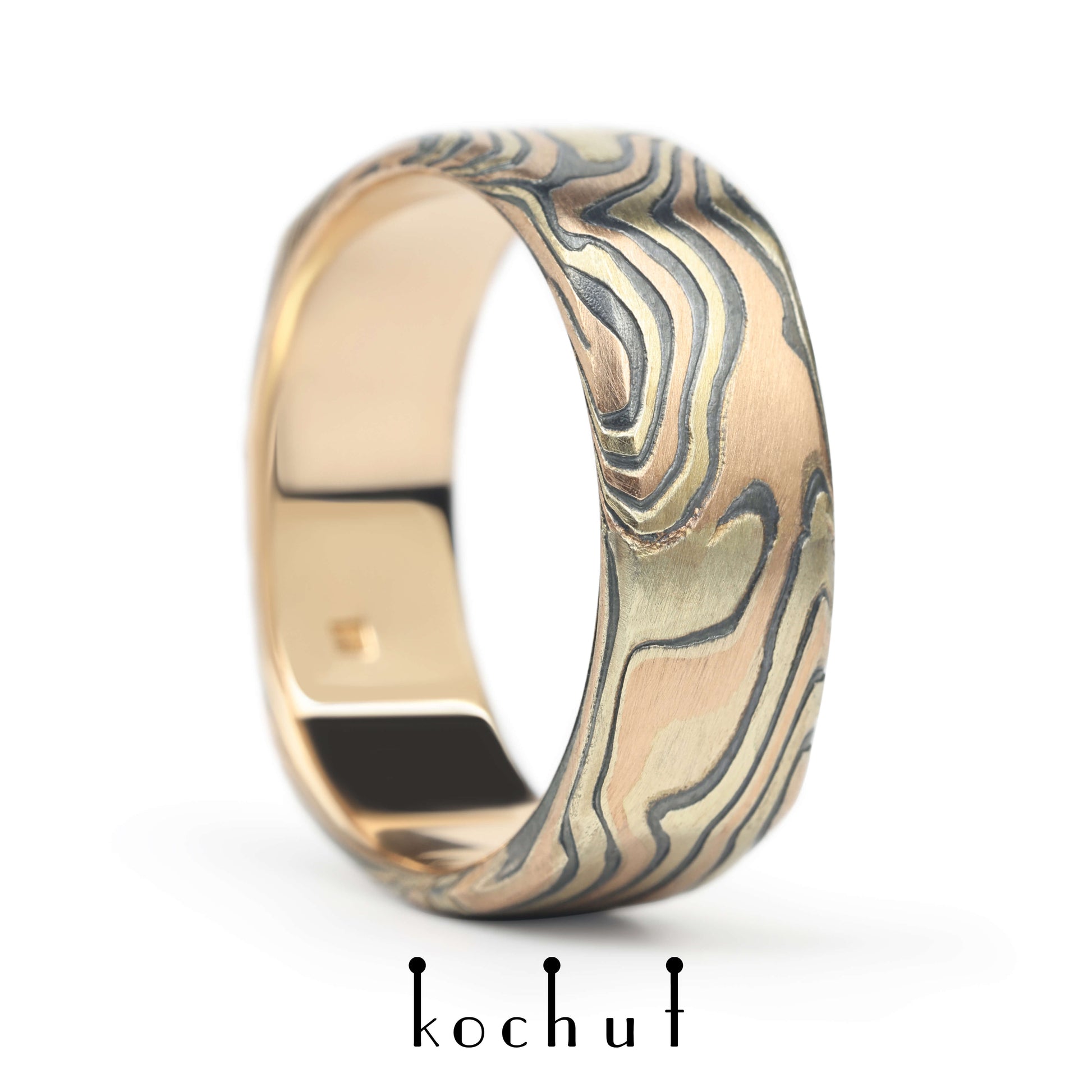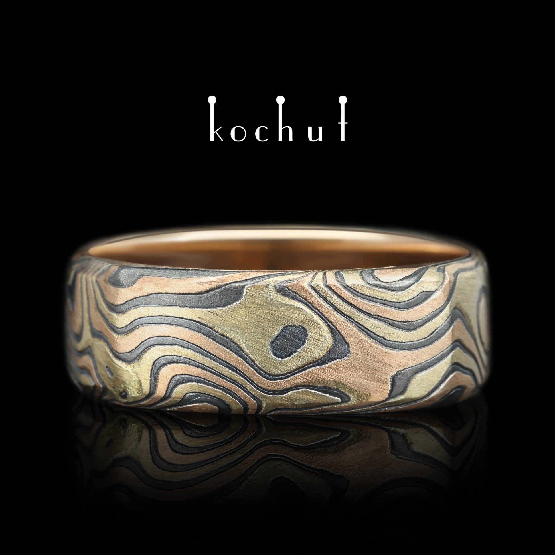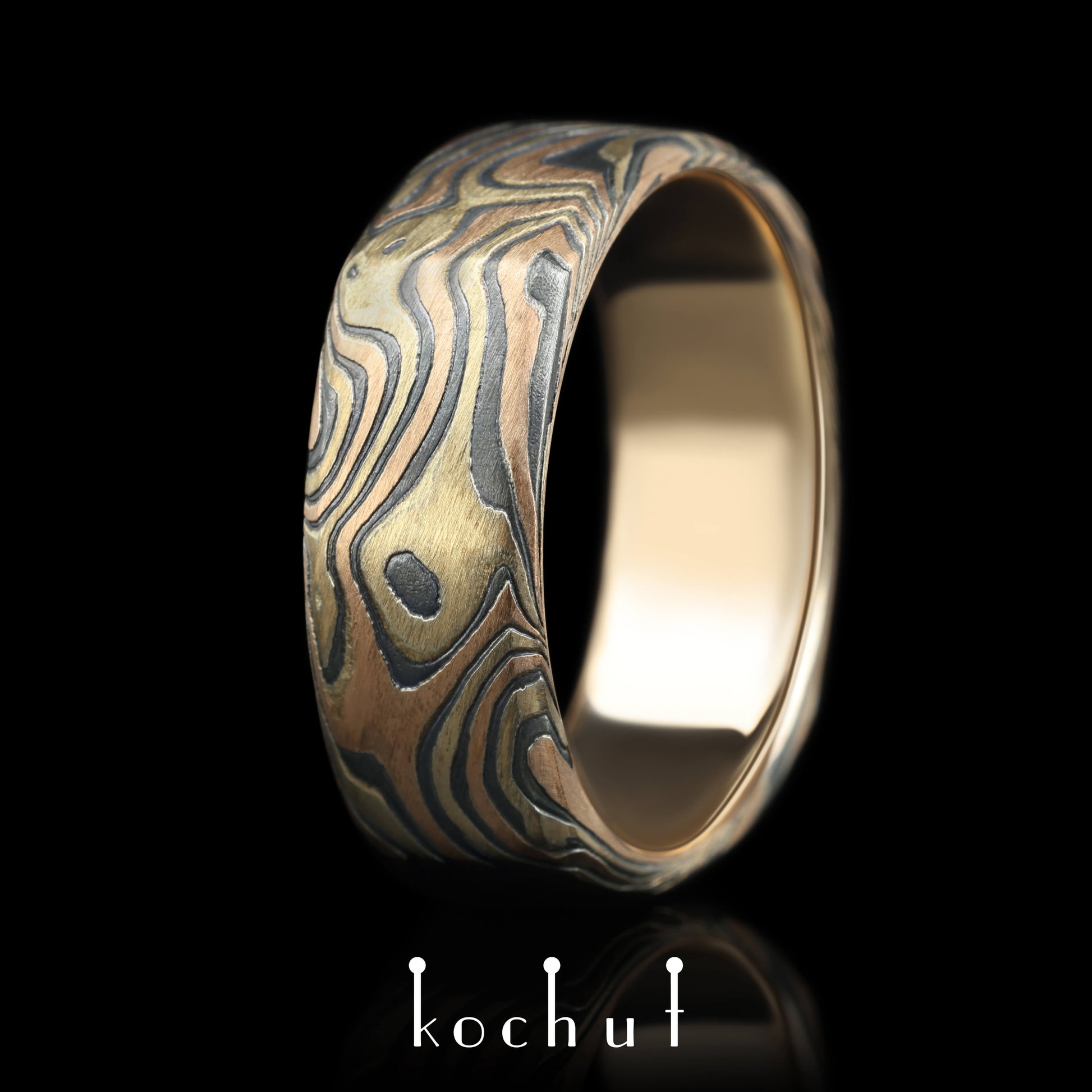 Tenno — Mokume-Ring aus Rotgold, Gelbgold, graviertem und oxidiertem Silber
