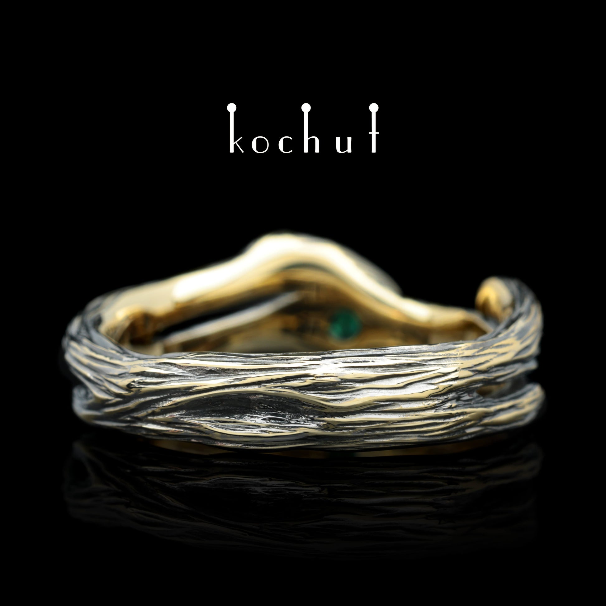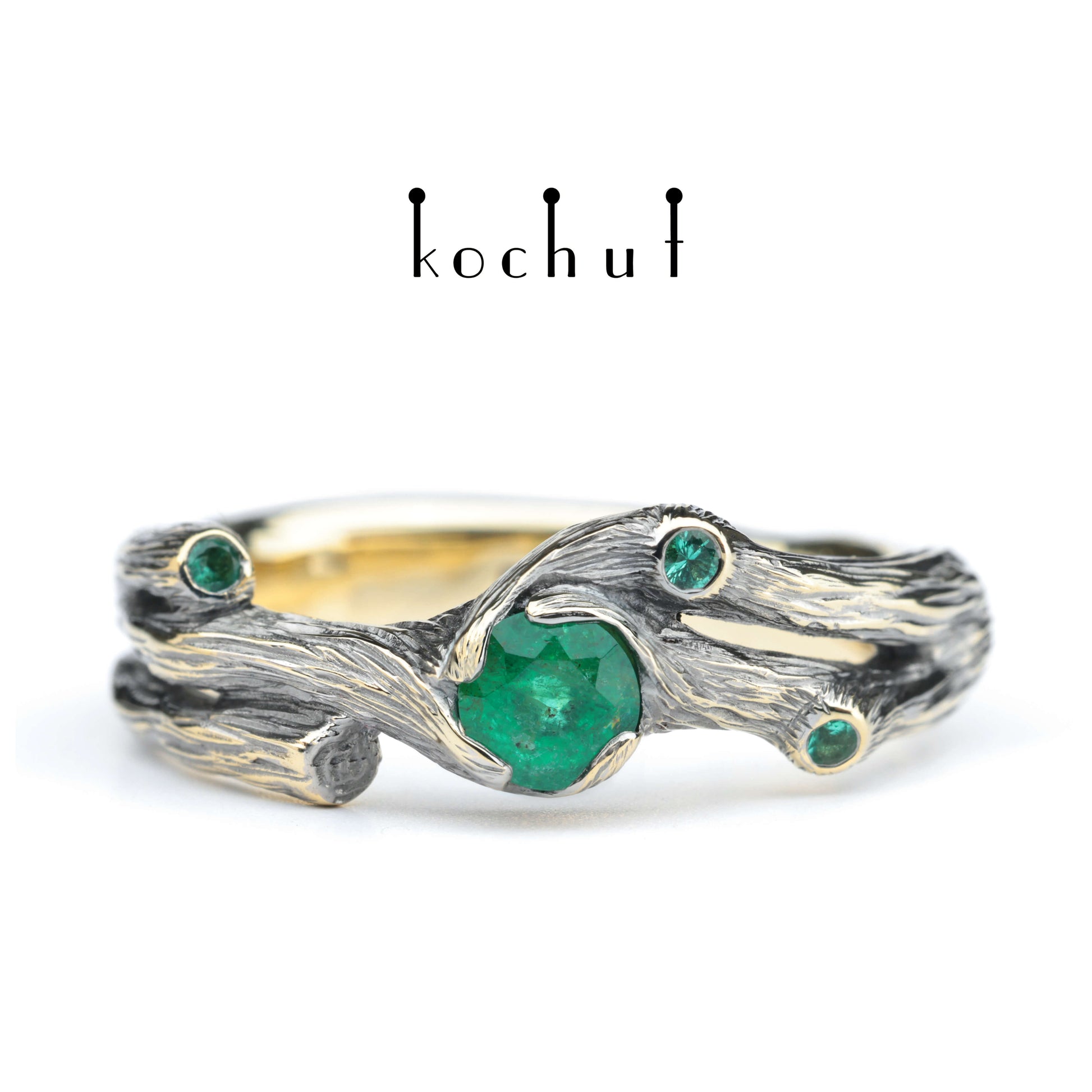 Zweig — Ring aus Gelbgold mit Smaragden, überzogen mit schwarzem Rhodium
