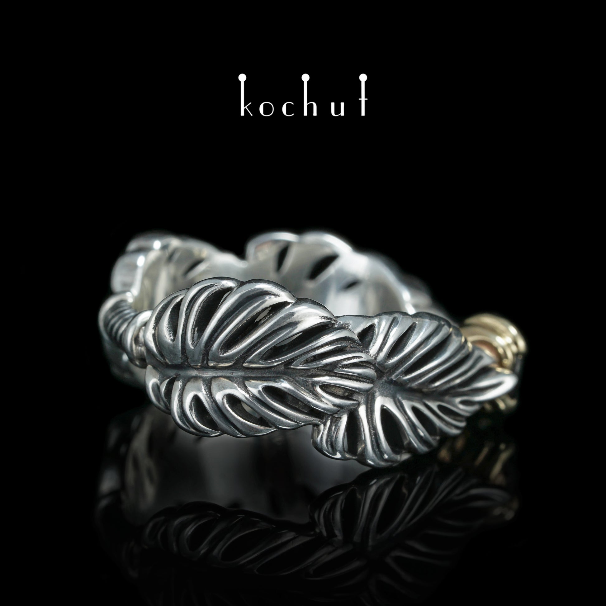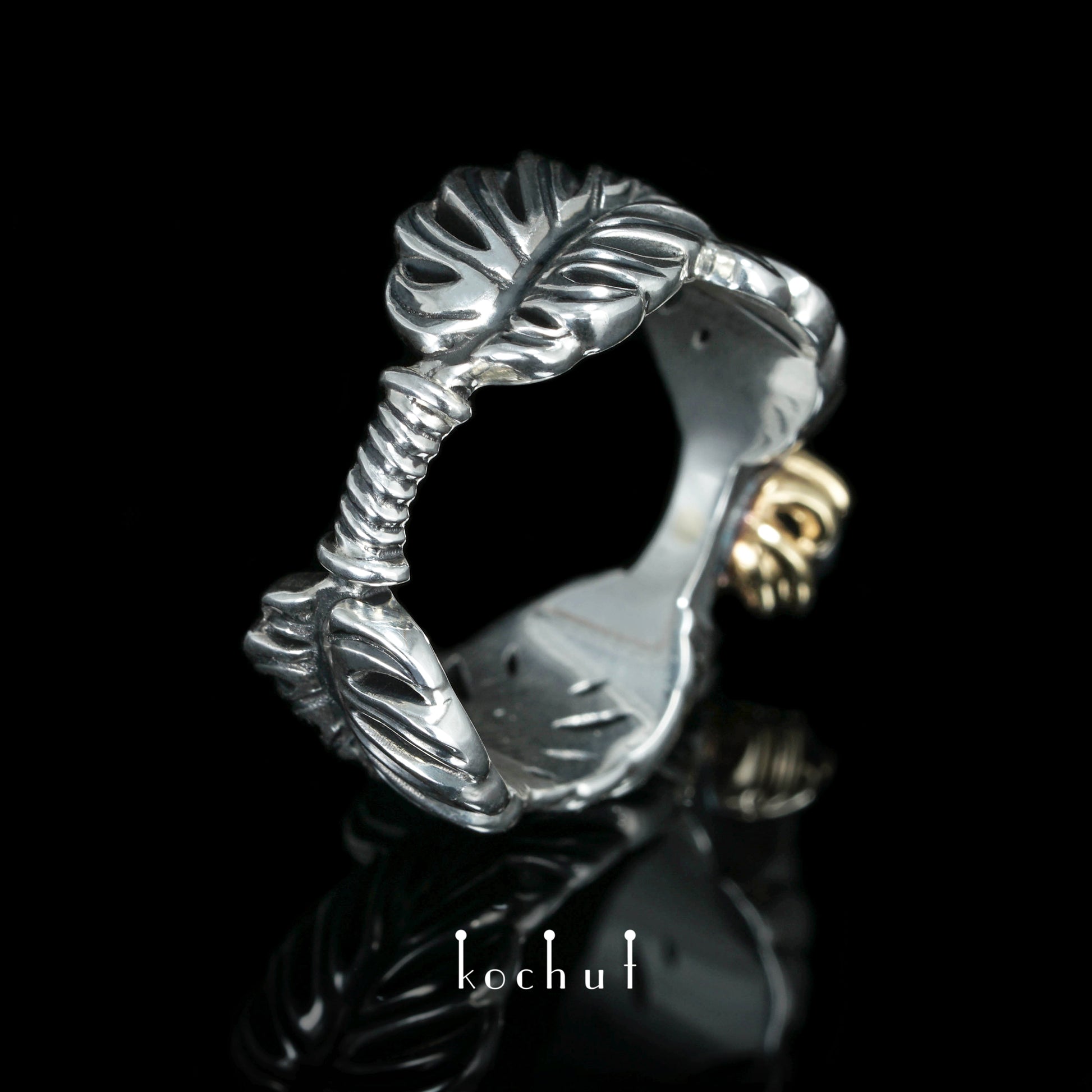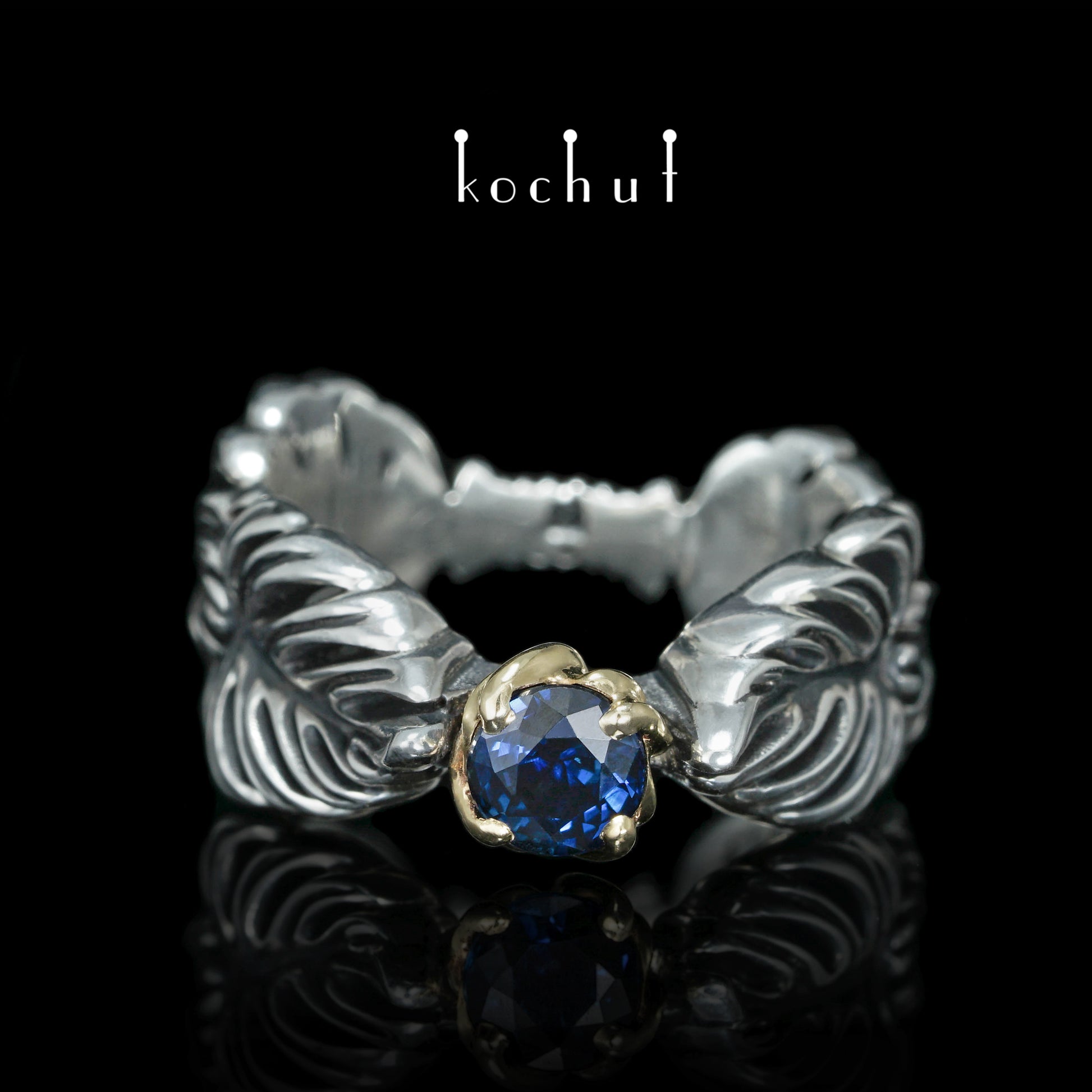 Umarmung der Liane — Ring aus oxidiertem Silber und Gelbgold mit Saphir