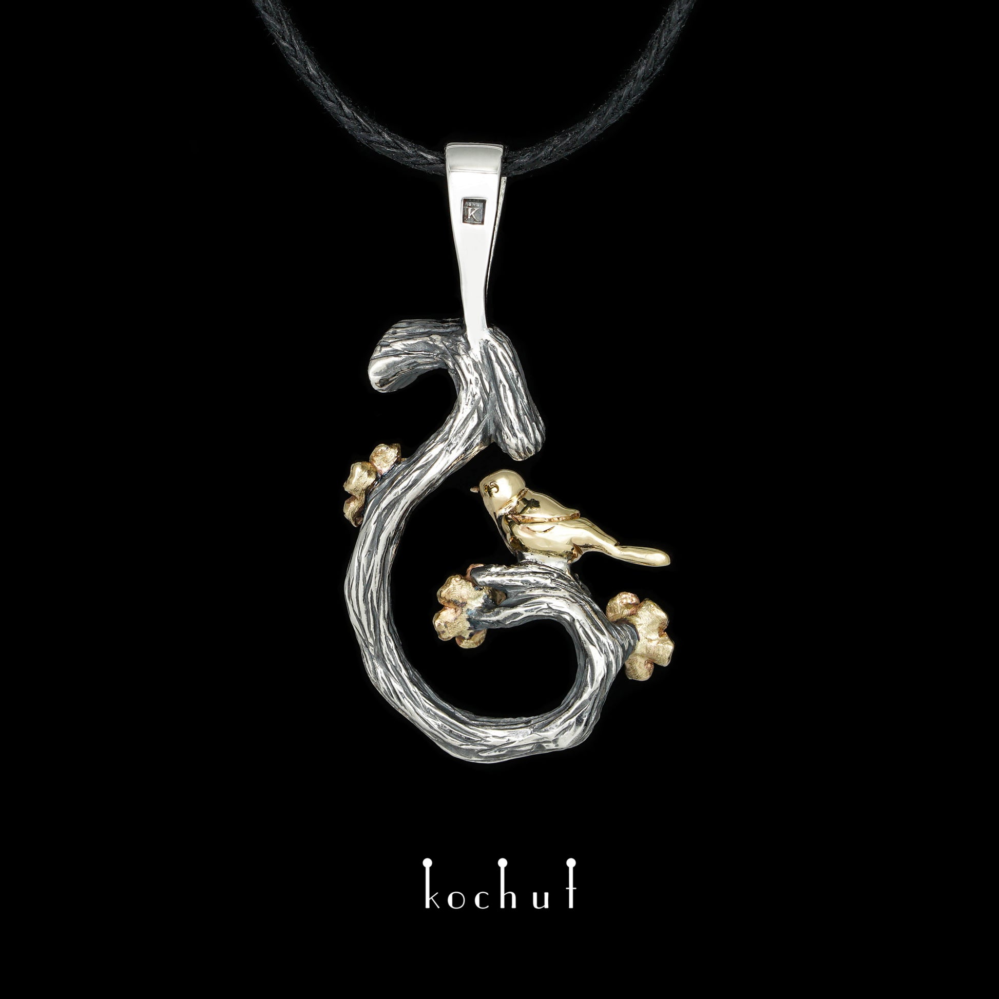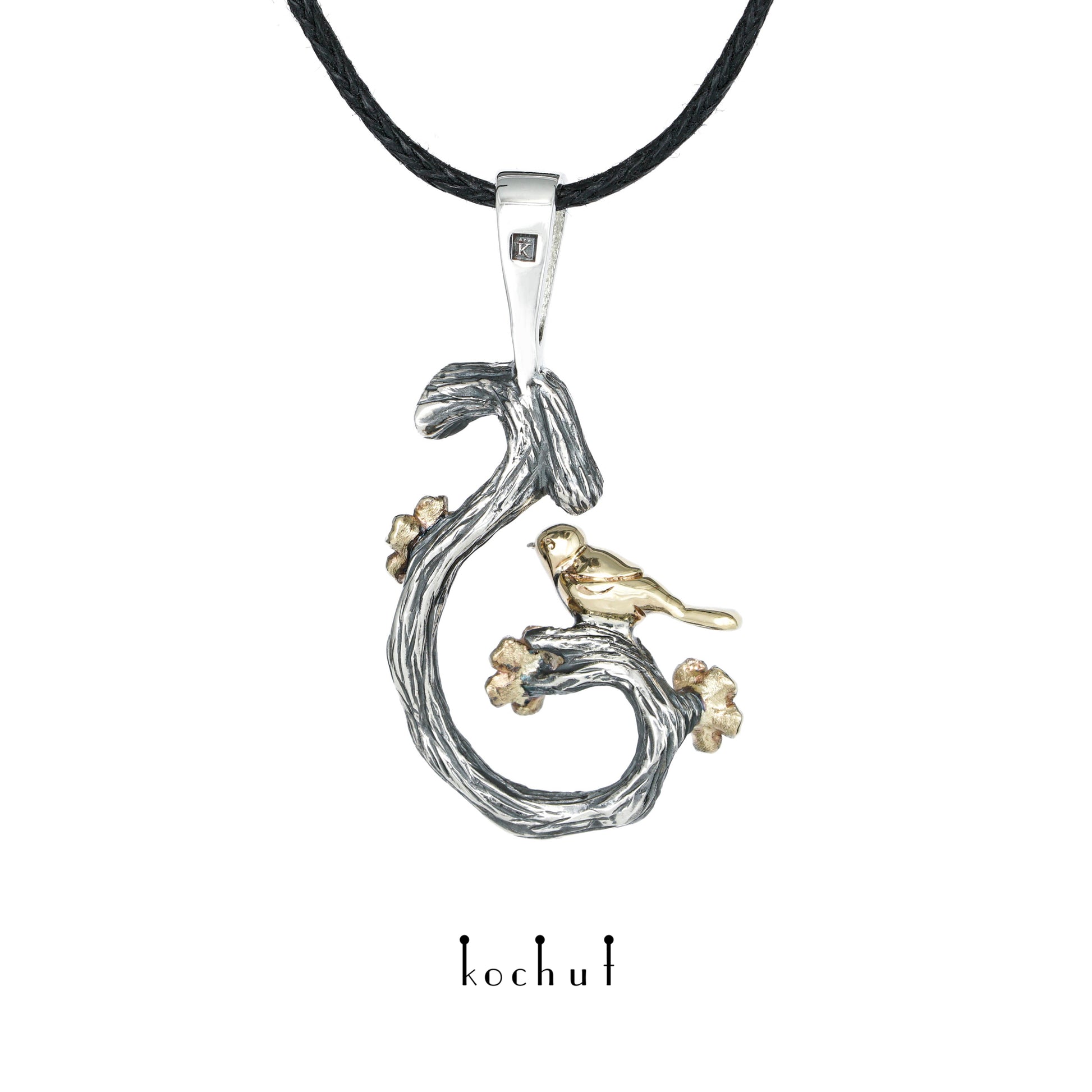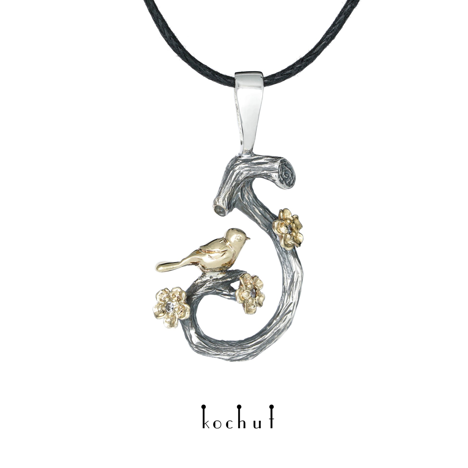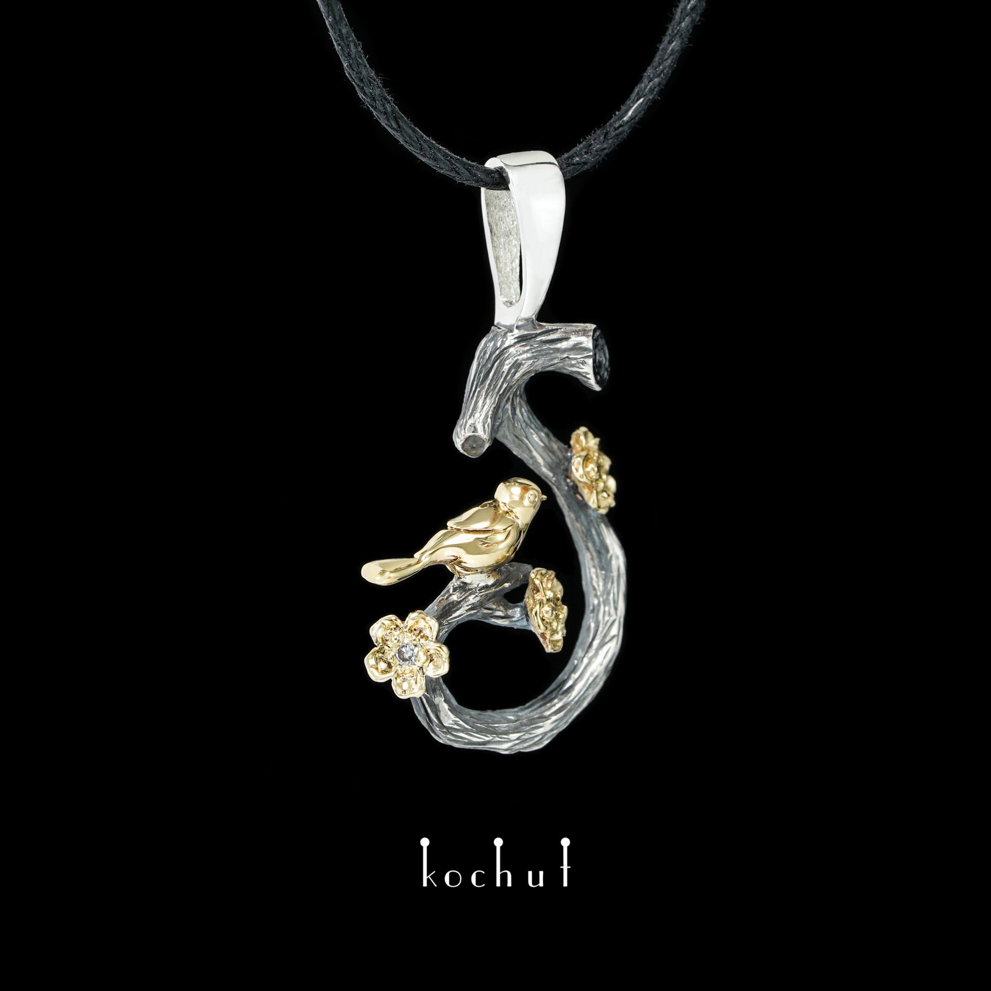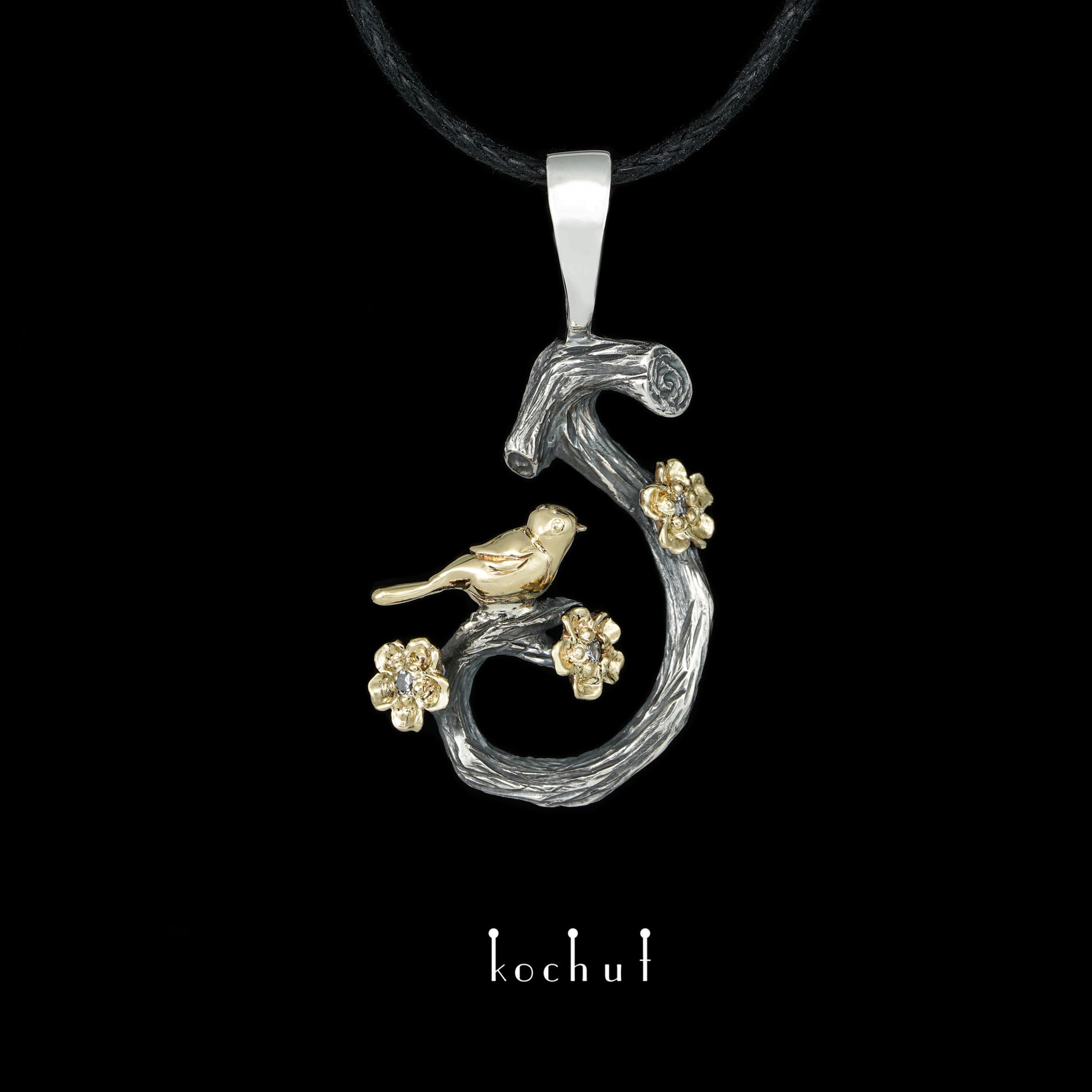 Vogel auf einem Zweig: Frühling — Anhänger aus oxidiertem Silber und Gelbgold mit Diamanten