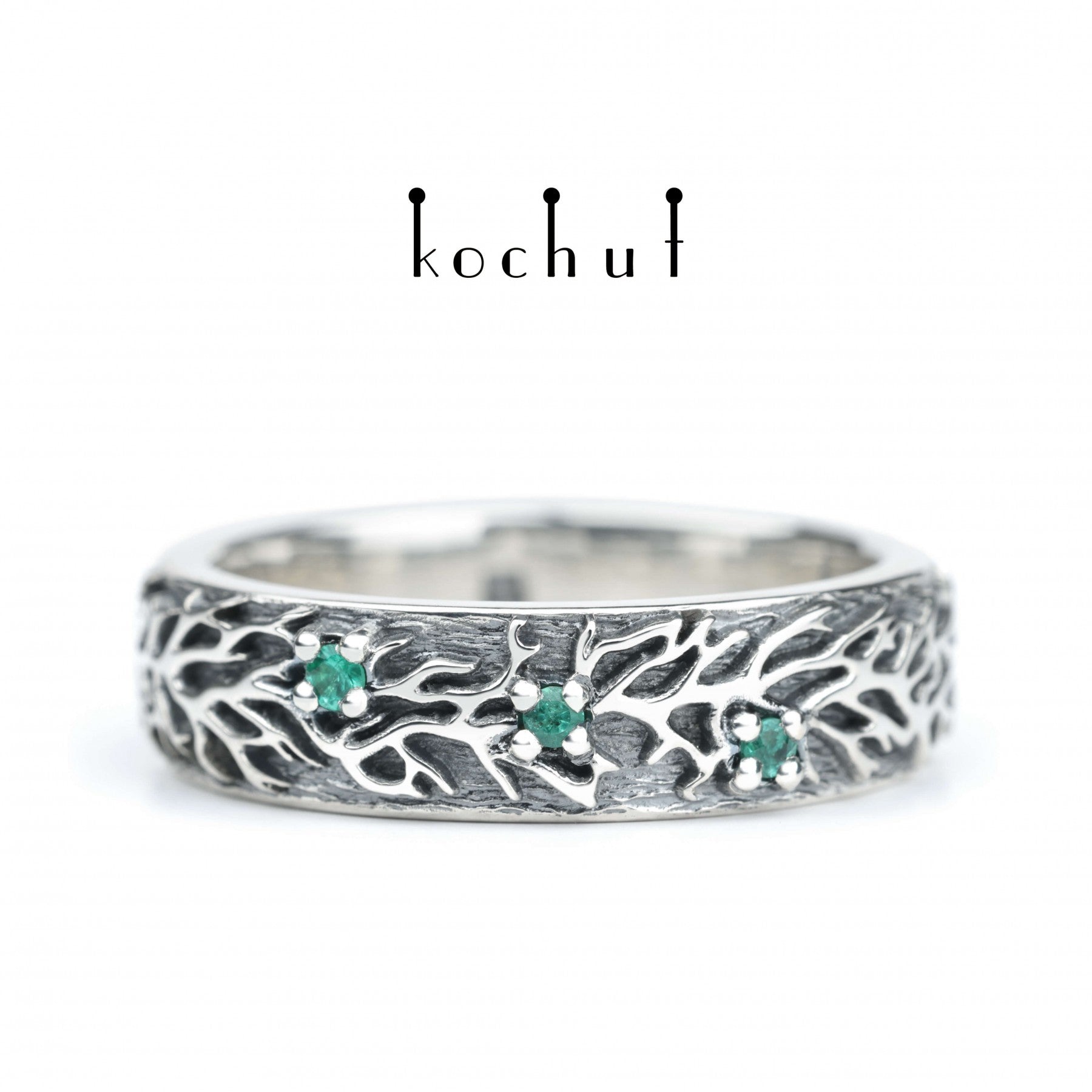 Wir haben den unglaublich zarten silbernen Ehering „Wald“ für Ihre außergewöhnliche Zeremonie geschaffen. Sie sind mit Smaragden verziert.