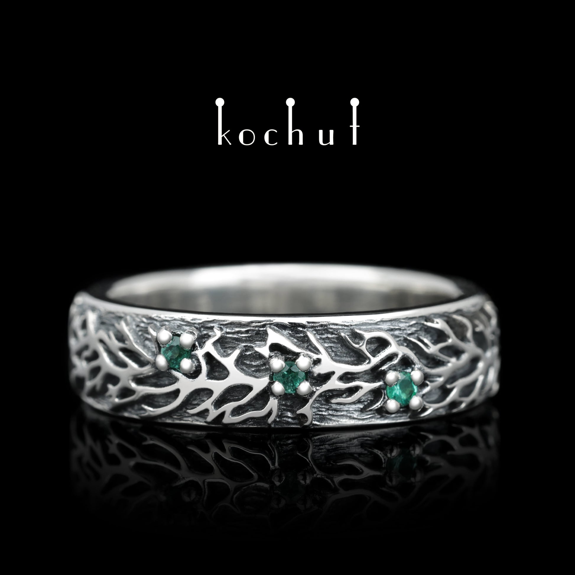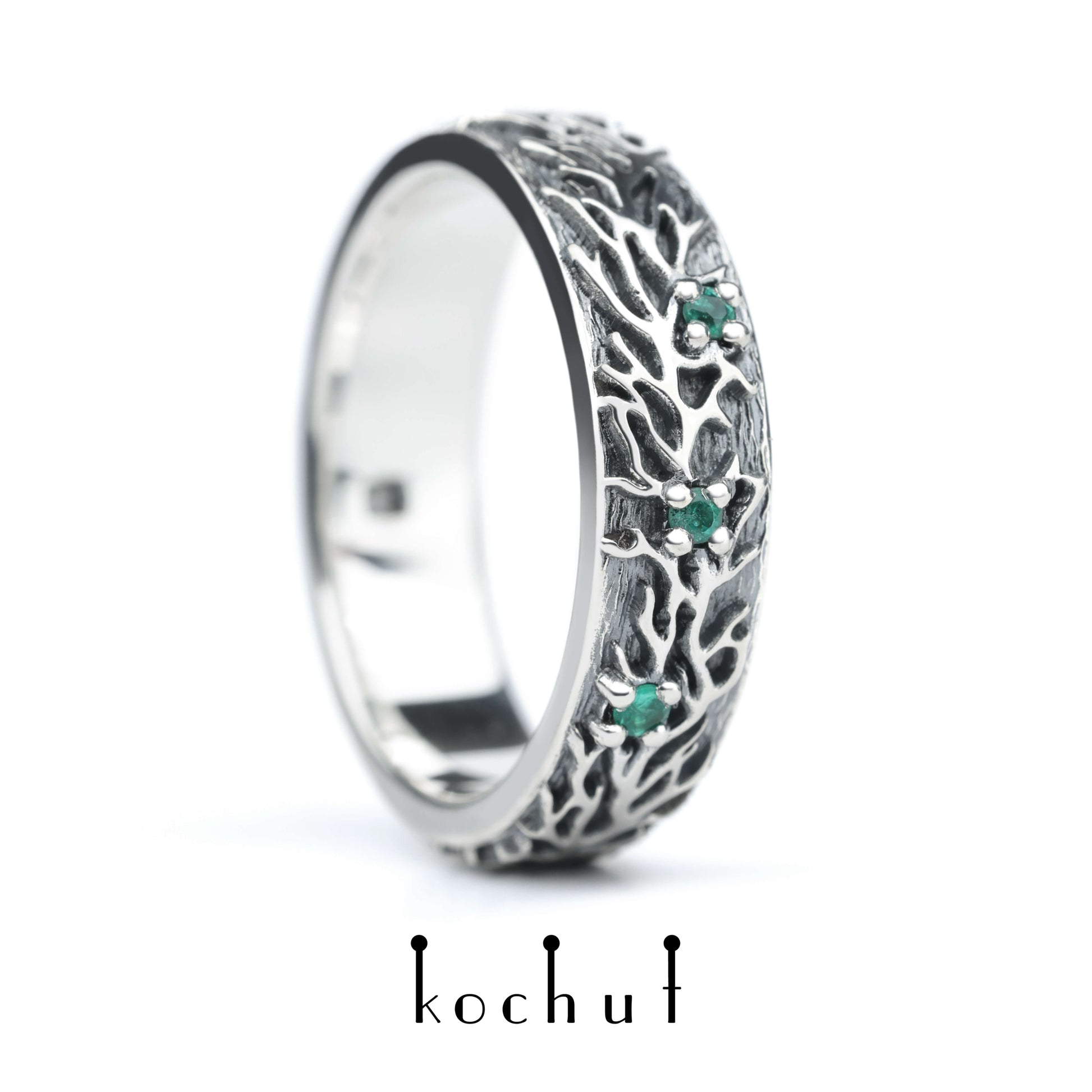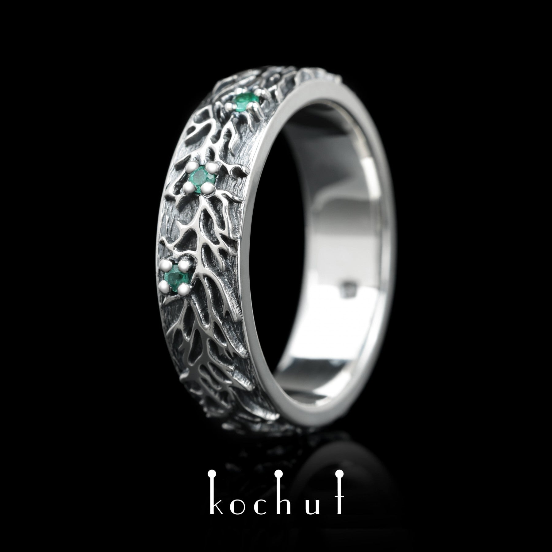 Wald — Ehering aus oxidiertem Silber mit Smaragden