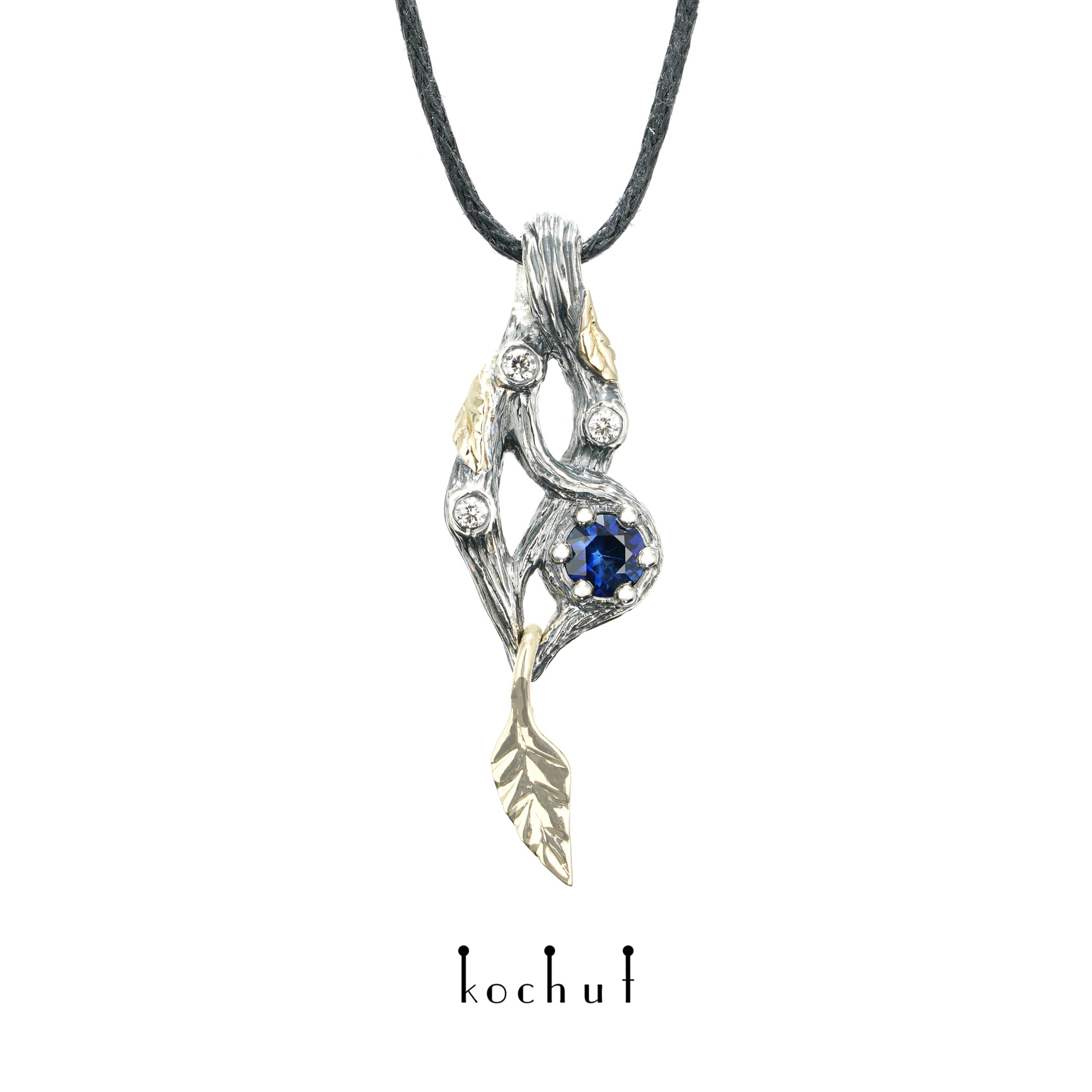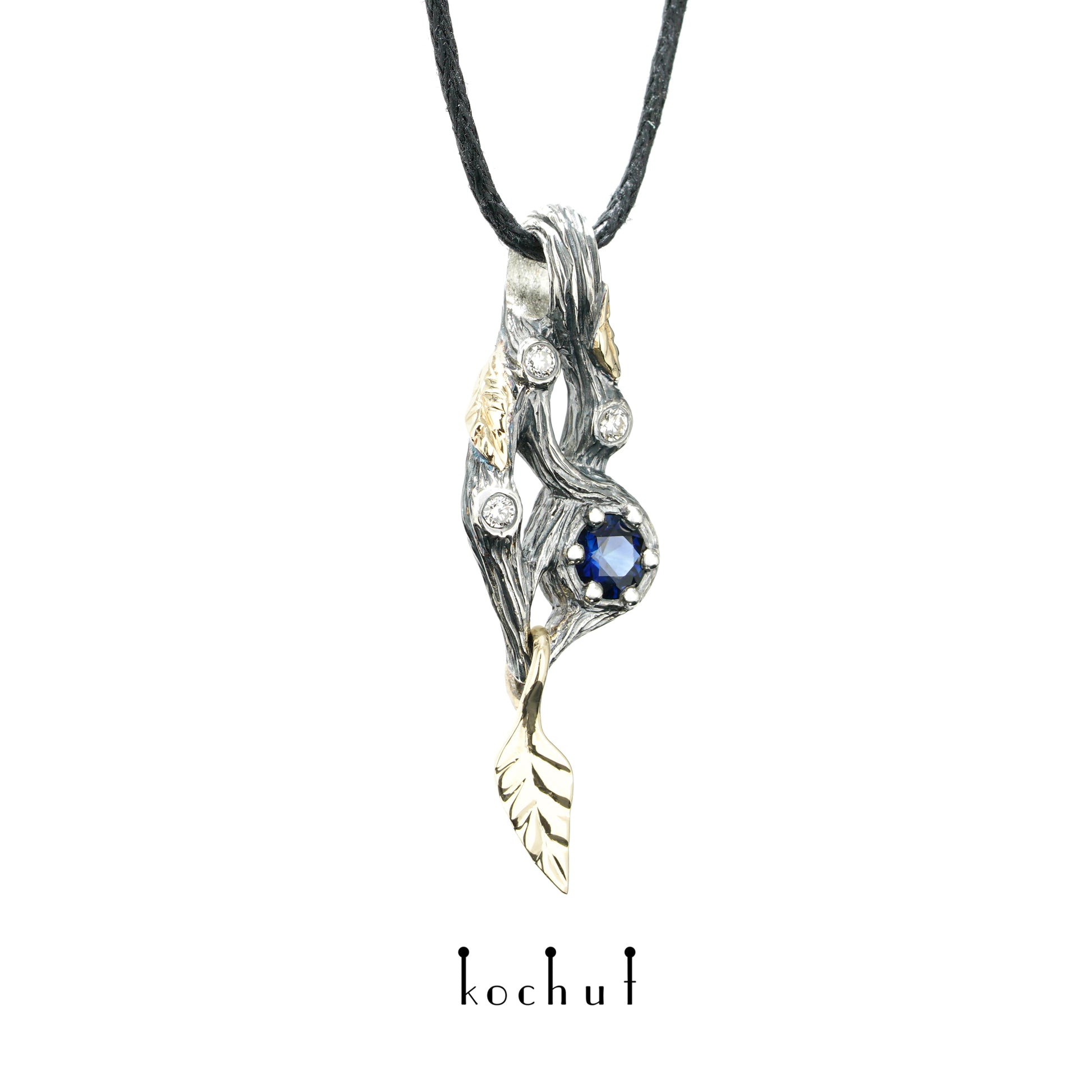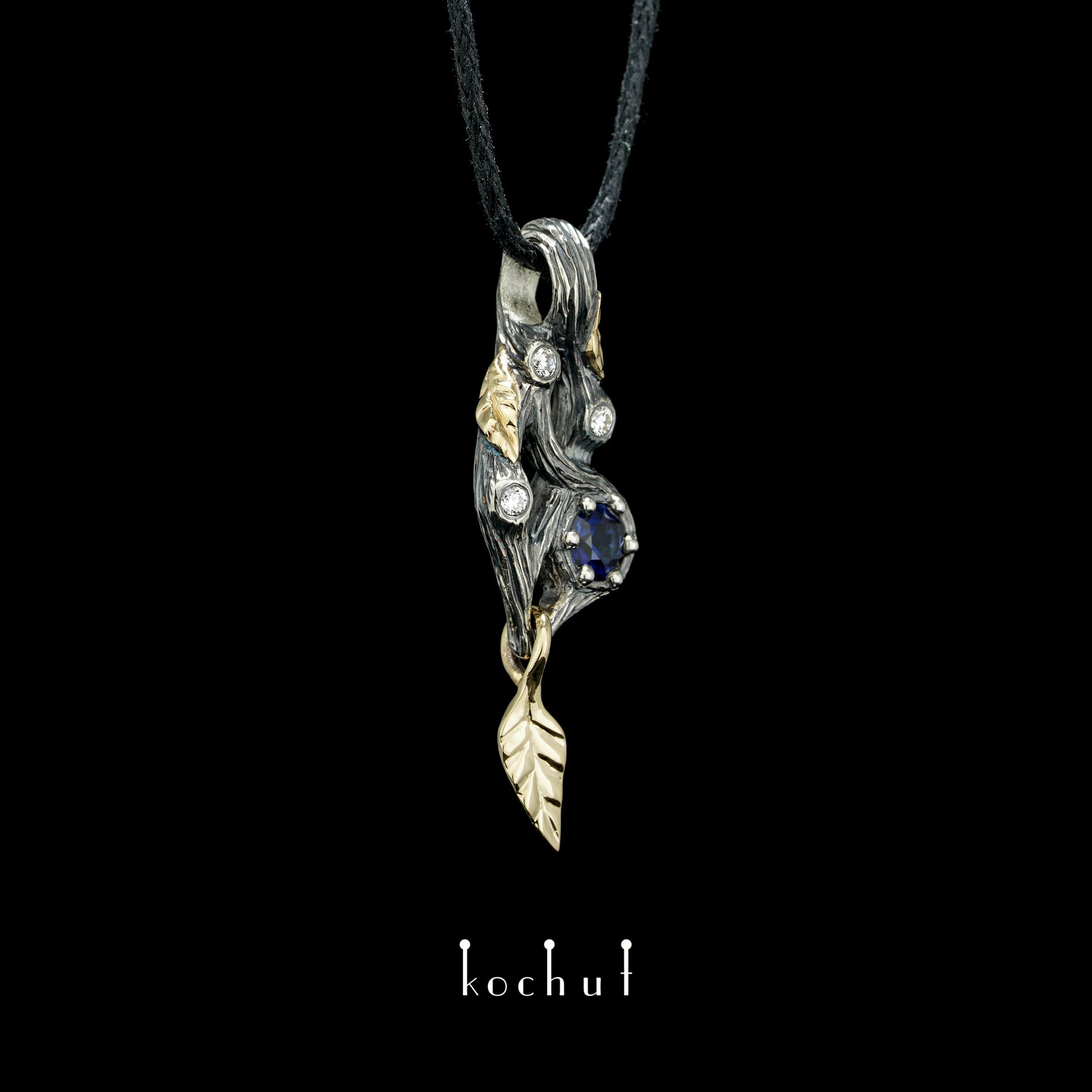 Waldfee — Anhänger aus oxidiertem Silber und Gelbgold mit Saphir und Diamanten