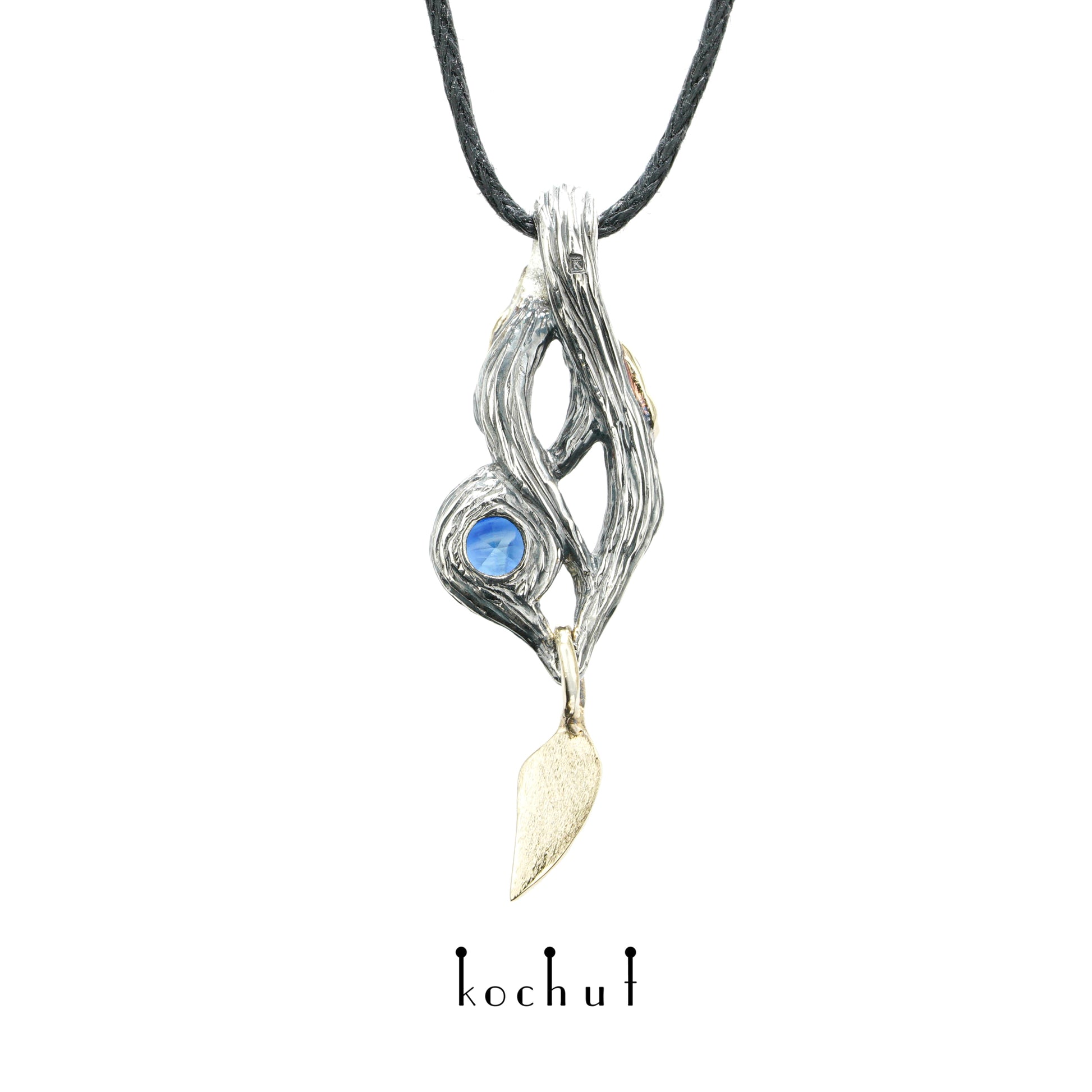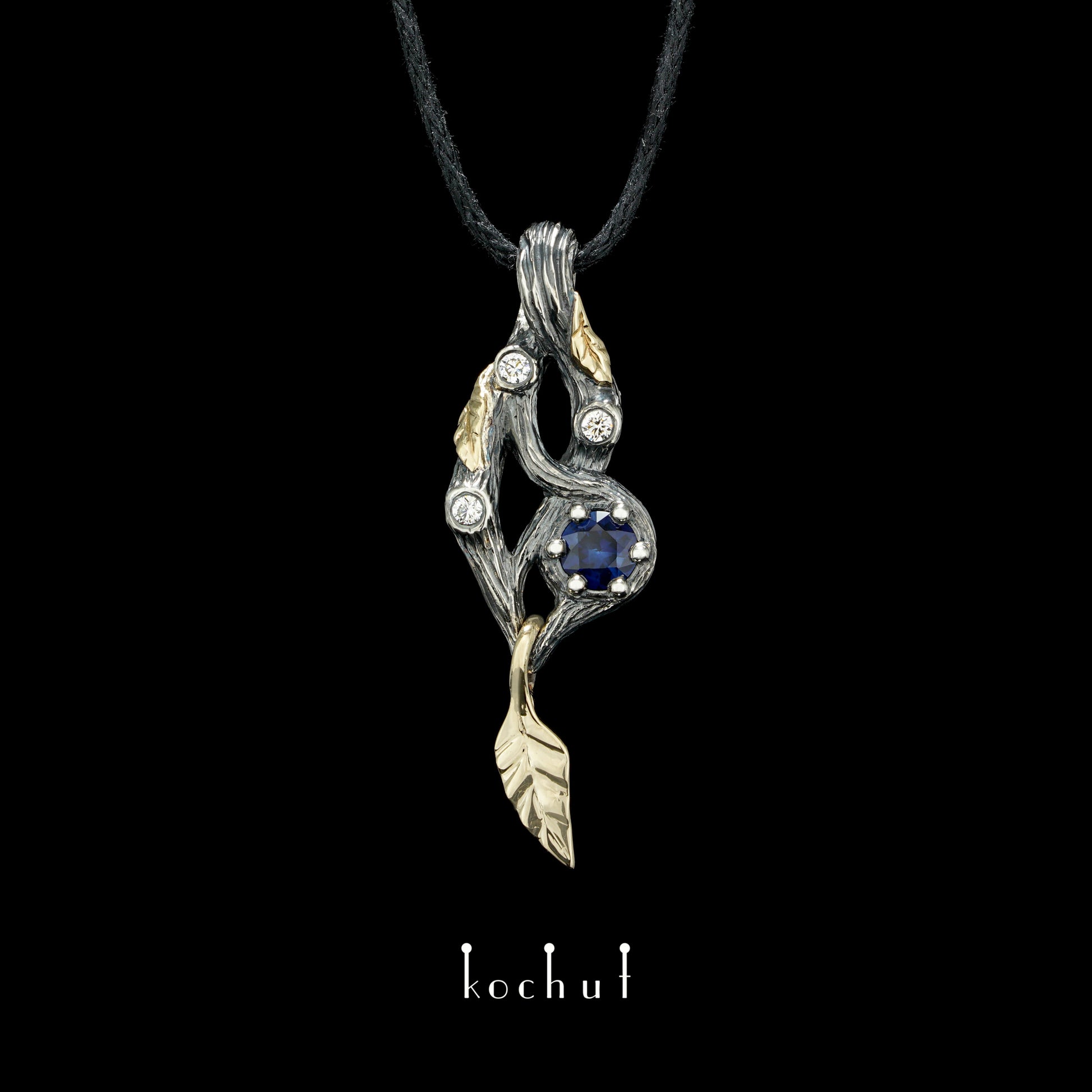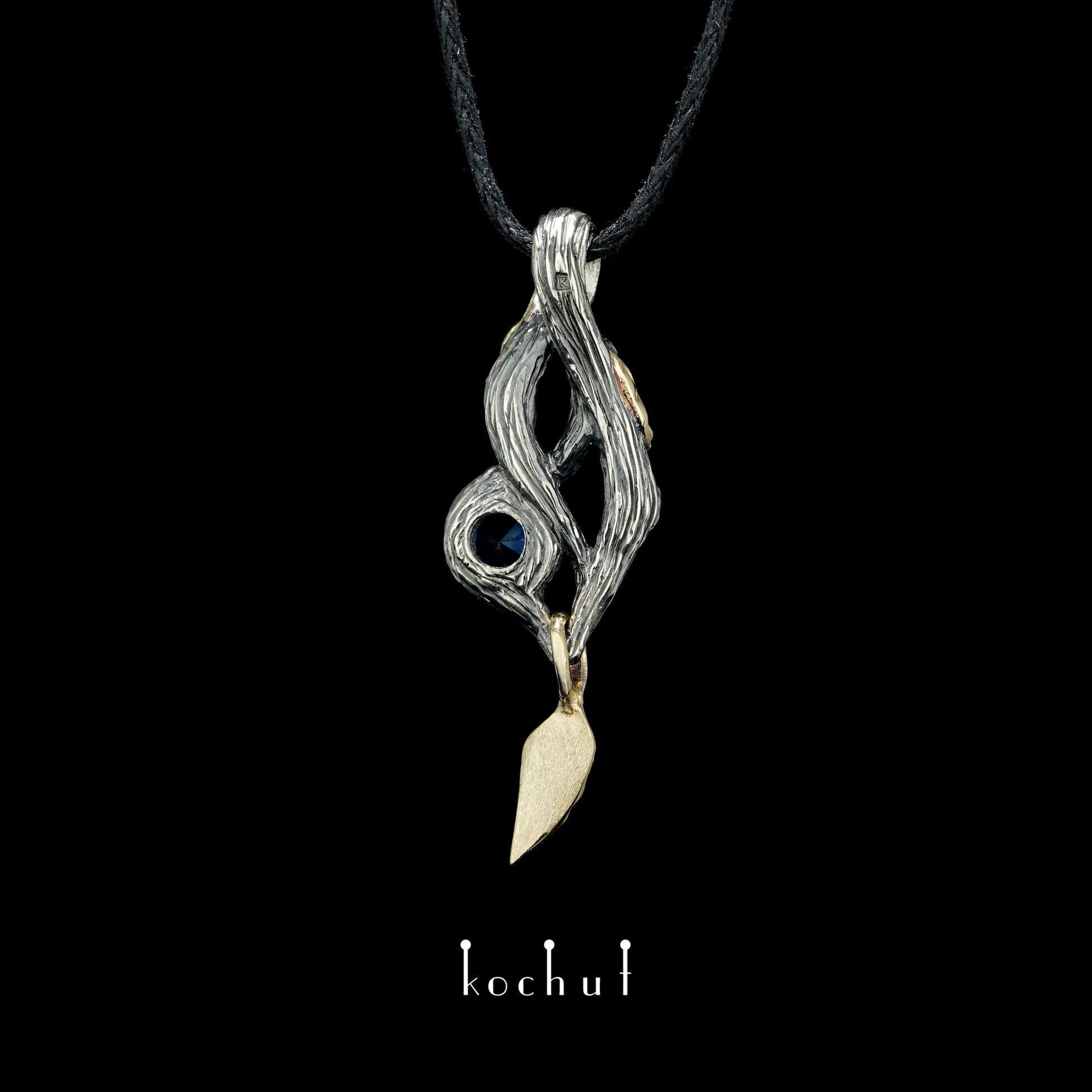 Waldfee — Anhänger aus oxidiertem Silber und Gelbgold mit Saphir und Diamanten