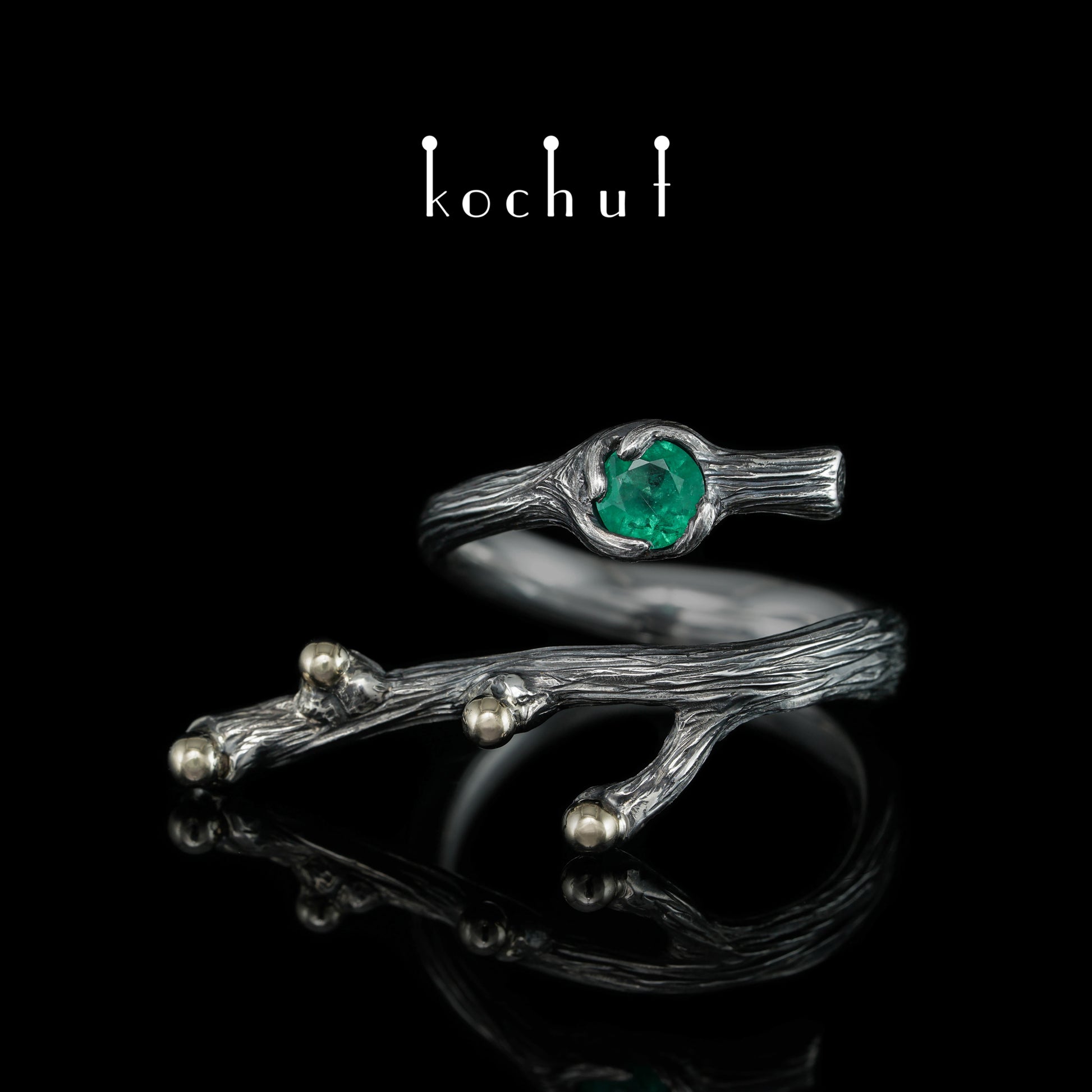 Der „Waldzweig“-Ring. Der Grundring ist eine Anspielung auf unser berühmtes Modell „Vogel auf einem Zweig“, nur dass wir in diesem Fall den Vogel durch einen wundervollen Smaragd ersetzt haben. Silber, Oxidation. Ein flexibler Zweig, der die Flüsse des Fingers mühelos folgt.