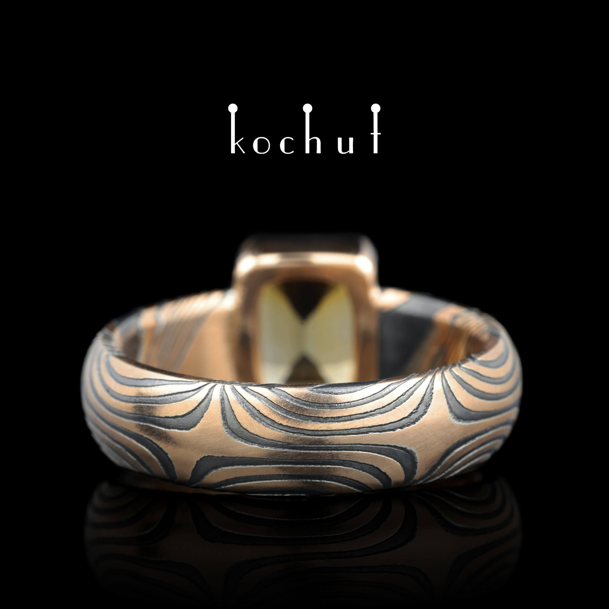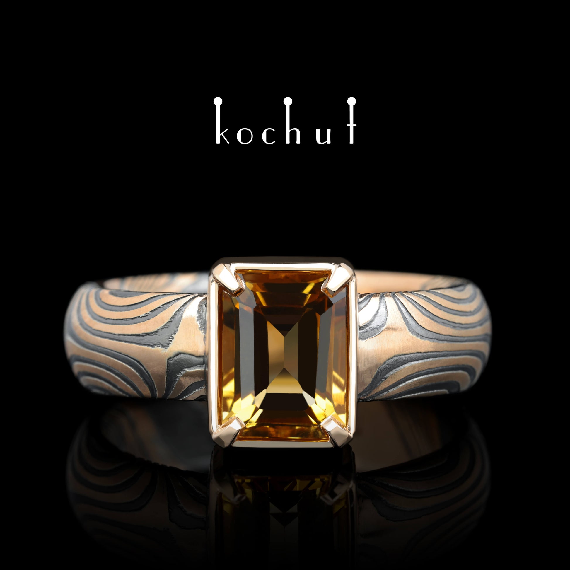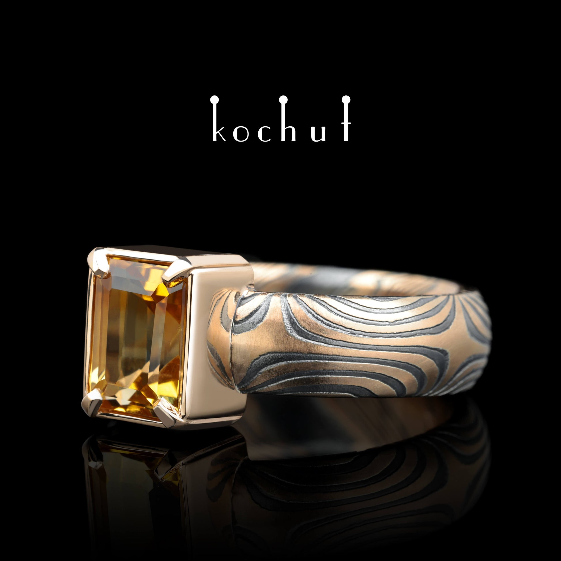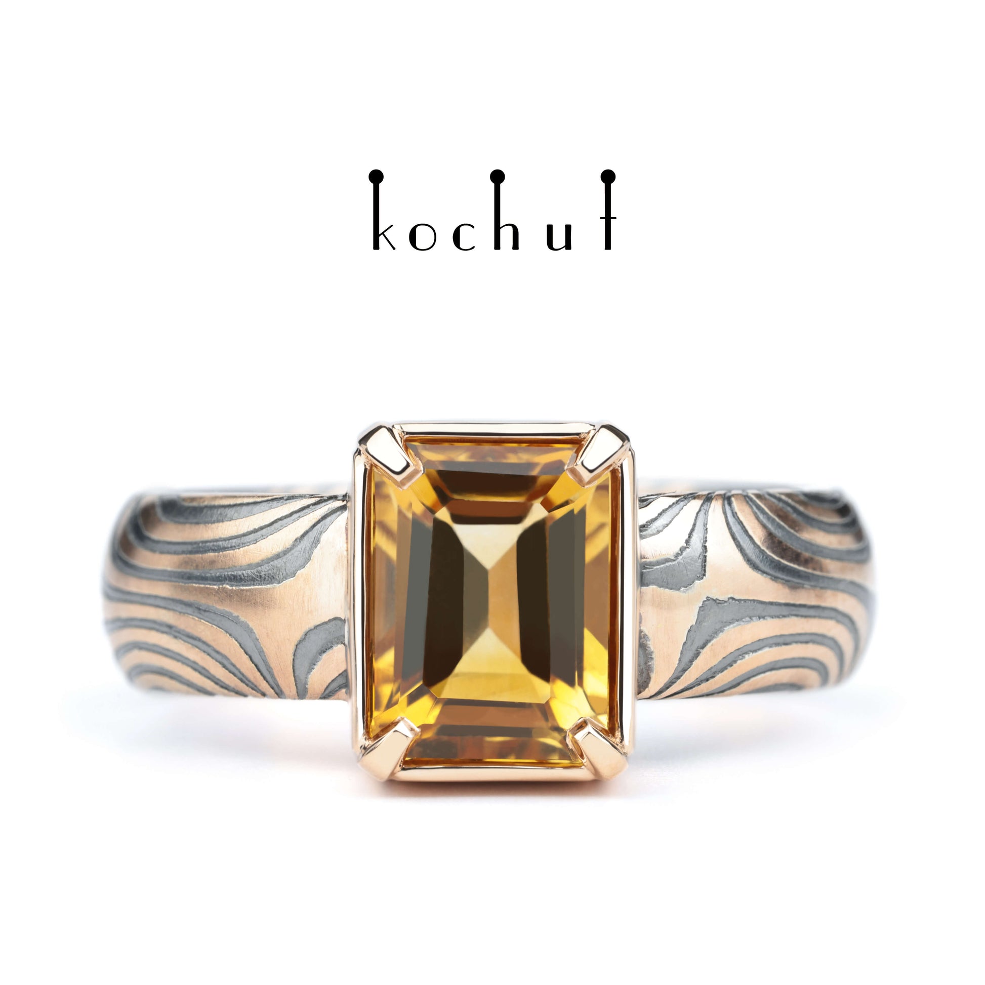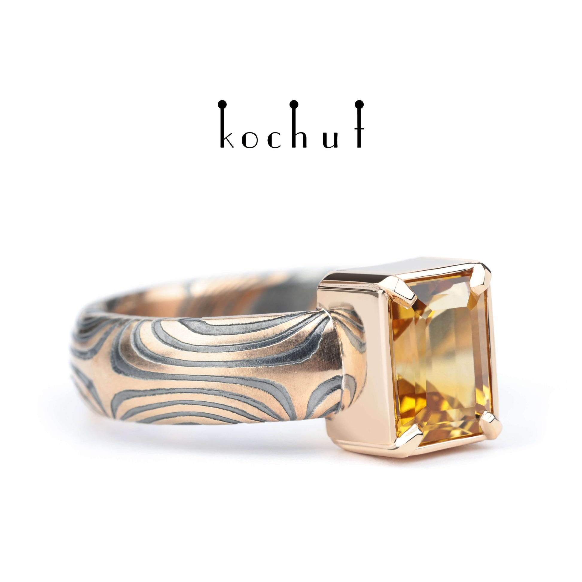 Wertvoller Astrolabium — Mokume-Ring aus oxidiertem, geätztem Silber und Rotgold mit einem Citrin