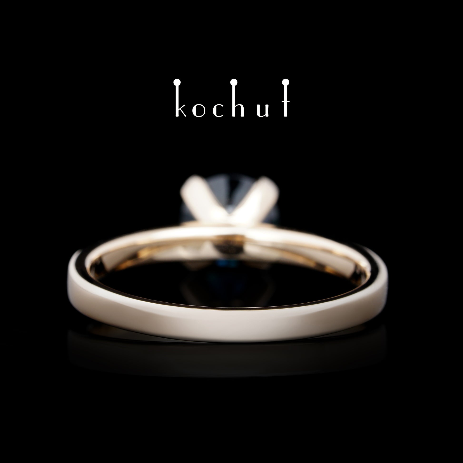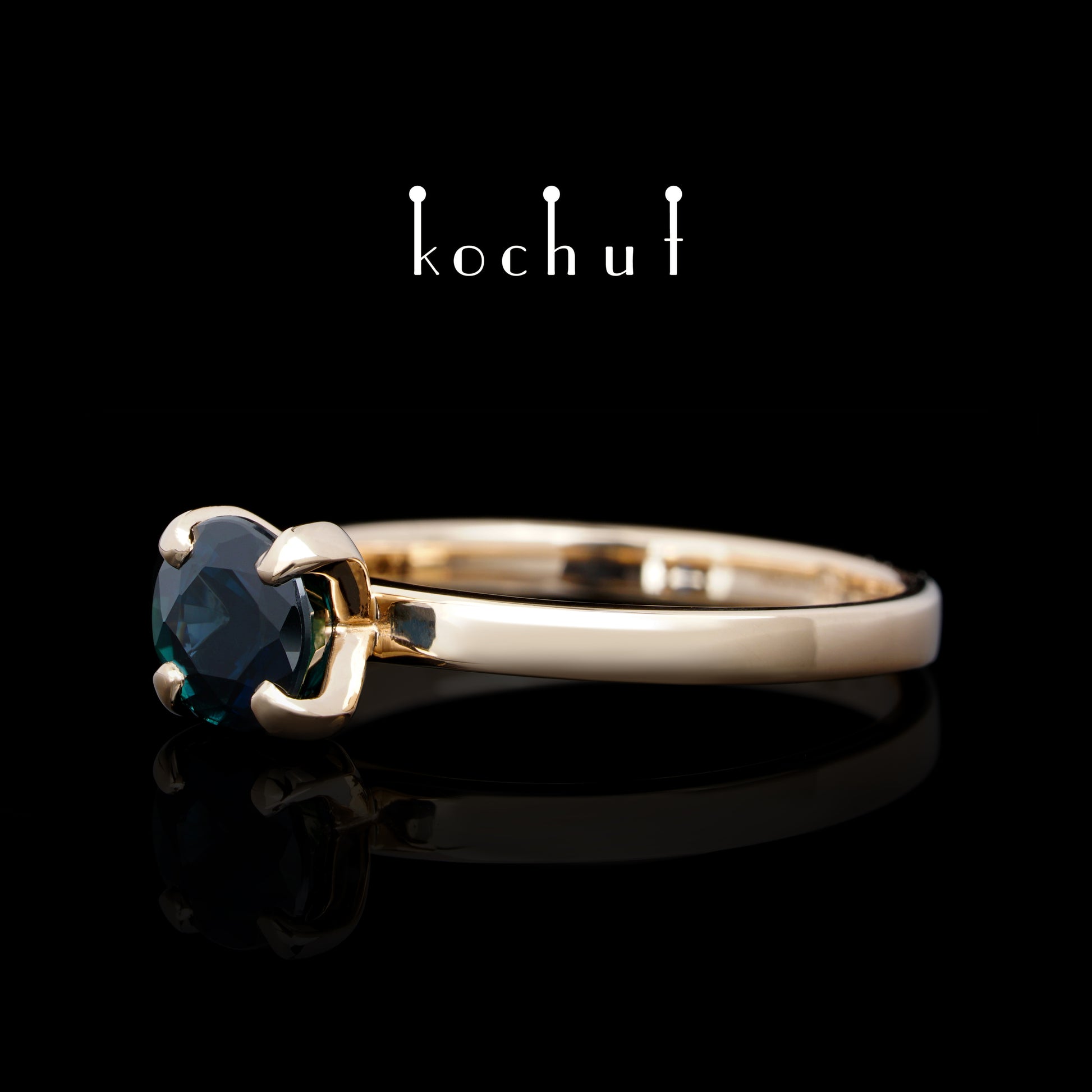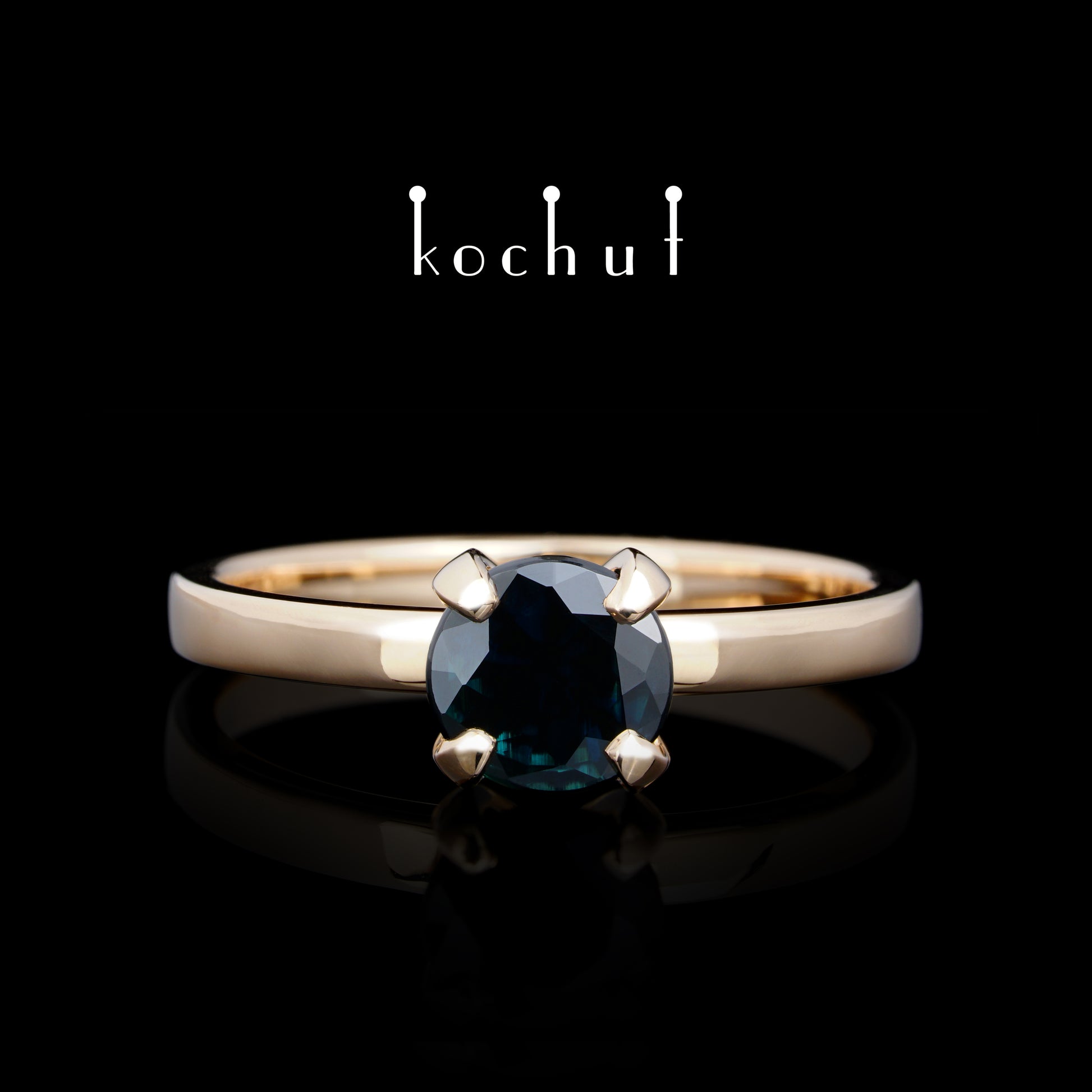 Das Goldfassungs des Rings hält einen australischen Saphir in tiefblauer Farbe — die Marineaugen der Liebe und Hingabe.