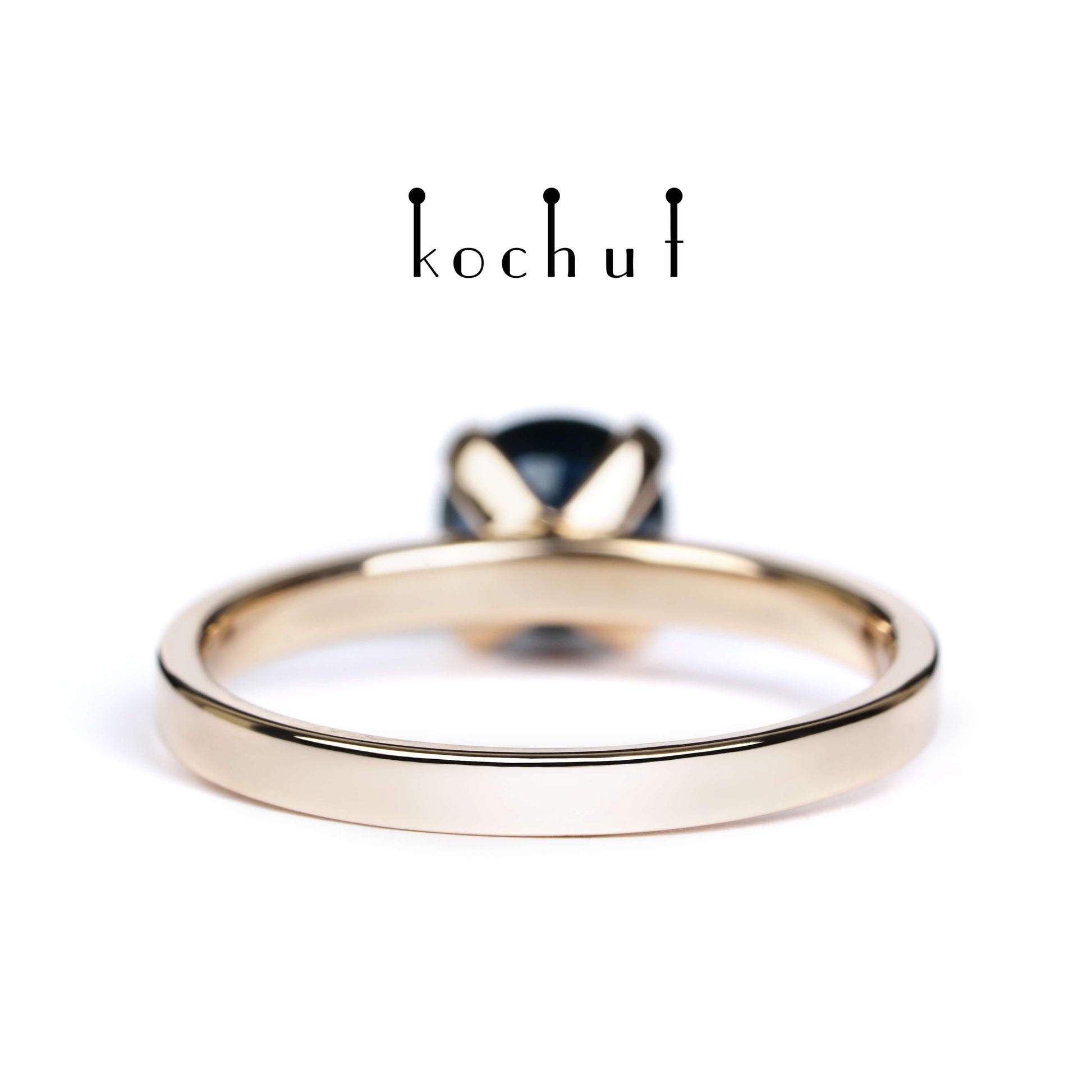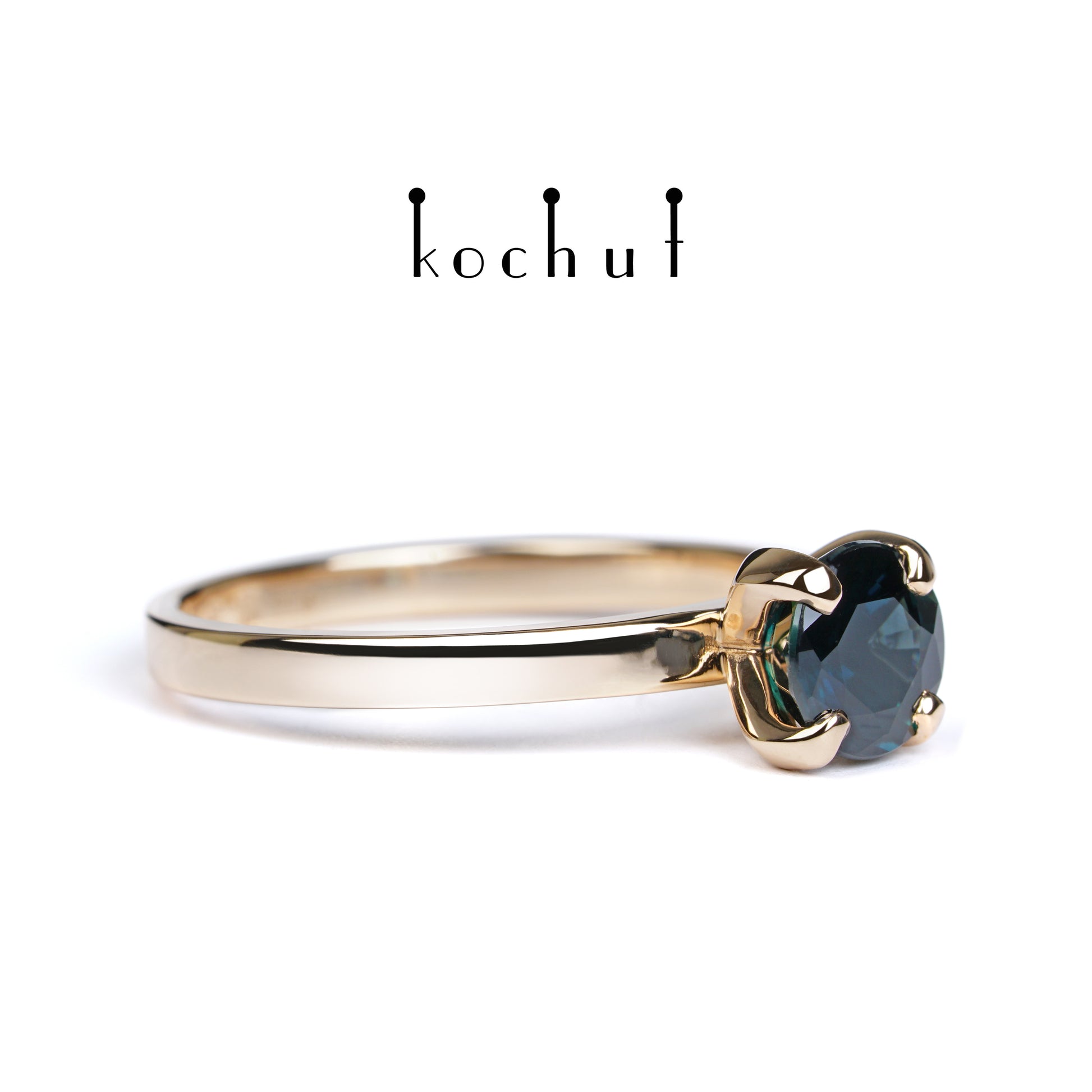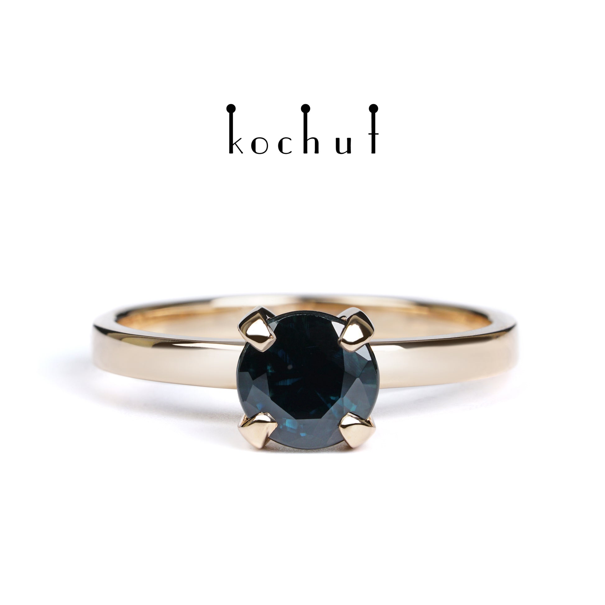 Das Goldfassungs des Rings hält einen australischen Saphir in tiefblauer Farbe — die Marineaugen der Liebe und Hingabe.